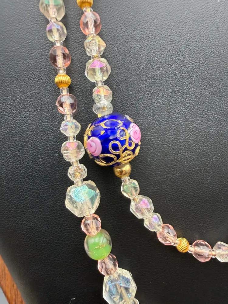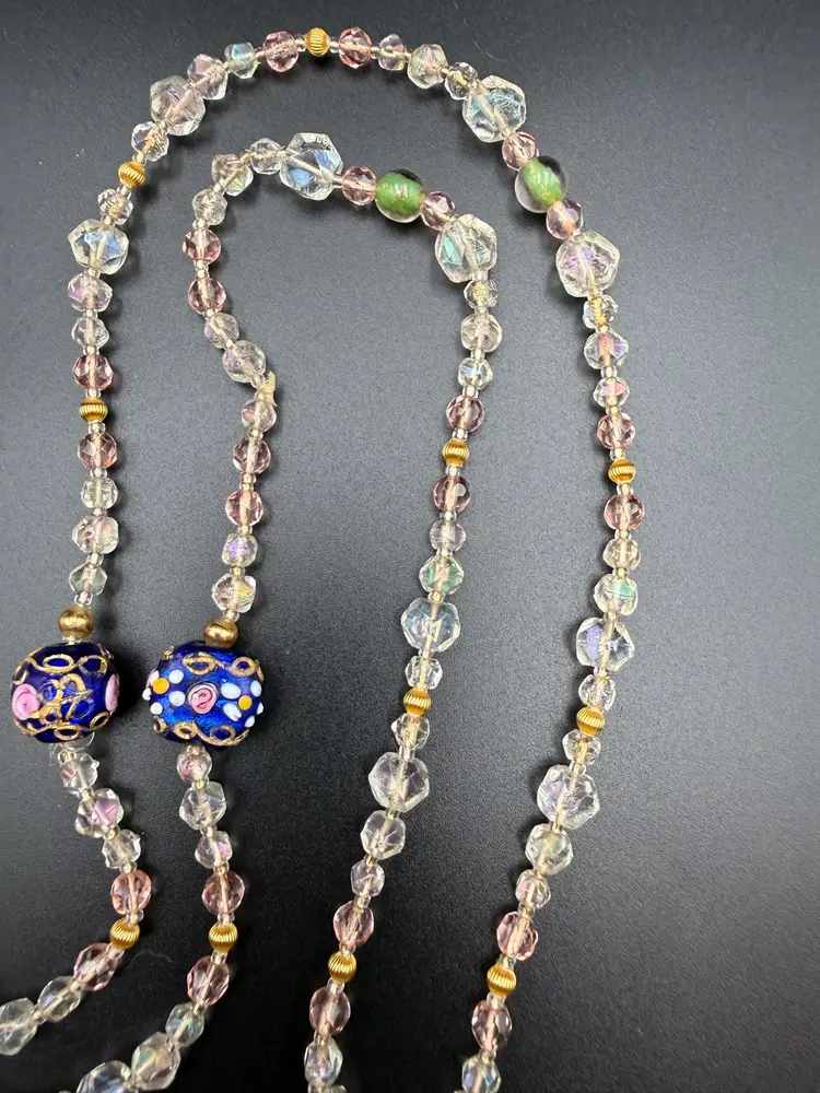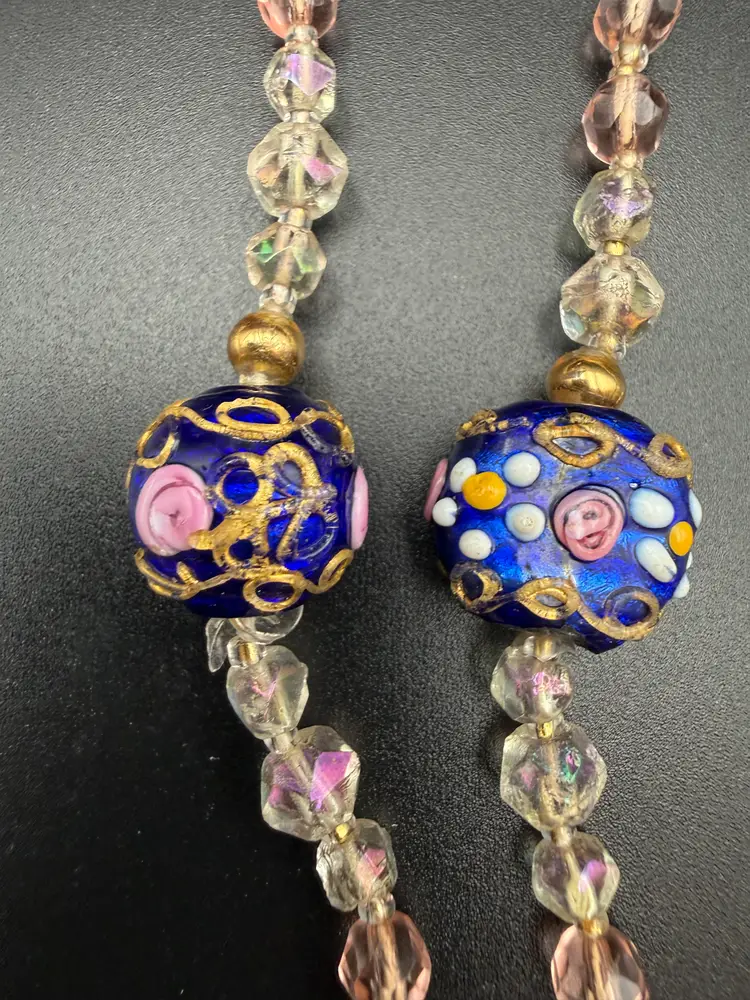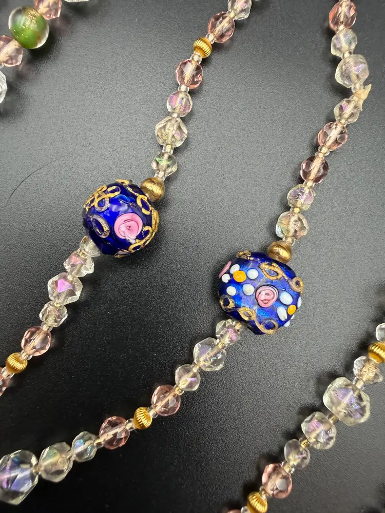 • Faceted aurora borealis clear glass beads with beautiful rainbow flash • Soft blush pink glass accents • Gold-tone ribbed spacer beads throughout • Two bold cobalt blue Murano-style art glass beads with raised floral and swirl detailing • Classic long opera length – perfect for layering or wearing doubled