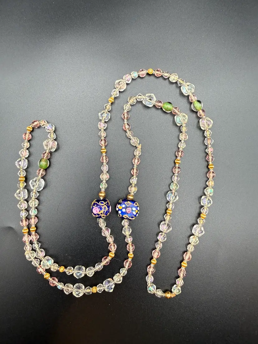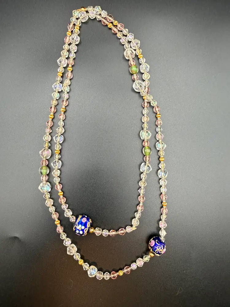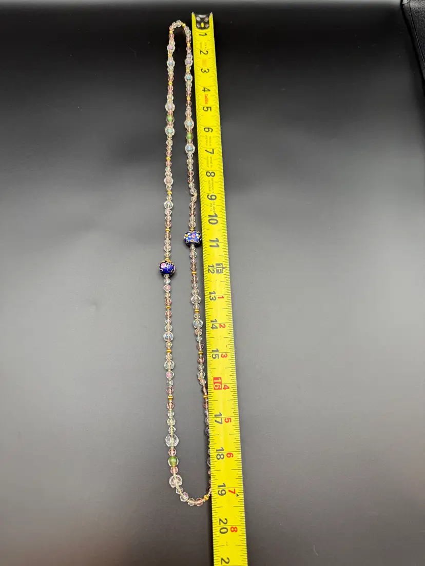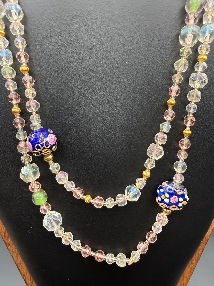 • Faceted aurora borealis clear glass beads with beautiful rainbow flash • Soft blush pink glass accents • Gold-tone ribbed spacer beads throughout • Two bold cobalt blue Murano-style art glass beads with raised floral and swirl detailing • Classic long opera length – perfect for layering or wearing doubled
