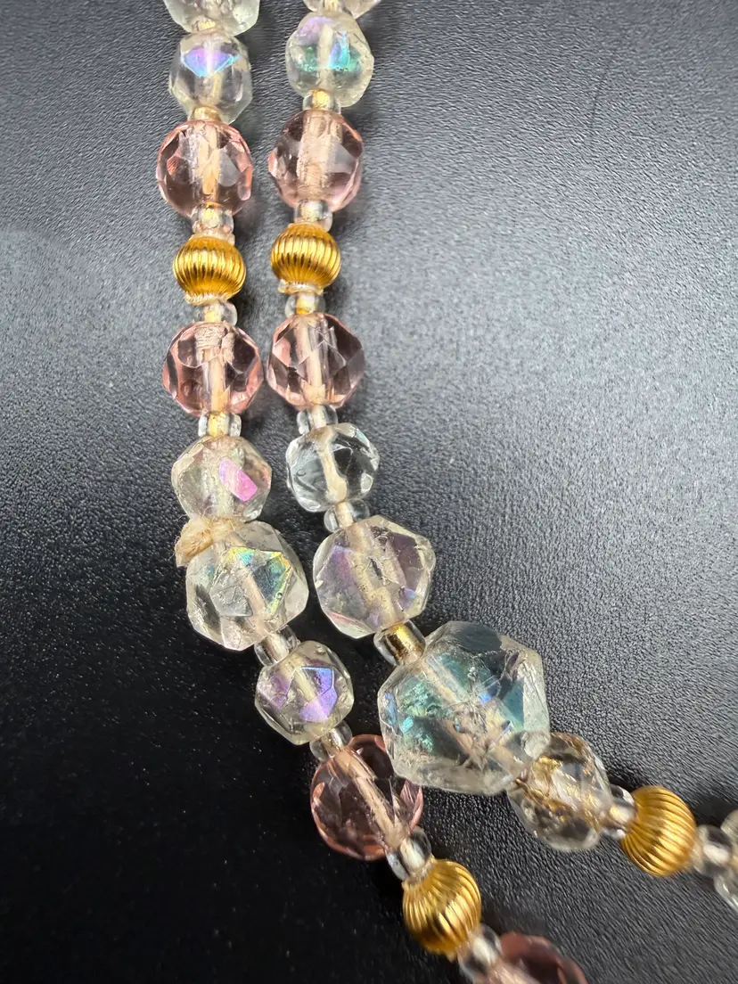 Likely 1960s–1970s inspired styling. The wedding cake aurora borealis beads and Murano-style focal beads are consistent with mid-century costume jewelry trends.