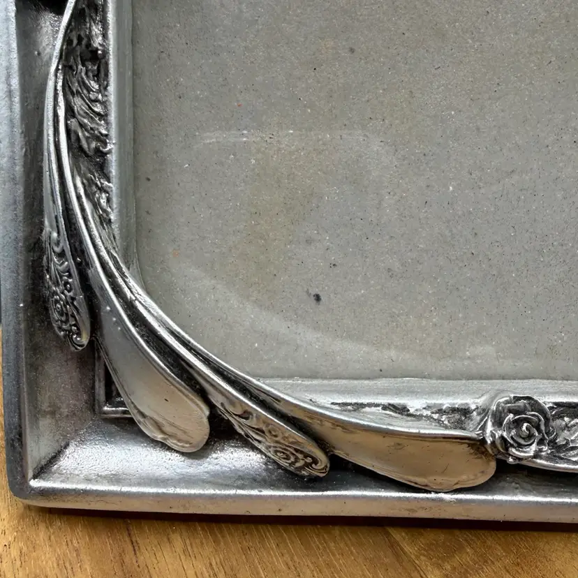 Art Nouveau era with its flowing, organic lines and intricate raised floral motifs. The frame features multiple embossed rose clusters and a delicate ribbon-like border, finished in a metallic silver tone that gives it a classic pewter look