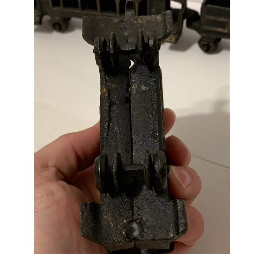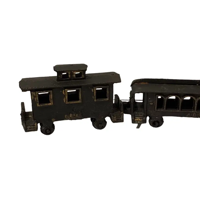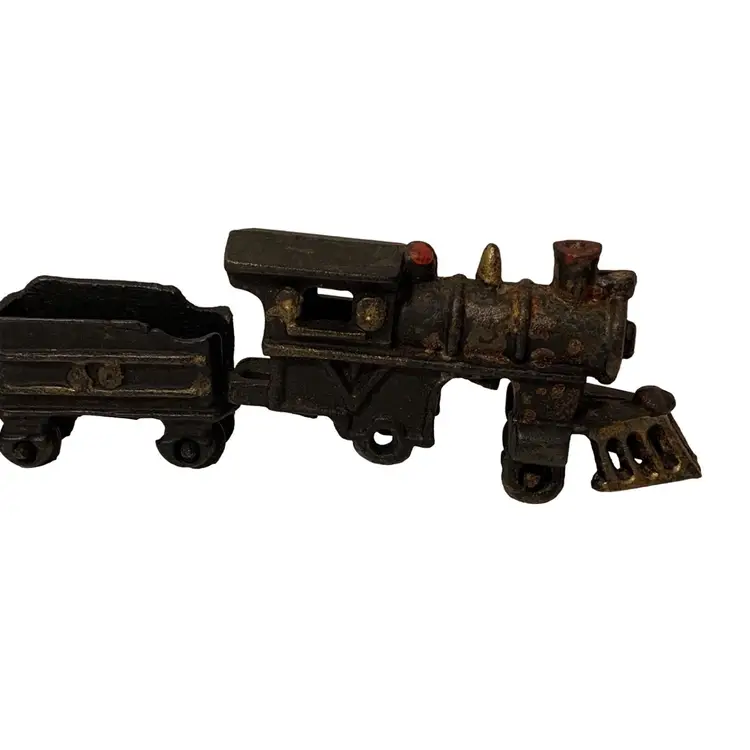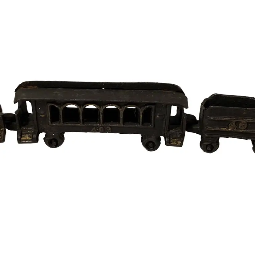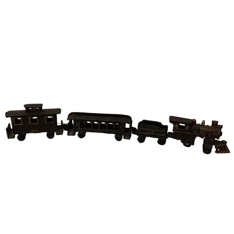 I believe it dates to the 40s or 50s. Hard to find with all 4 pieces. The engine car is missing the back wheels. There appears to be a connection missing between the engine and the coal car. Sold as is!