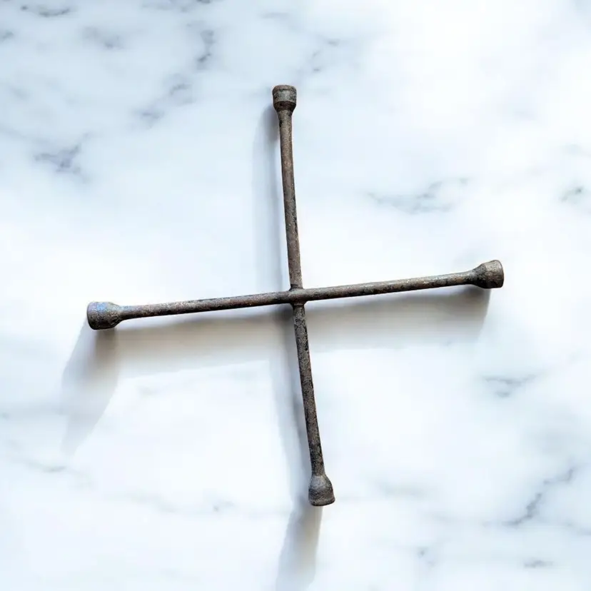 This is a vintage 4-way lug nut wrench that can be used on most car models. It features a unique X cross design and is suitable for use with flat tires. The wrench comes in various sizes and is a single item, perfect for those who already have the necessary tools for their car. The product is made of high-quality materials and is a great addition to any automotive tool collection.