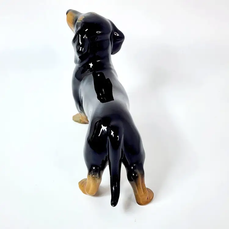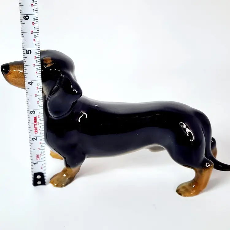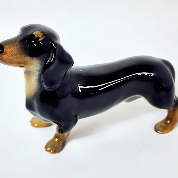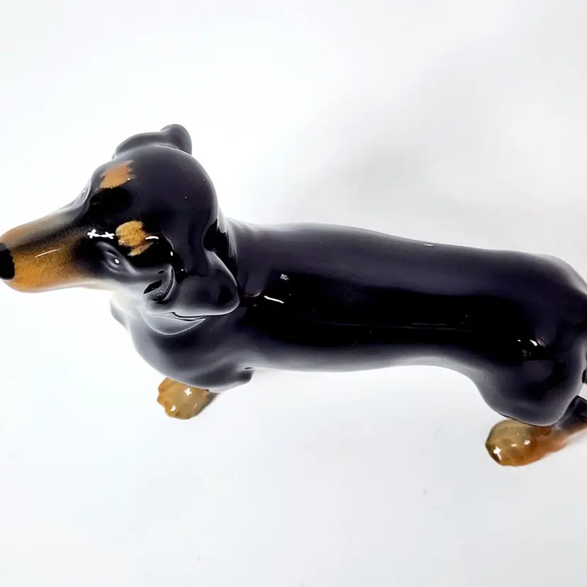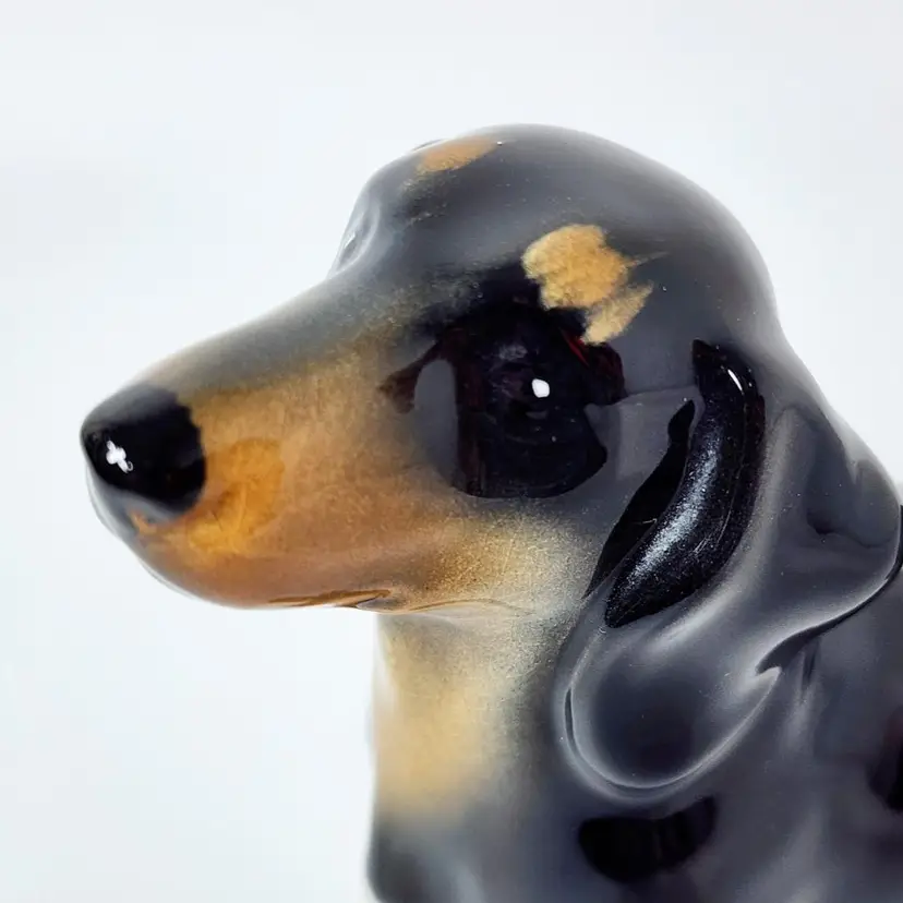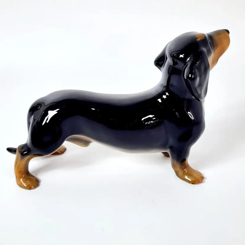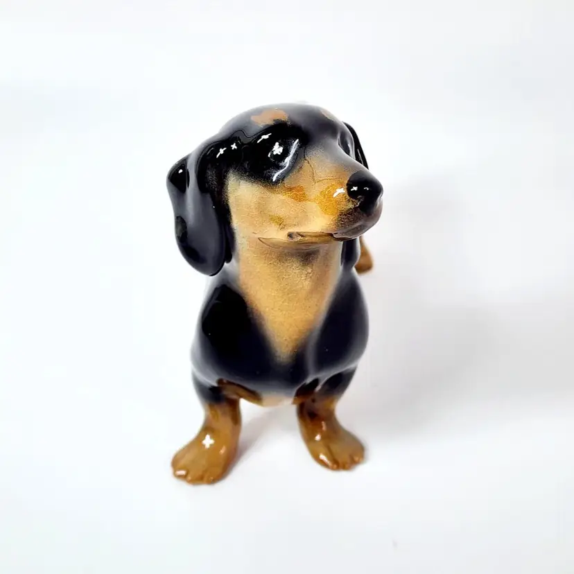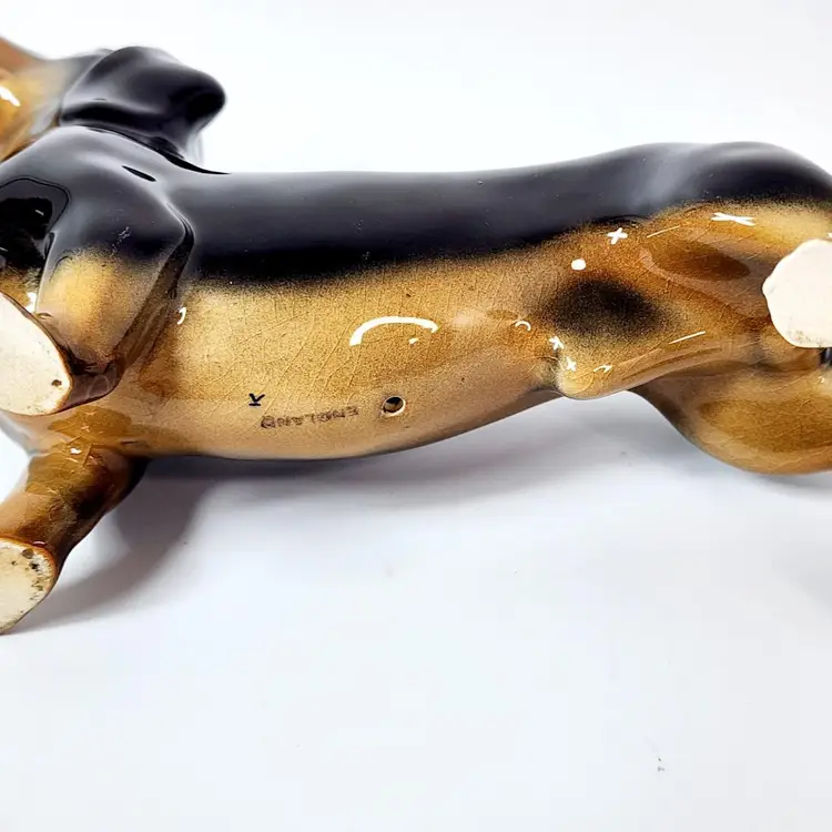Vintage probably 40's dachshund dog figurine - hand painted and glossy glazed, marked England. Both Beswick and Royal Doulton made the same figurine but I am not sure if this is any of the two. There is a model number that I cannot read. Measurements: 5" tall, 8" long. Condition: very good, no chips or cracks. Crazing in the glaze due to age.