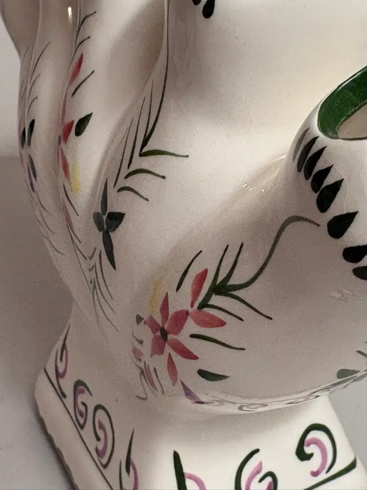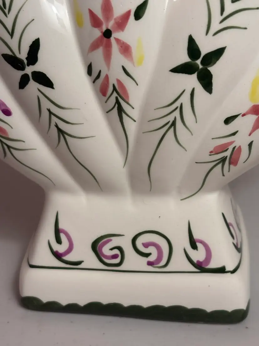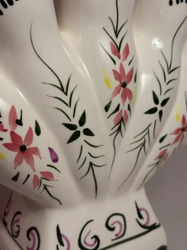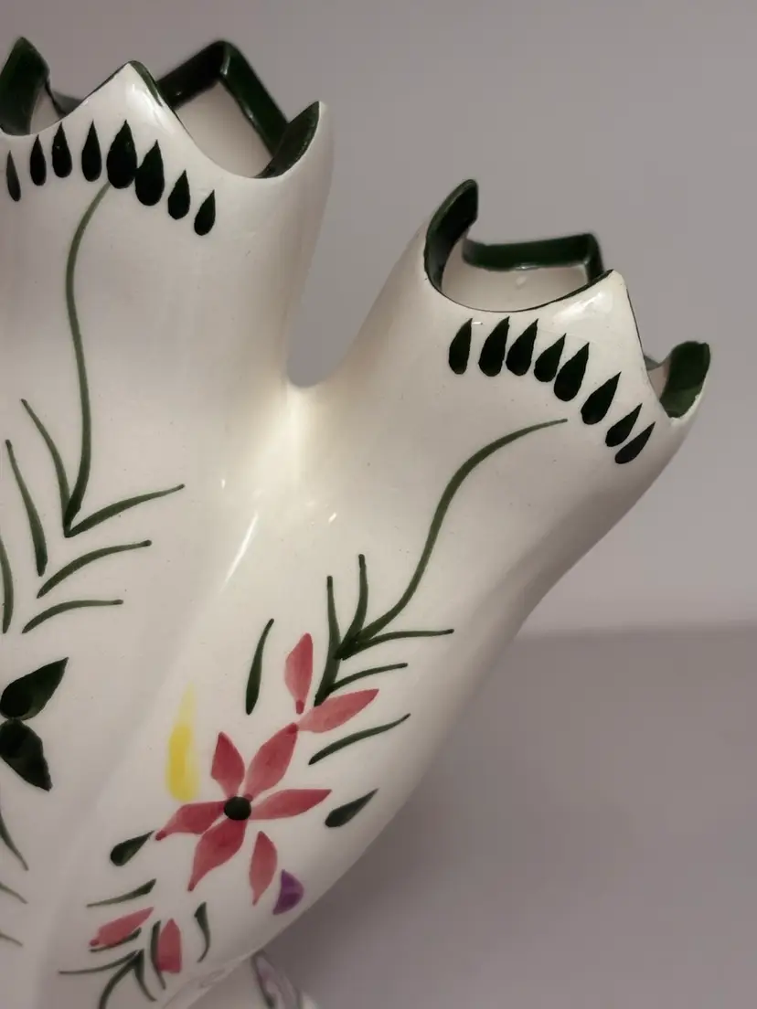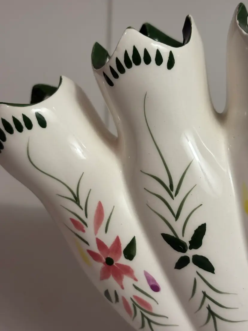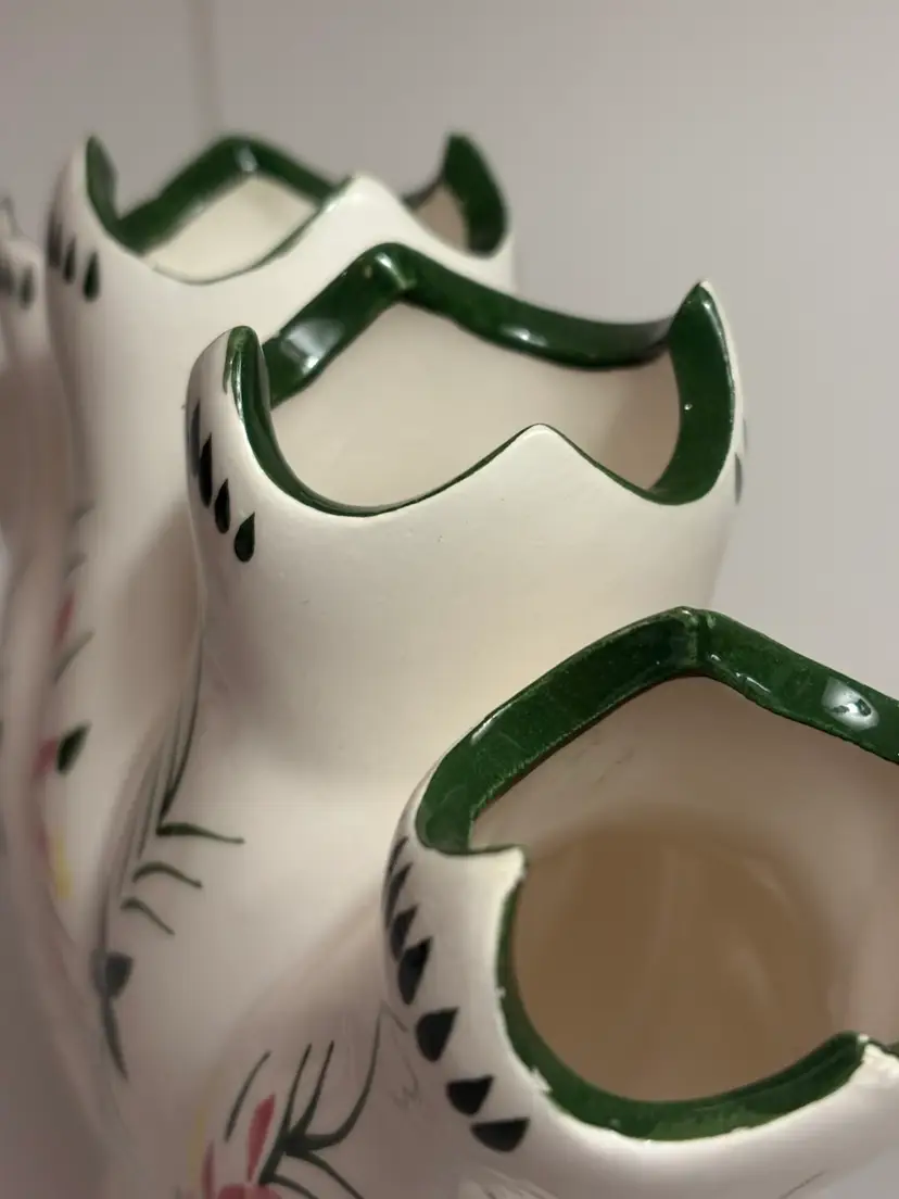 This Vintage 5 Finger Bud Flower Vase is a charming piece of decorative collectible that features a unique blue ridge style glaze. Made of ceramic with a glazed finish, this vase showcases intricate details and a multicolor design that adds a touch of vintage flair to any space. Perfect for displaying vibrant flowers or serving as a standalone decorative accent, this vase is a lovely addition to any collection.