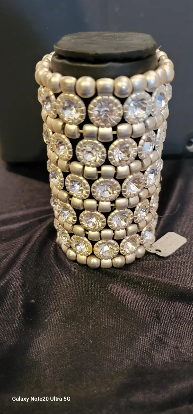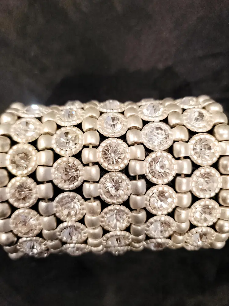 This silvertone big bold stretch bracelet is a statement piece. The large Rhinestones glisten against the mat silvertone metal shapes that make up this piece. Measuring at almost 6 1/4 inches it will be the talk of the town. Dressing up or casual, this one fits the bill.