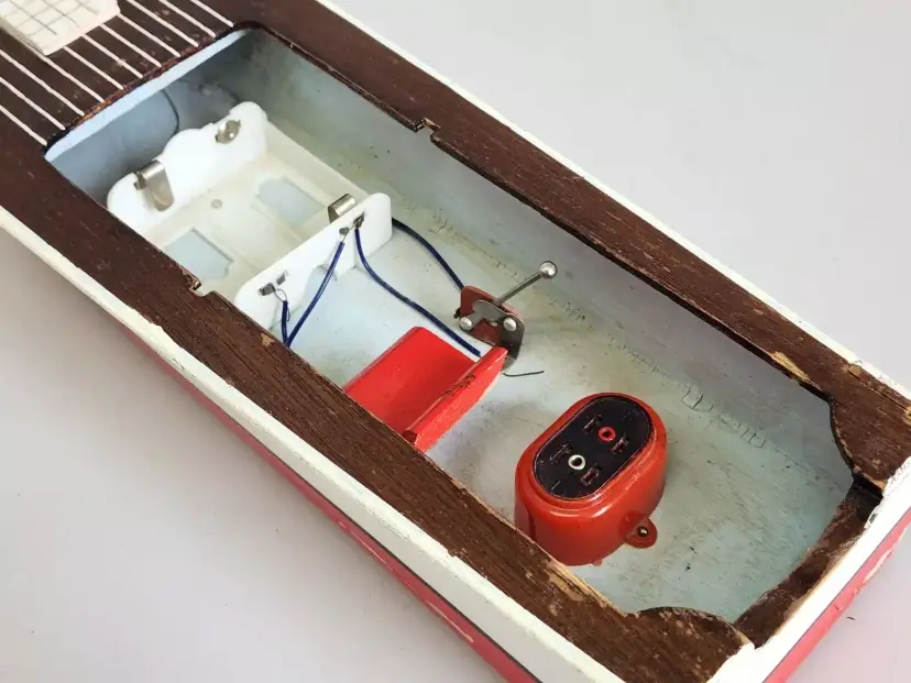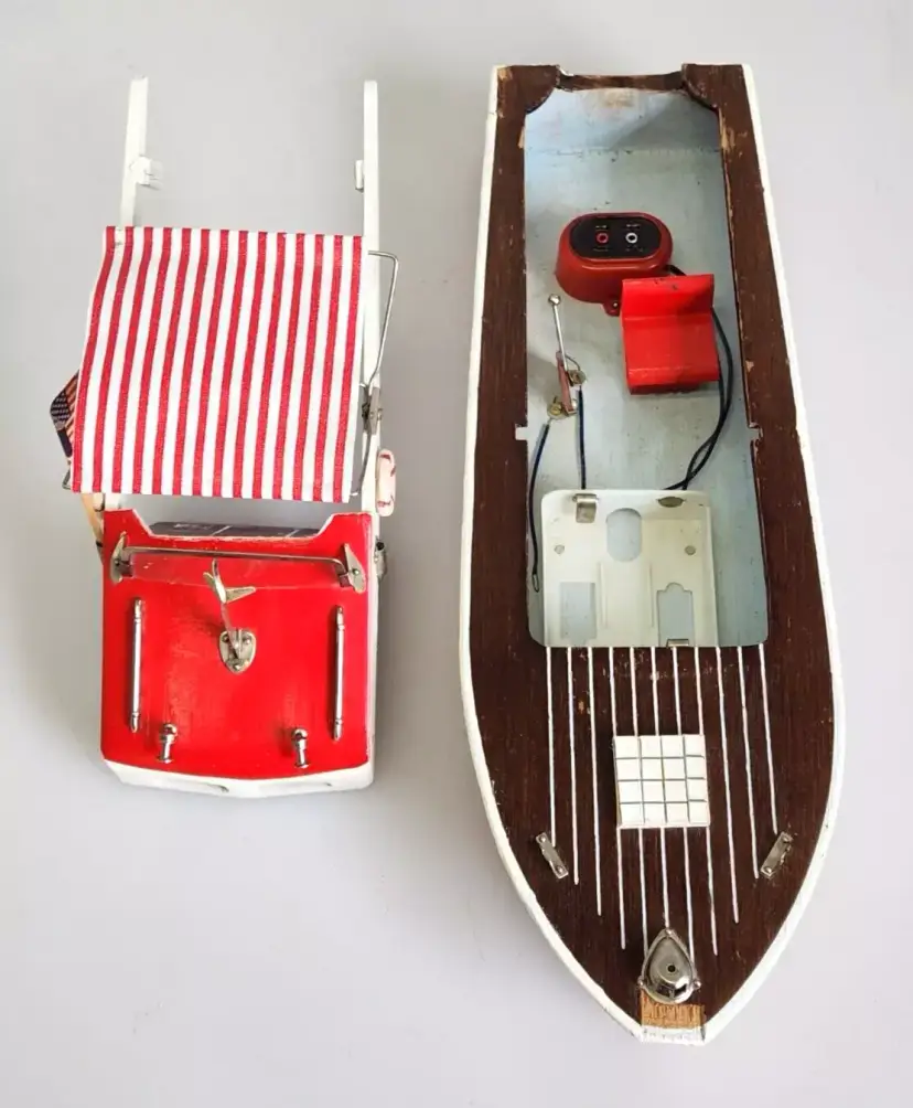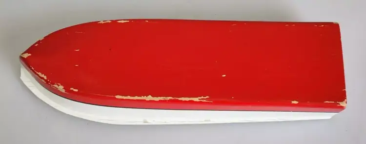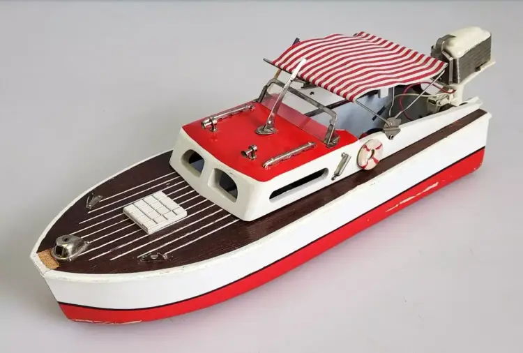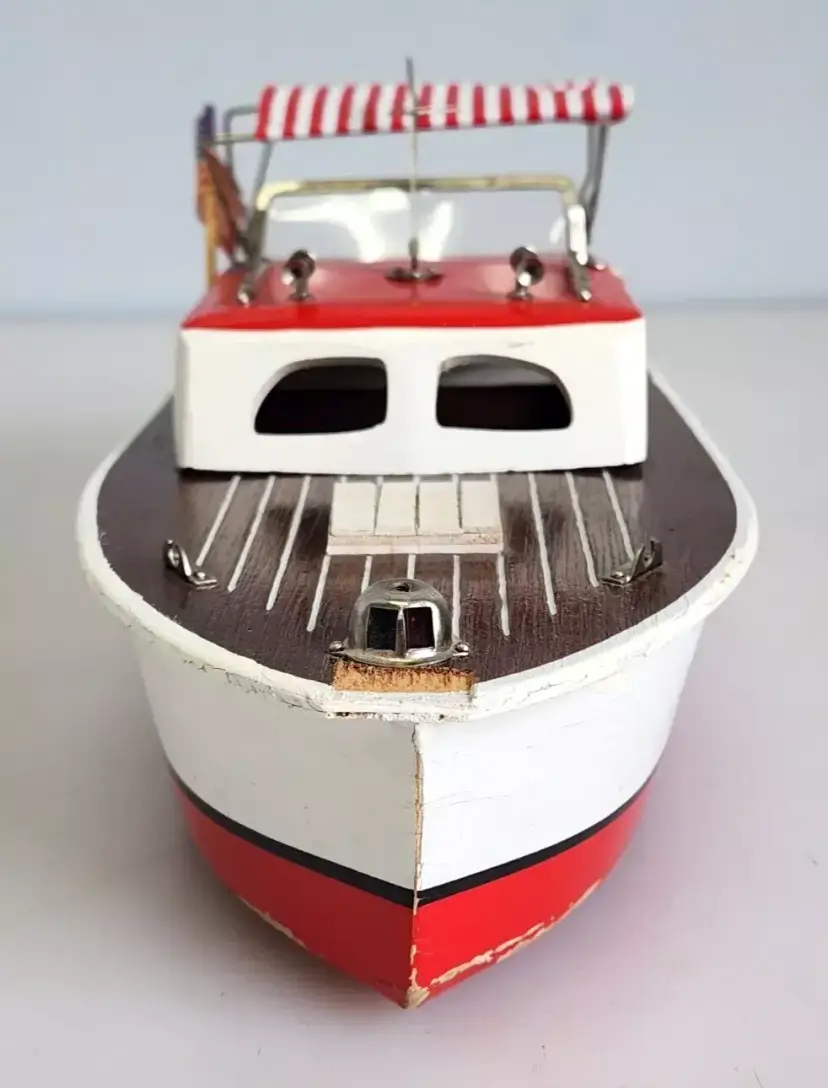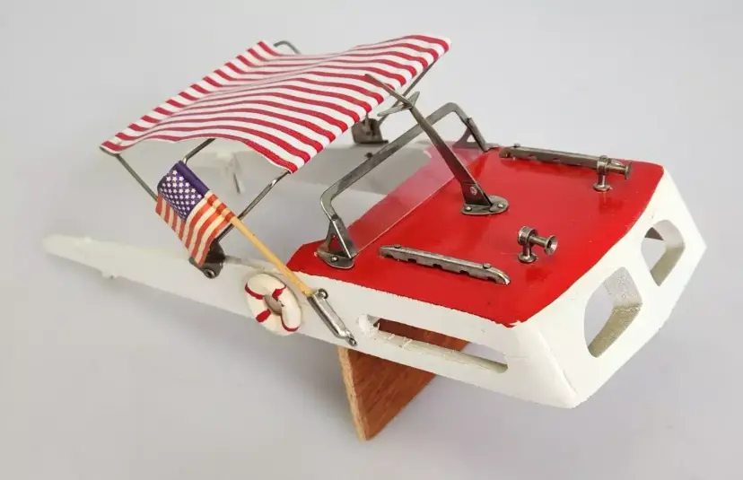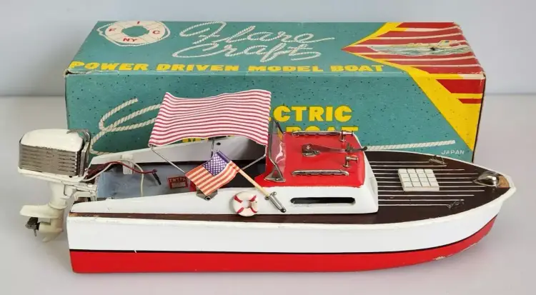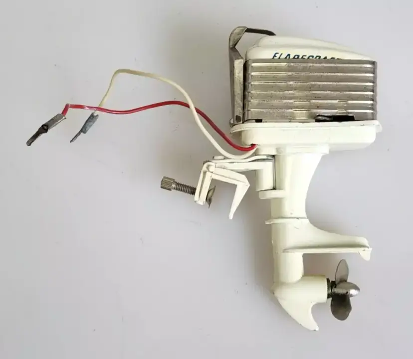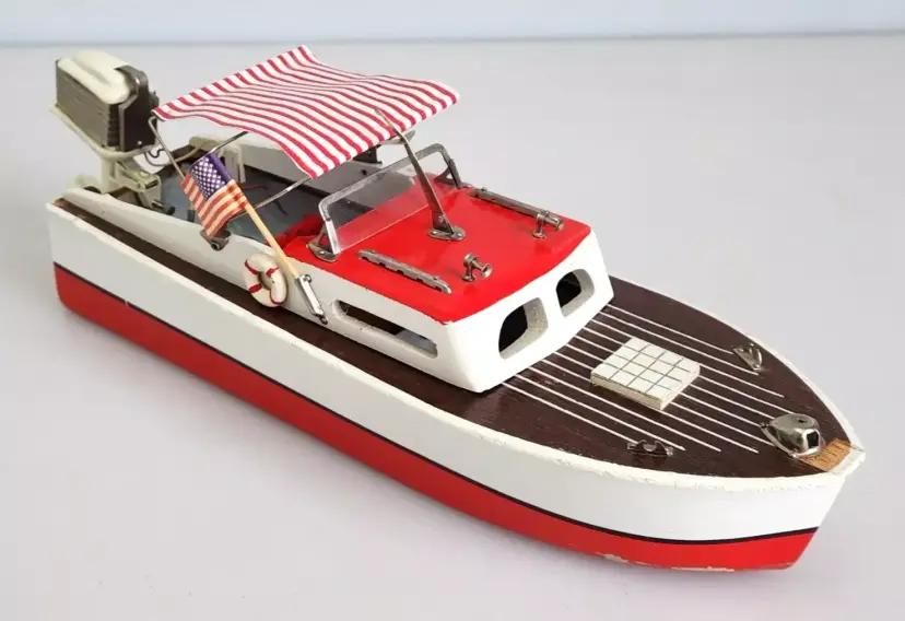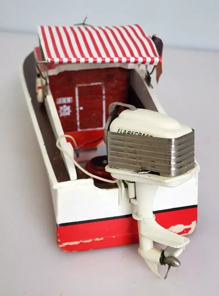 Vintage 50's Flare Craft Electric Wooden Model Toy Boat 13" Japan w/ Box Rare Boat measures approx. 13" (L) x 4.5" (W) x 3.75" (H) Features a battery powered metal outboard motor Item is untested and is being sold as-is for parts or repair only. It is unknown if any pieces are missing. The motor shroud is loose. There are are a few small cracks, chips, scuffs and dust due to previous use. The box lid is torn one one end, has a hole in the top, and has various scuffs or stains due to storage wear. Includes only items pictured. Please view photos for more detail. Thank you