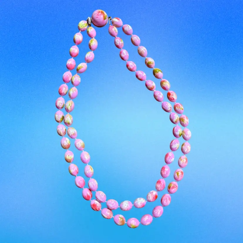 Longest strand is 20”, shorter strand is 19”. 1950’s era statement necklace! Beads are bright pink and are splattered with white, red & green. Clasp has a large decorative bead detail and works just fine. Pretty lightweight.