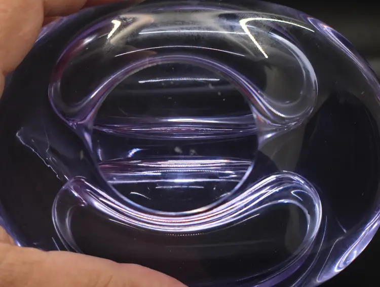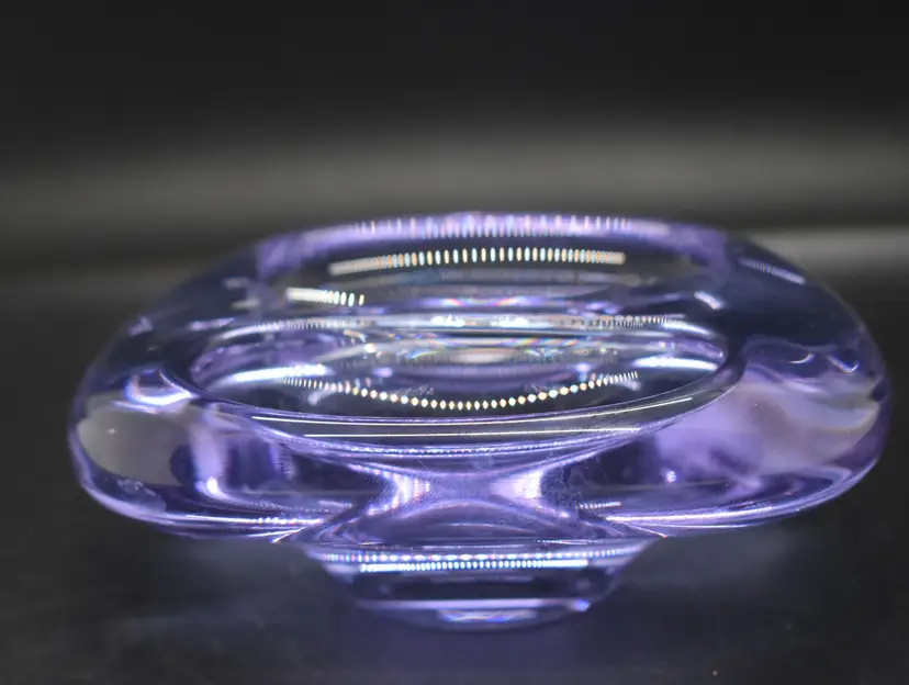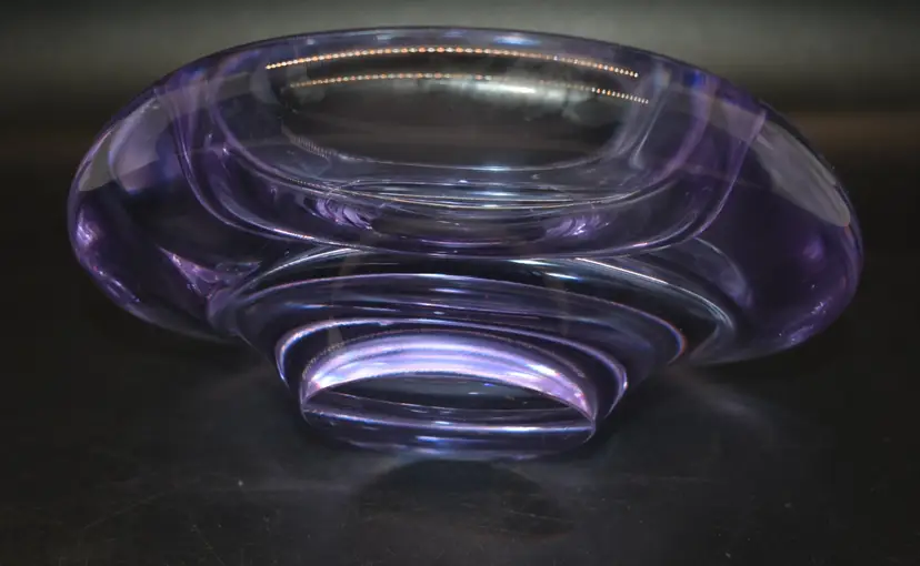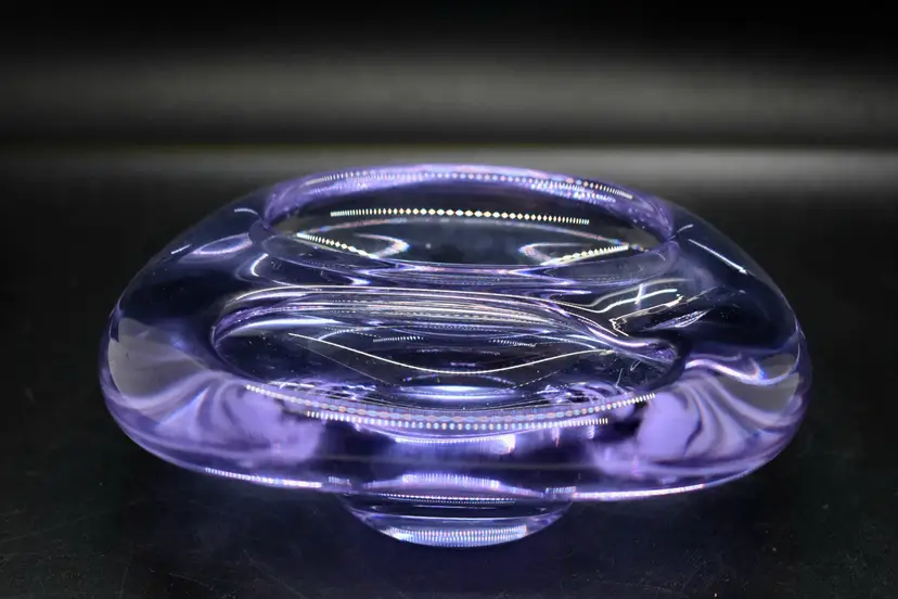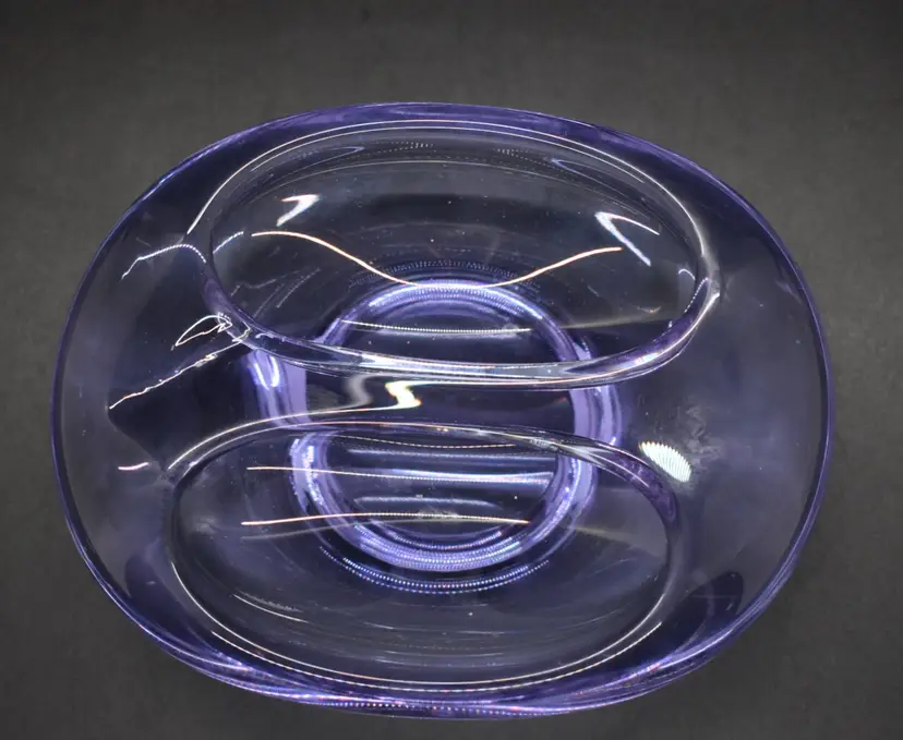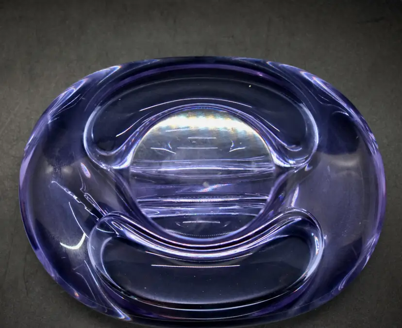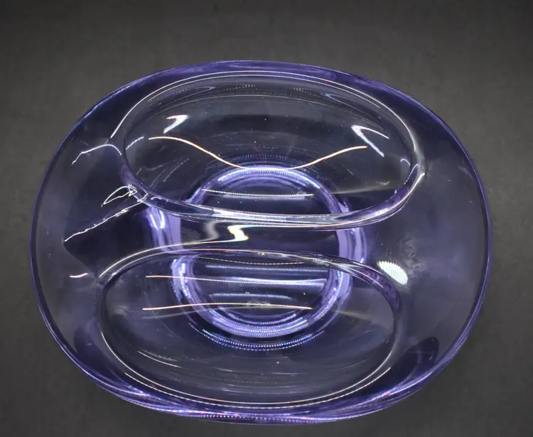 This beautiful vintage candy dish is a must-have for any mid-century modern art glass collector. The dish is hand-blown with a glossy finish and features a solid pattern in shades of purple and blue. Measuring 5 inches in length and 1.5 inches in height and depth, this abstract-shaped dish is perfect for displaying on a shelf or storing candies or other small items.