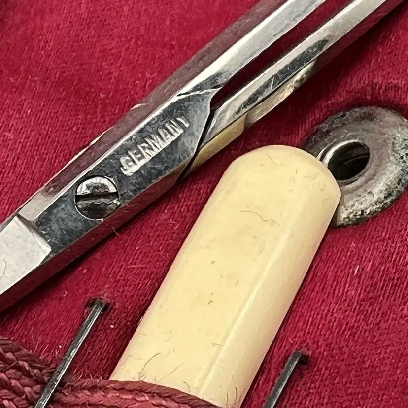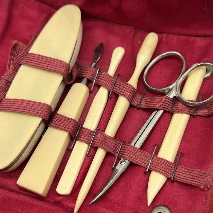 Vintage 5pc MANICURE SET Fabric Roll Up Case Celluloid Pieces 1920s Germany