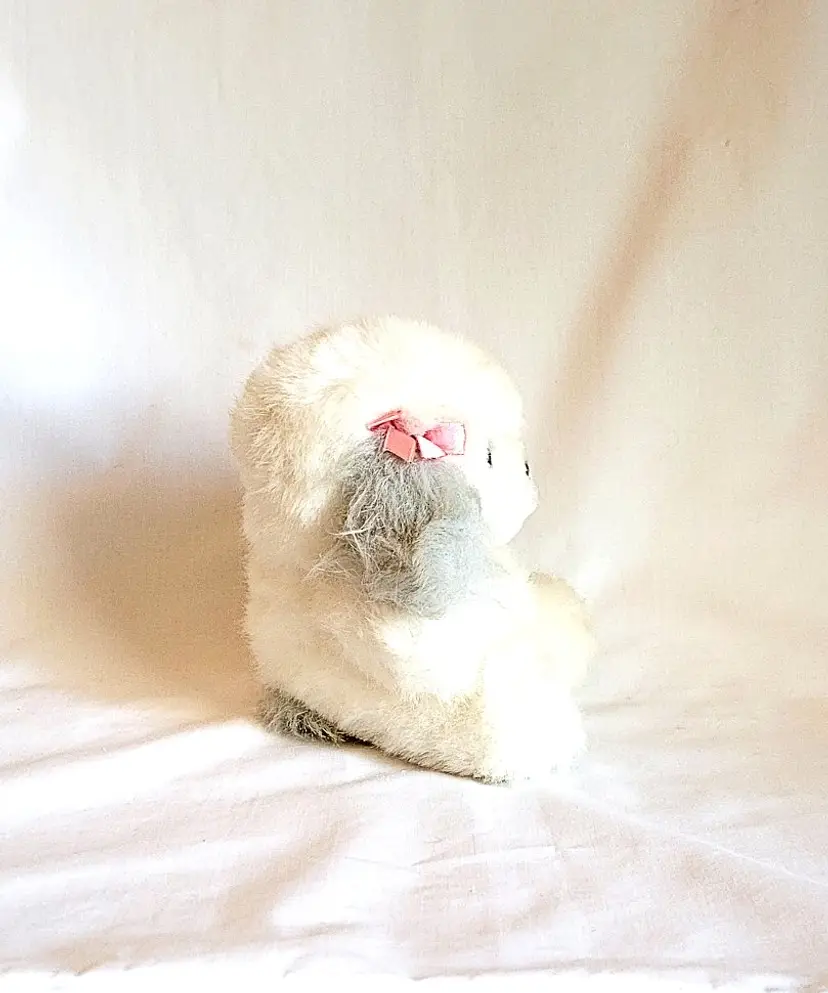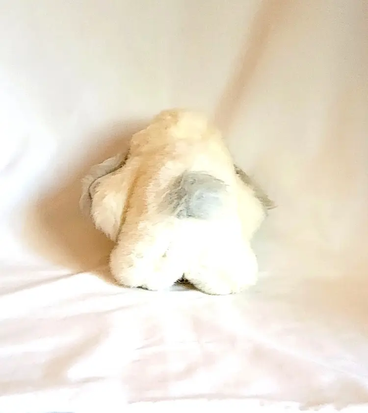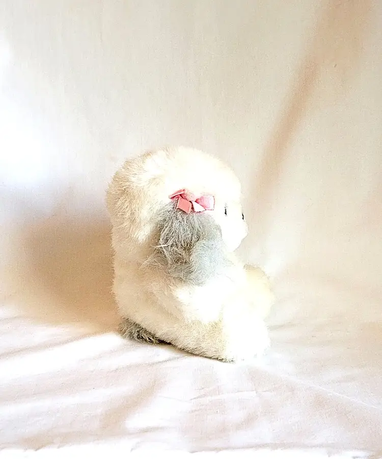 This sweet little plush puppy stands about 6 inches tall. It has fluffy white fur with soft gray contrast on the ears and tail. It features two small pink satin bows on its ears and a cute black button nose.
