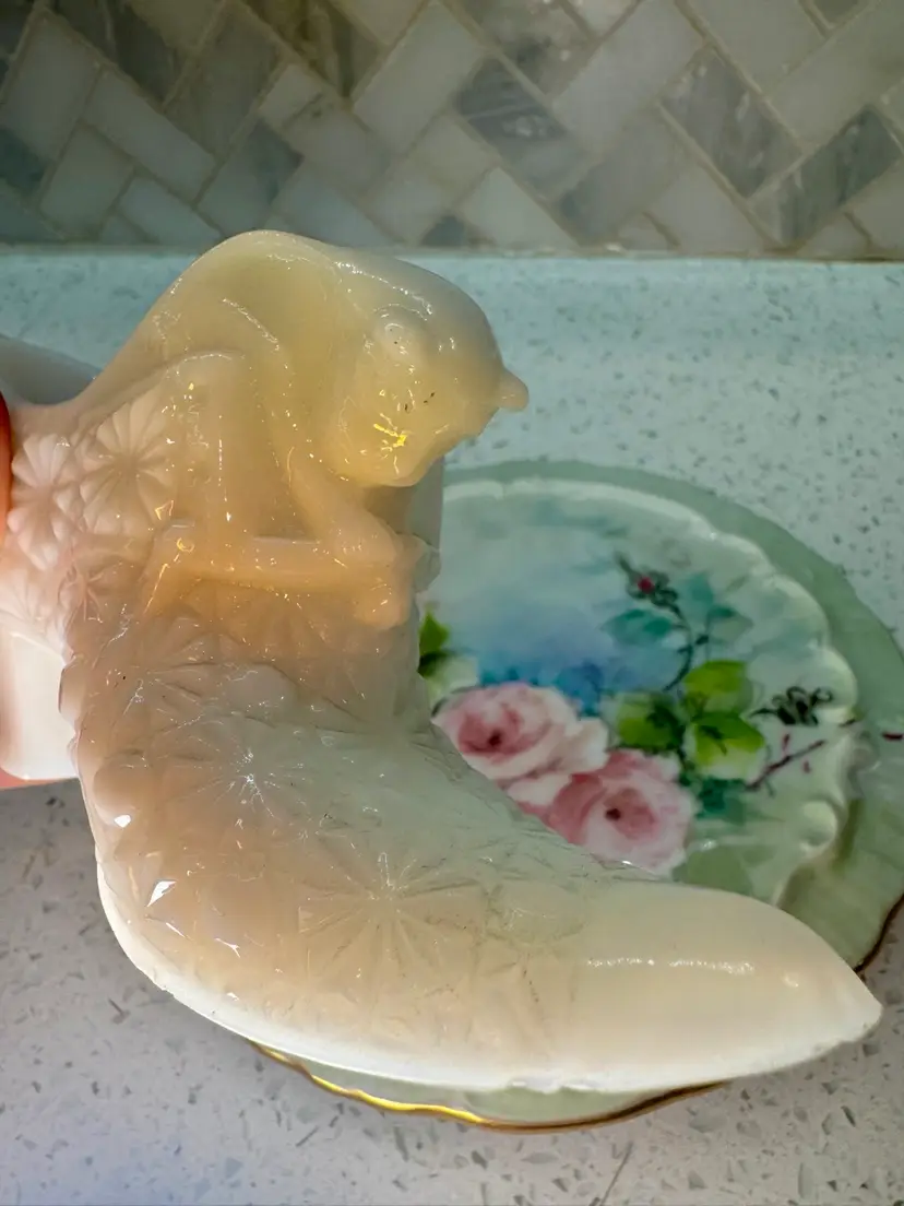 Vintage 6” wide 2.75” tall Fenton Art Glass Hobnail slipper shoe, milk glass, featuring a cat head design on the toe.