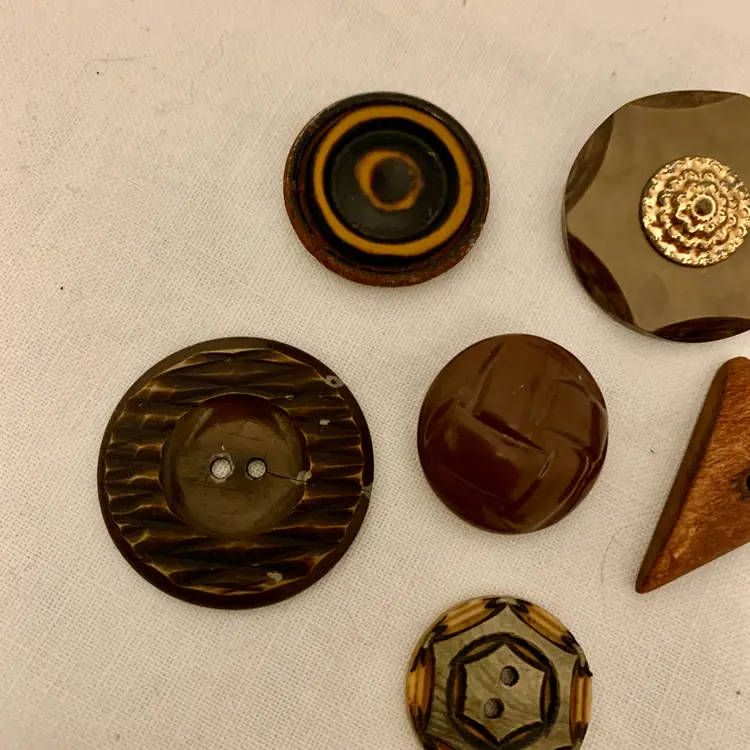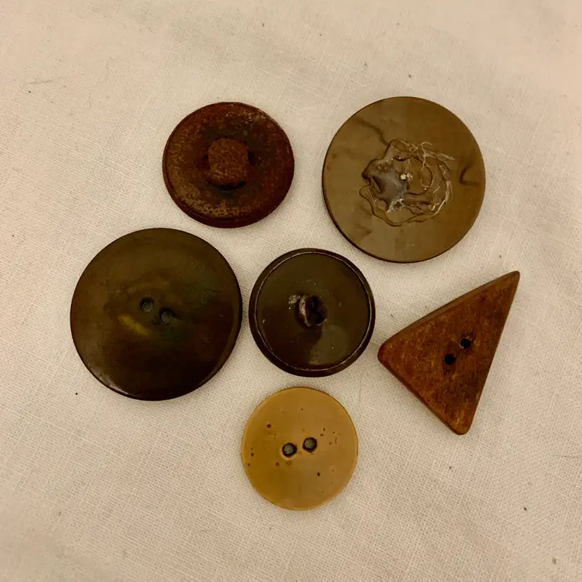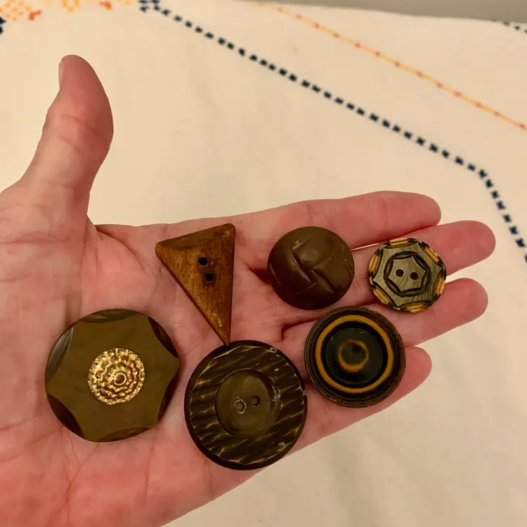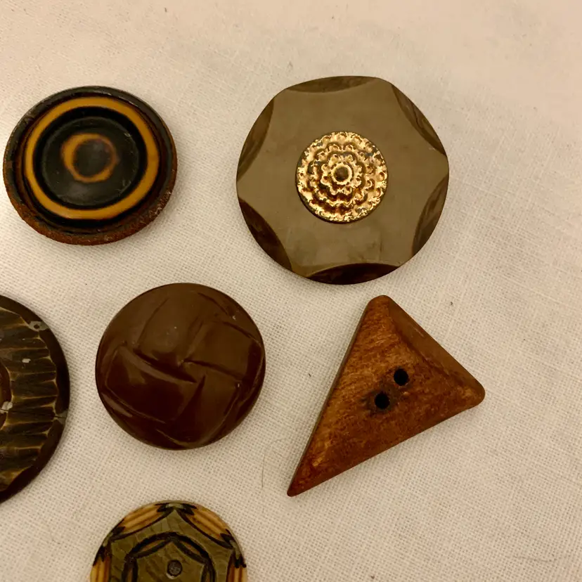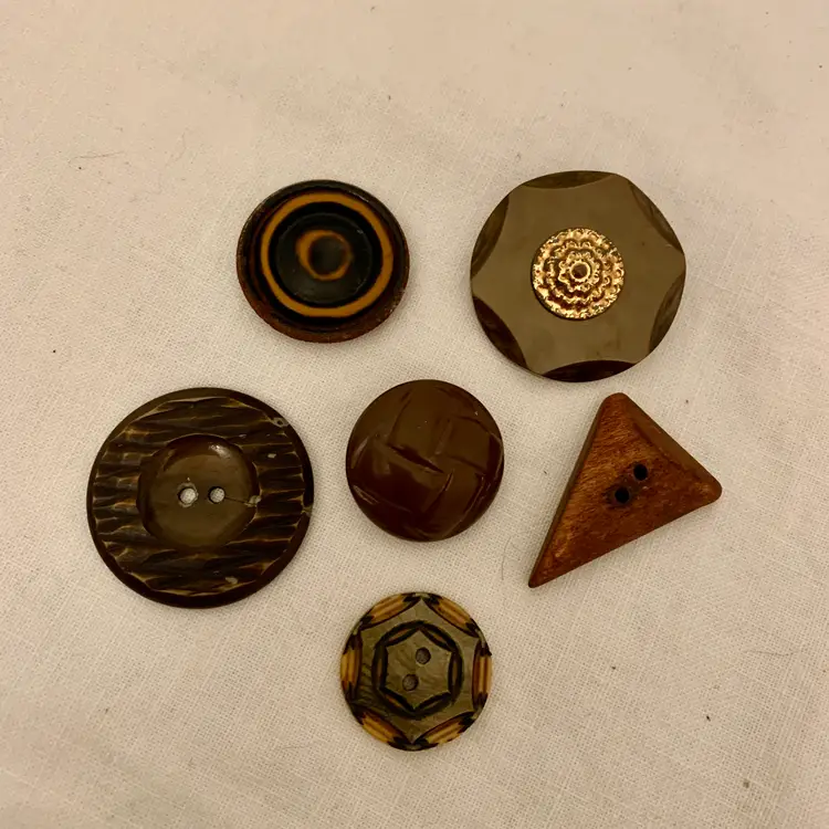 Vintage lot of 6 wood or imitation wood buttons in various shapes and sizes. Era 1950's-1970's. One button has glue residue on back. Guess the person did not know how to sew a button on. Great for collectors, crafters, jewelry makers.
