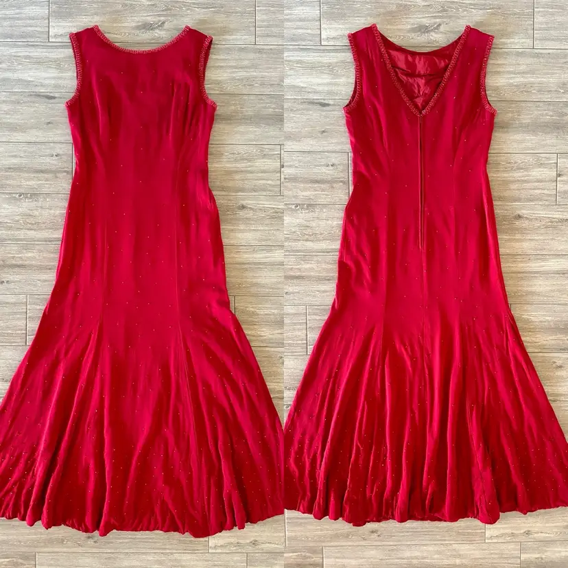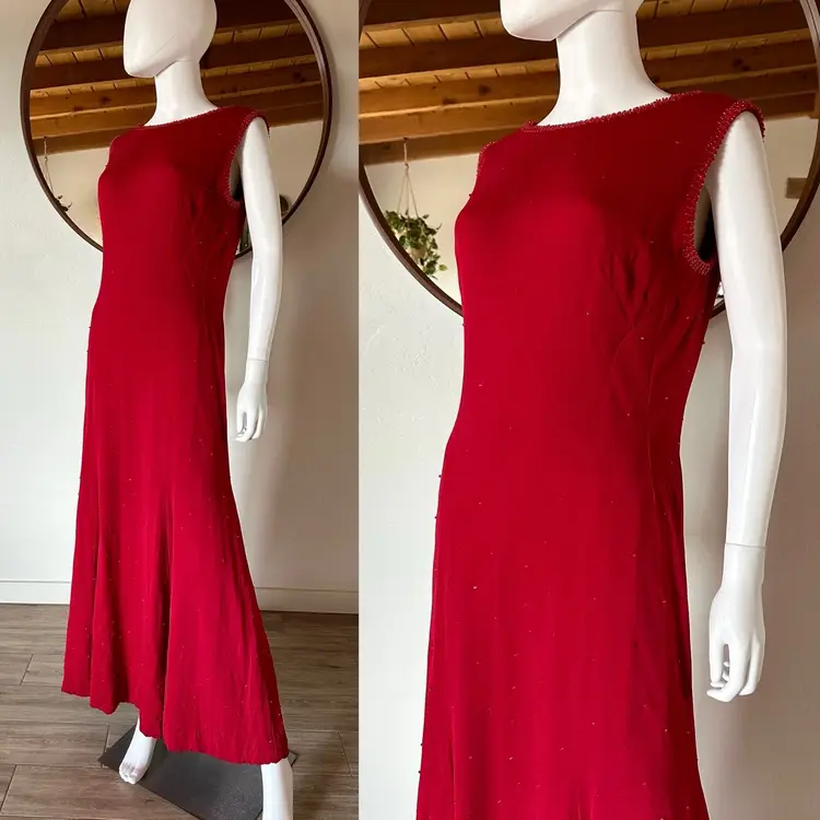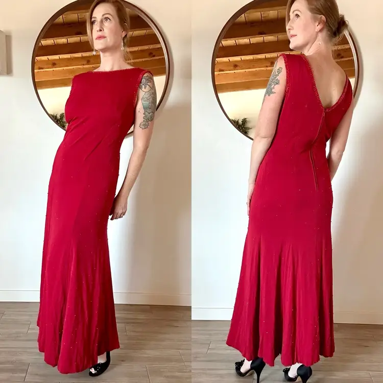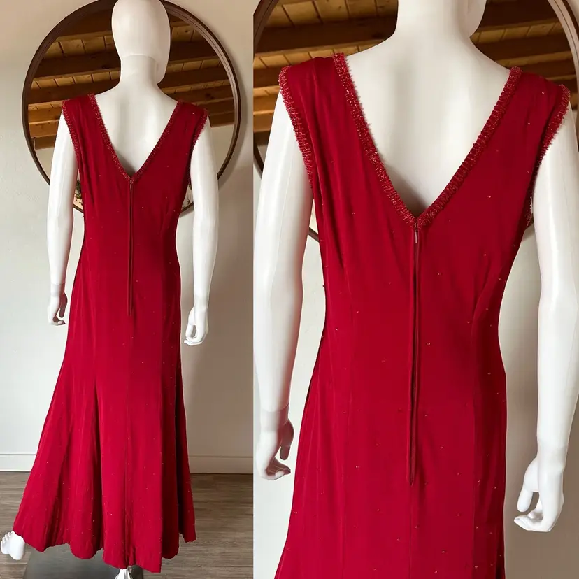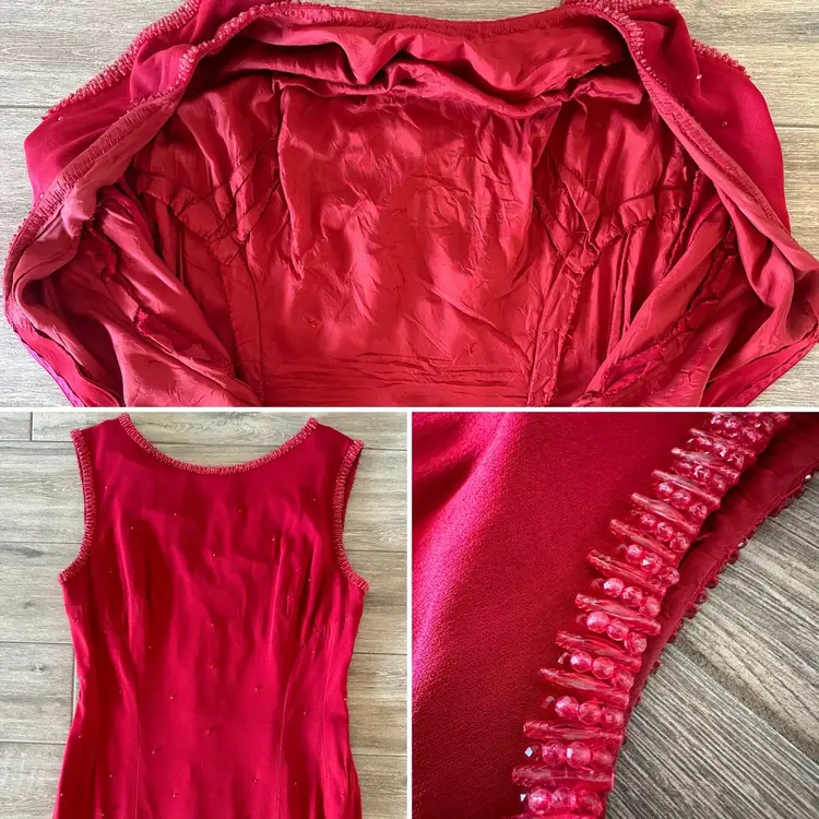 CONDITION: There are three small holes in the outer fabric at the back right side (pictured). The red lining does a good job at making them less obvious, so the dress is still wearable as-is, or you could repair. There are several very faint tiny stains on the left side of the dress that may have been from a splattered drink at some point, but now are only noticeable if inspecting. Overall, this dress is still a stunner and in good vintage condition with lots of wear left!