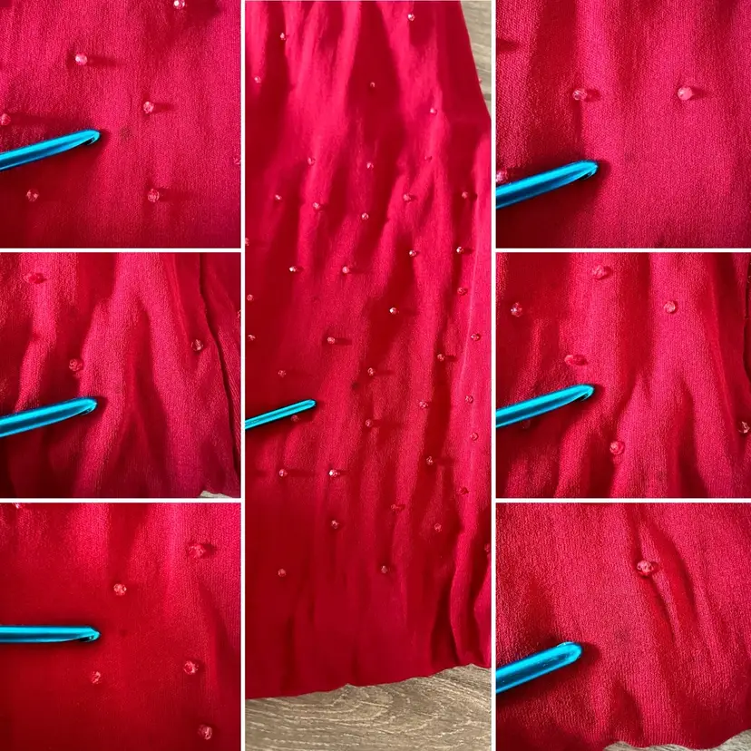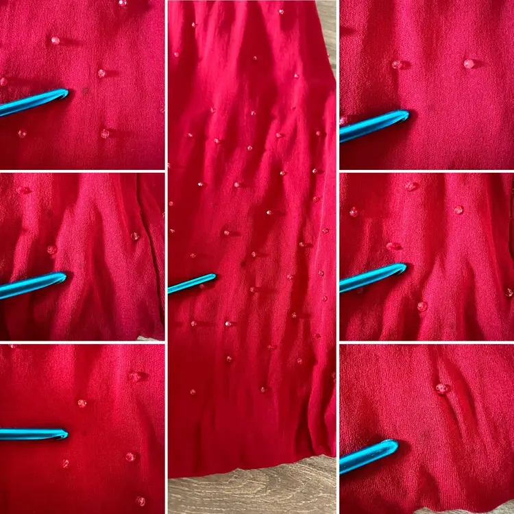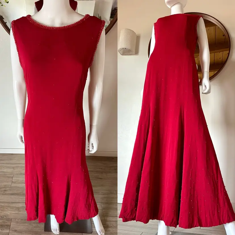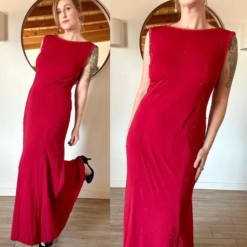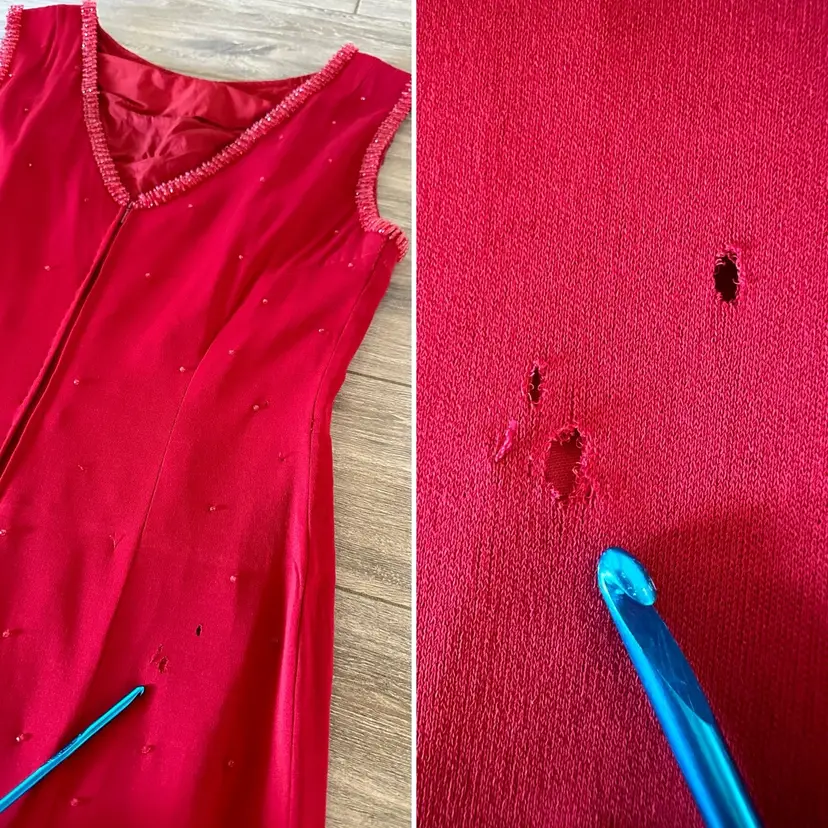 CONDITION: There are three small holes in the outer fabric at the back right side (pictured). The red lining does a good job at making them less obvious, so the dress is still wearable as-is, or you could repair. There are several very faint tiny stains on the left side of the dress that may have been from a splattered drink at some point, but now are only noticeable if inspecting. Overall, this dress is still a stunner and in good vintage condition with lots of wear left!