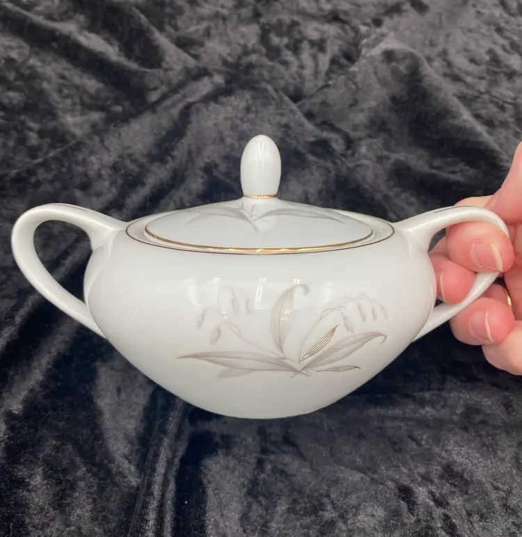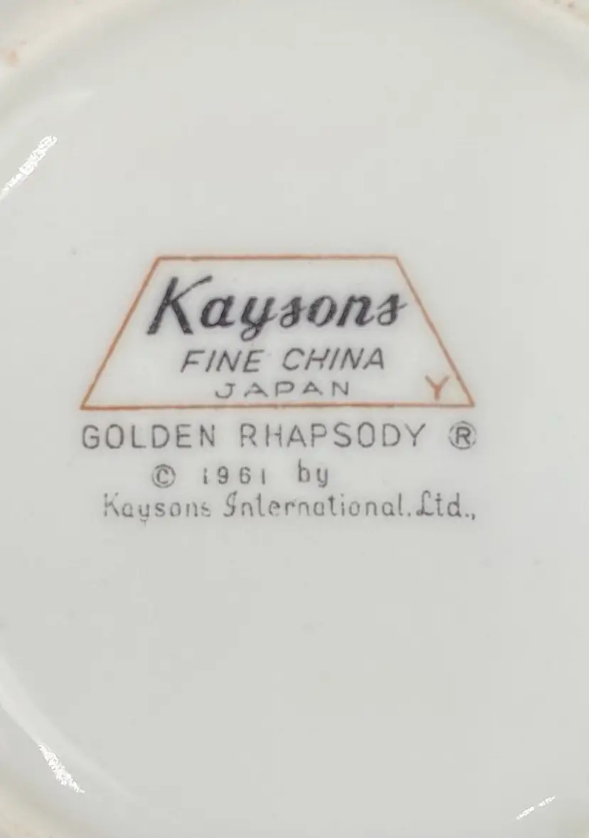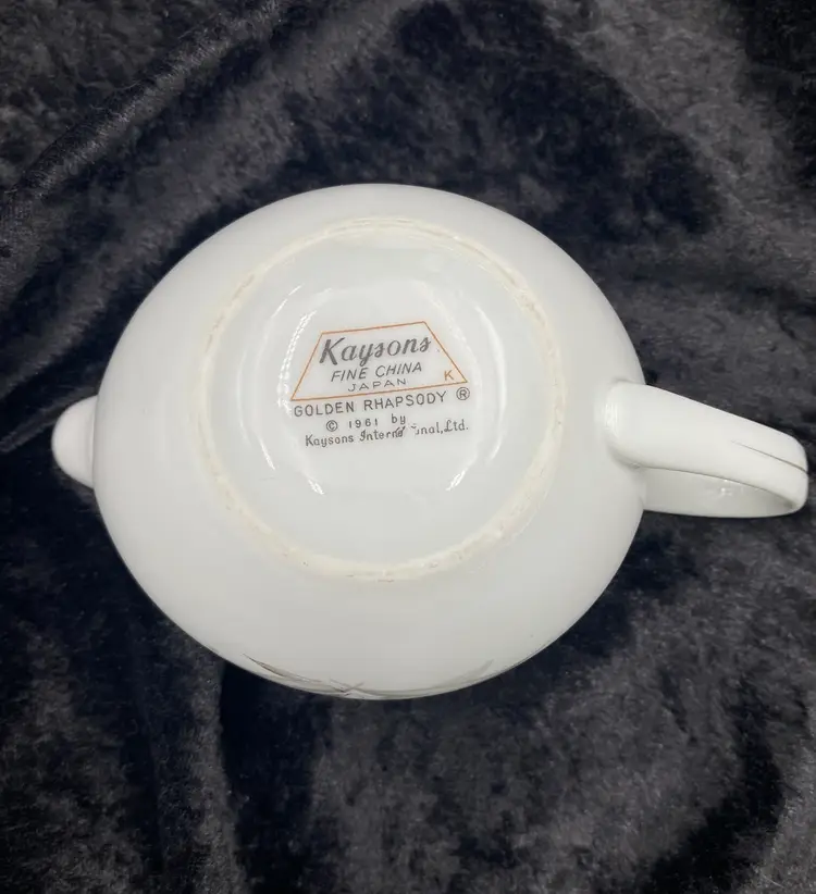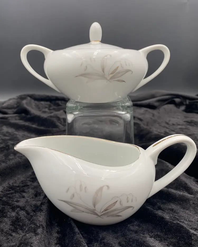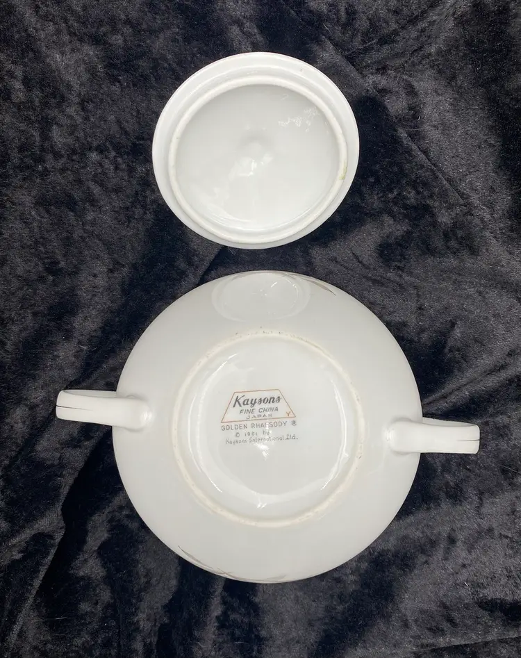 Add a touch of vintage elegance to your tea or coffee time with this beautiful creamer and sugar set from Kayson's Fine China. The set includes a covered sugar bowl and creamer in the beautiful "Golden Rhapsody" pattern with a glossy finish. The white bone china is accented with gold gilt and a silver & gold gilt floral pattern, making it a perfect addition to any occasion or collection. Crafted in Japan in 1961, this original set has a classic 1960s style. It weighs 1 pound and 1.4 ounces and is perfect for serving tea or coffee to your guests.