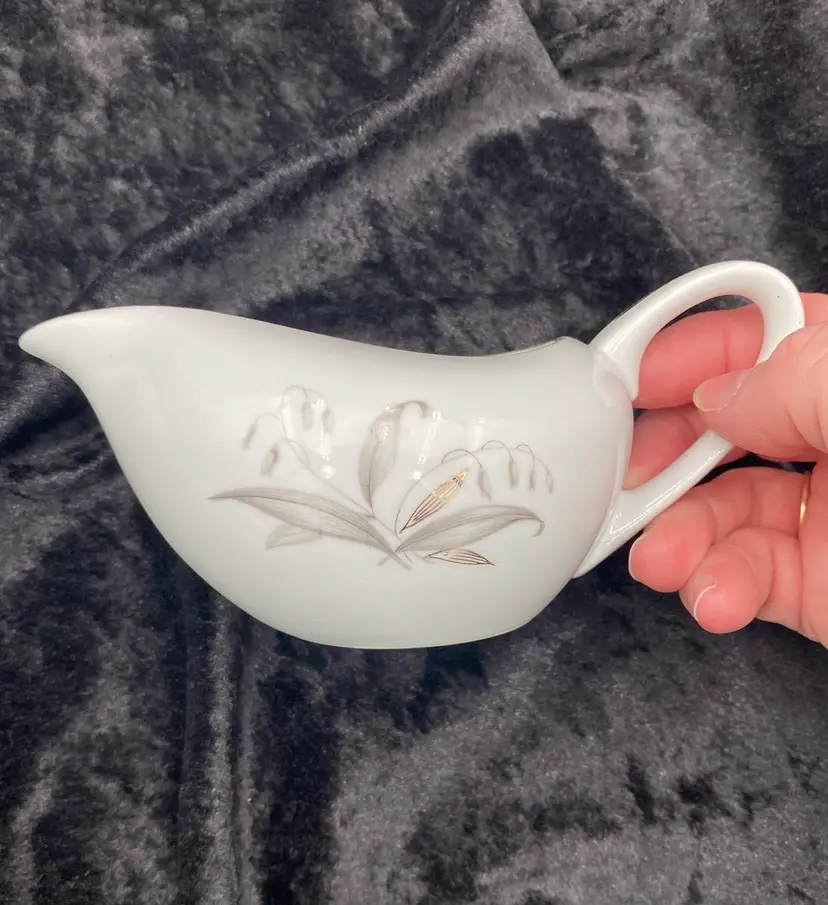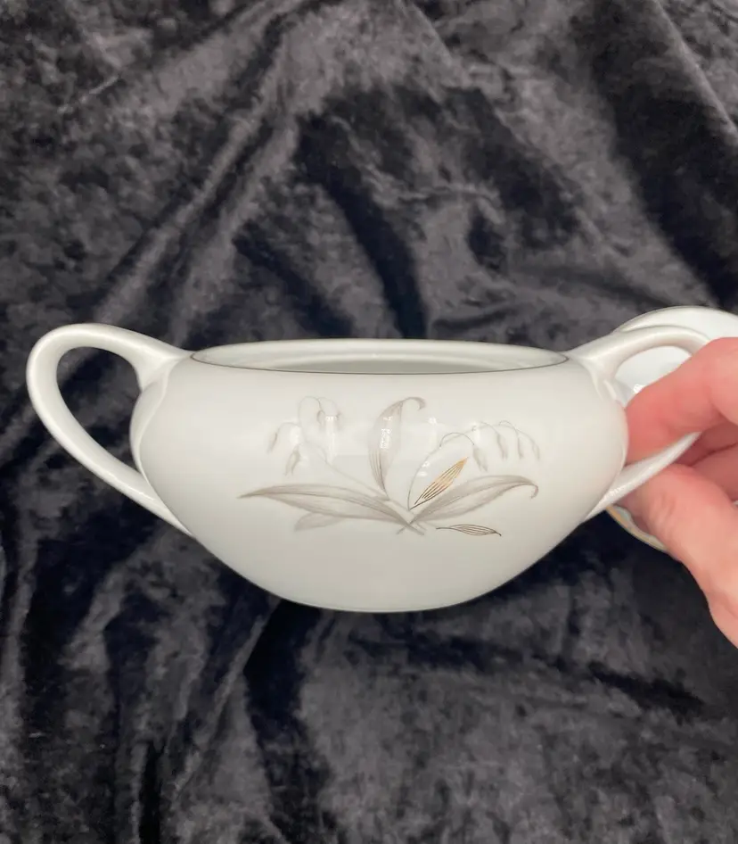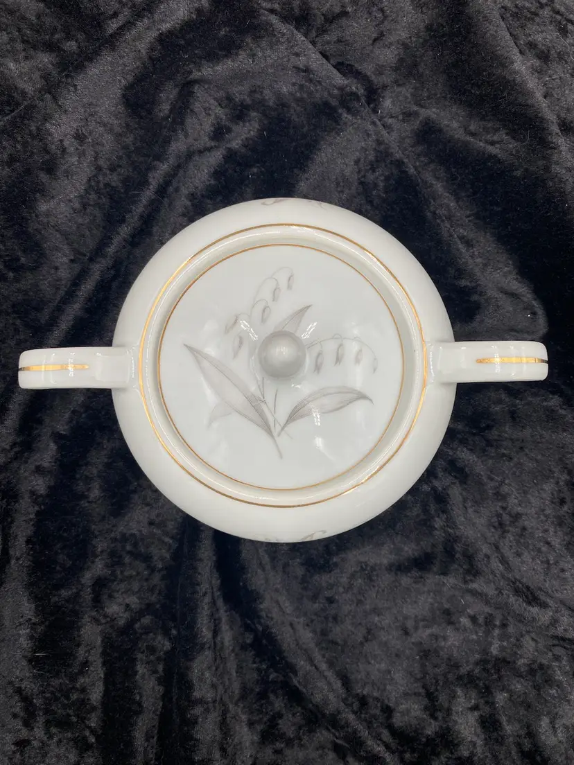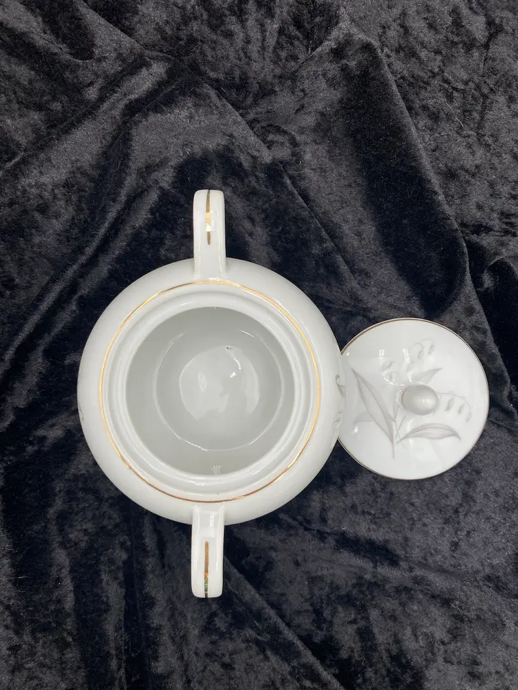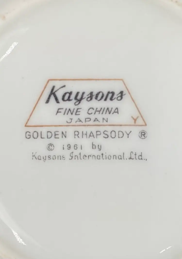 Add a touch of vintage elegance to your tea or coffee time with this beautiful creamer and sugar set from Kayson's Fine China. The set includes a covered sugar bowl and creamer in the beautiful "Golden Rhapsody" pattern with a glossy finish. The white bone china is accented with gold gilt and a silver & gold gilt floral pattern, making it a perfect addition to any occasion or collection. Crafted in Japan in 1961, this original set has a classic 1960s style. It weighs 1 pound and 1.4 ounces and is perfect for serving tea or coffee to your guests.