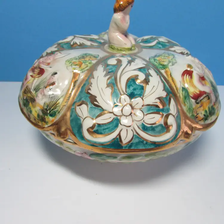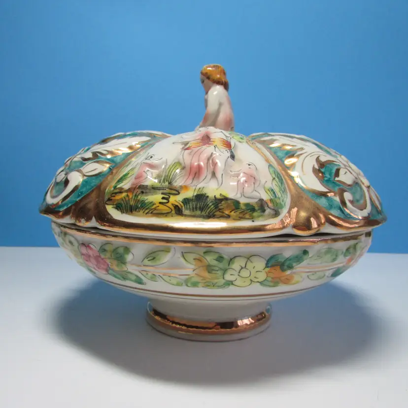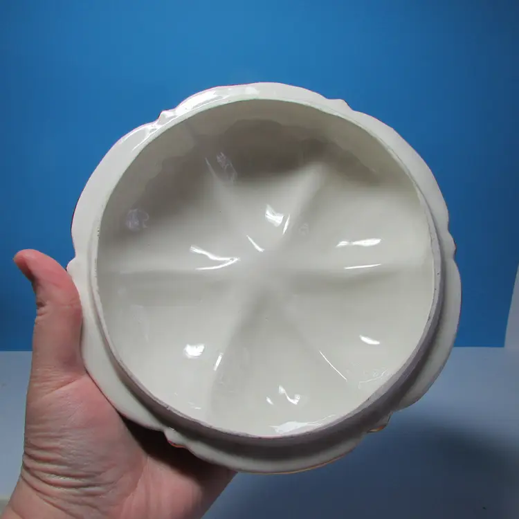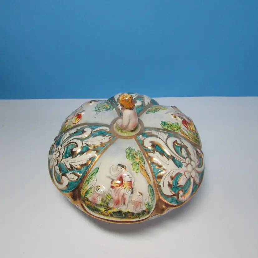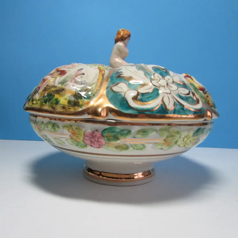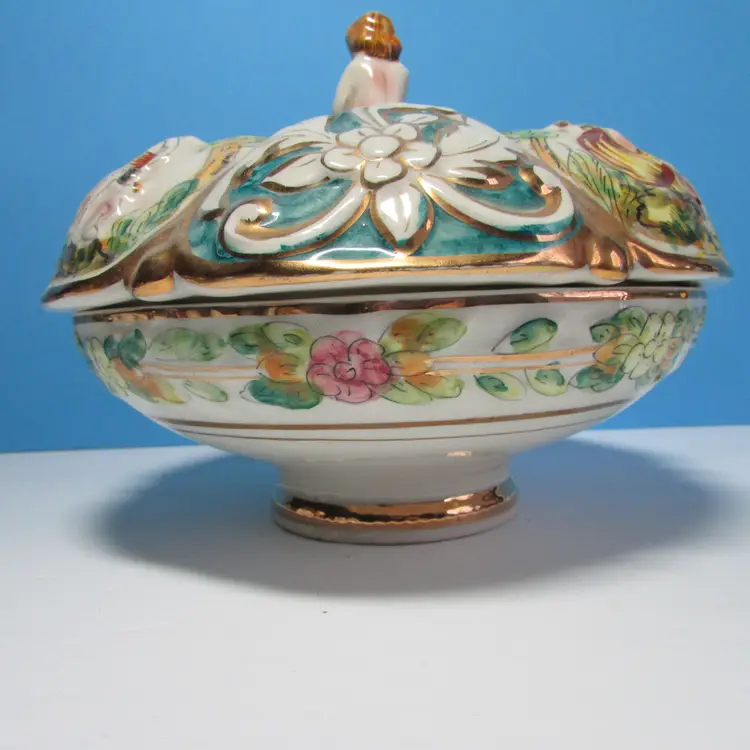 This beautiful dish is in good condition. It is about 2 1/2" or 6" with the lid x 8" round. This is shipped from a smoke free home. Thanks for looking!