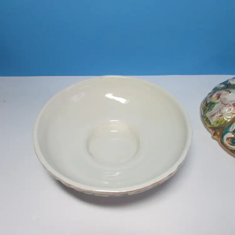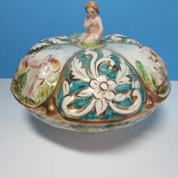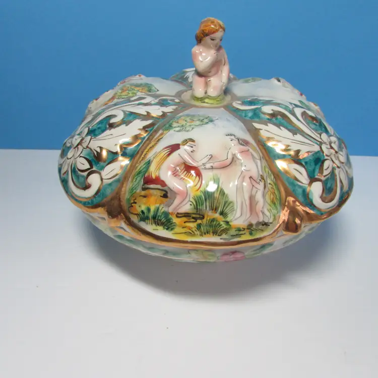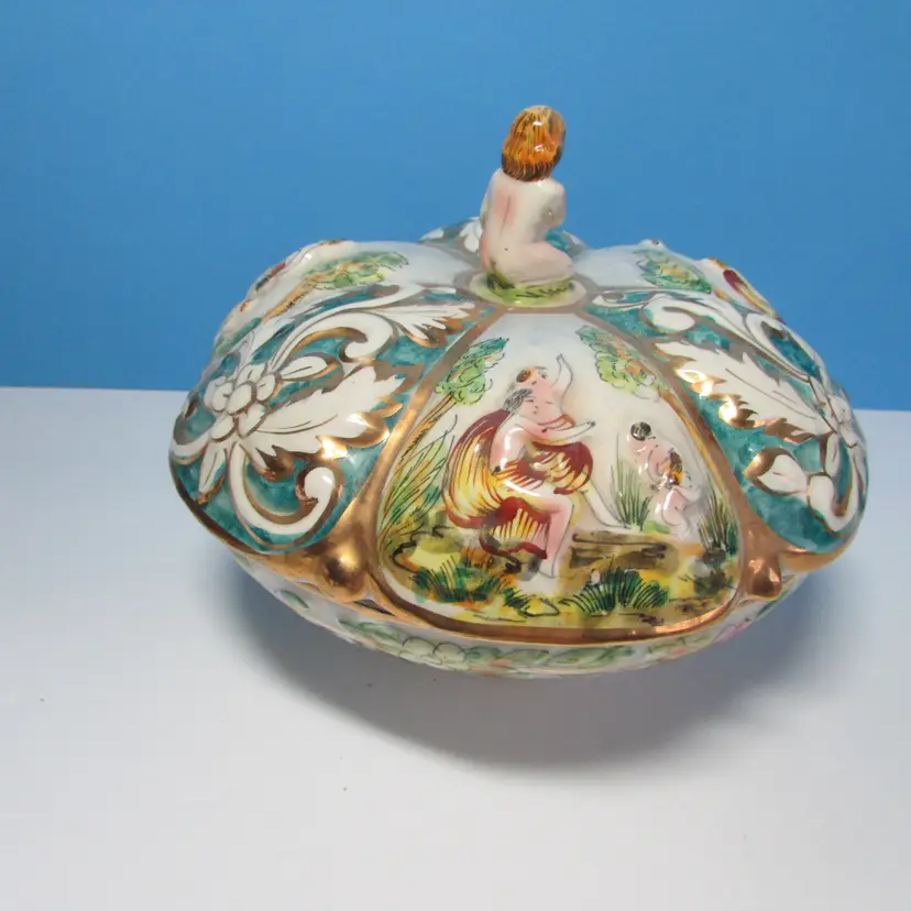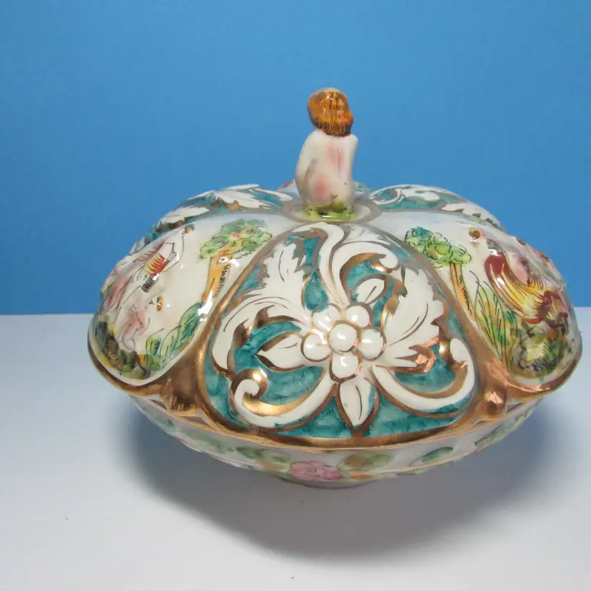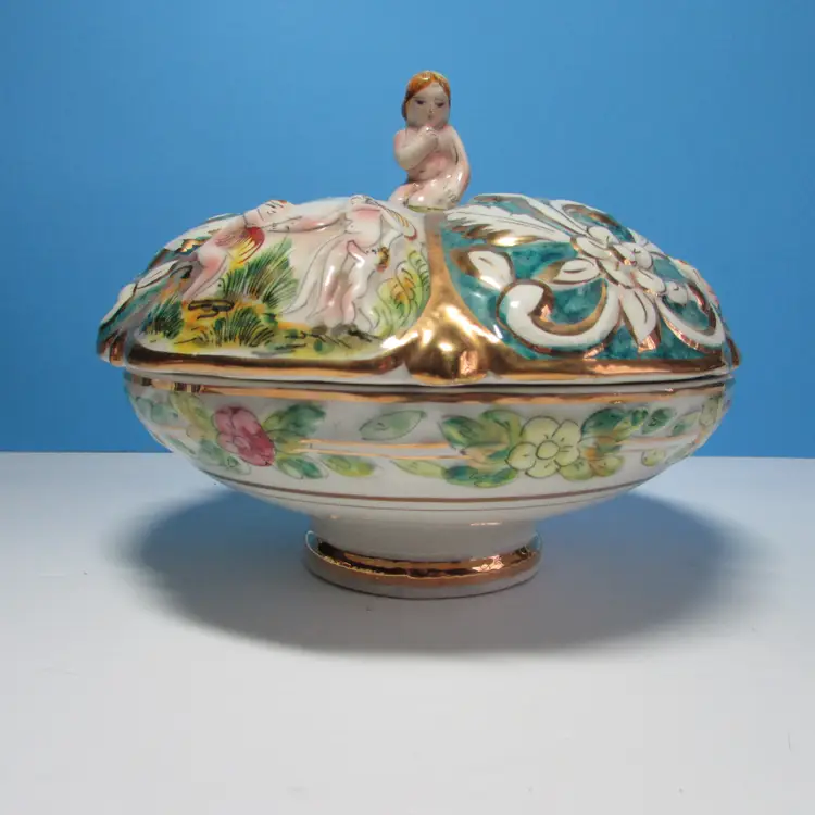 This beautiful dish is in good condition. It is about 2 1/2" or 6" with the lid x 8" round. This is shipped from a smoke free home. Thanks for looking!