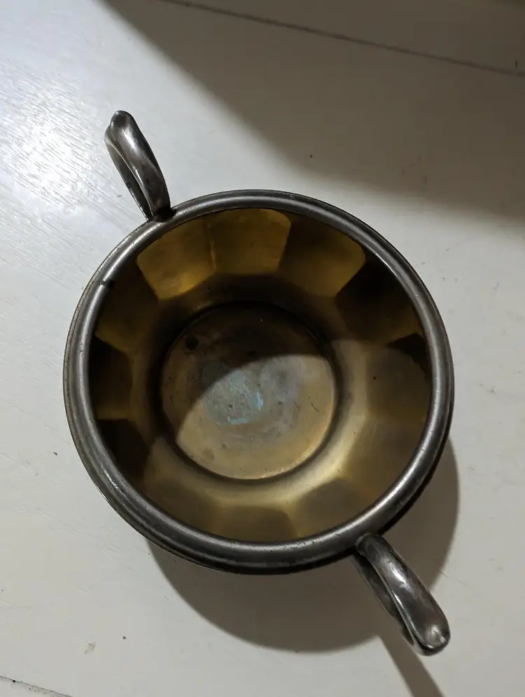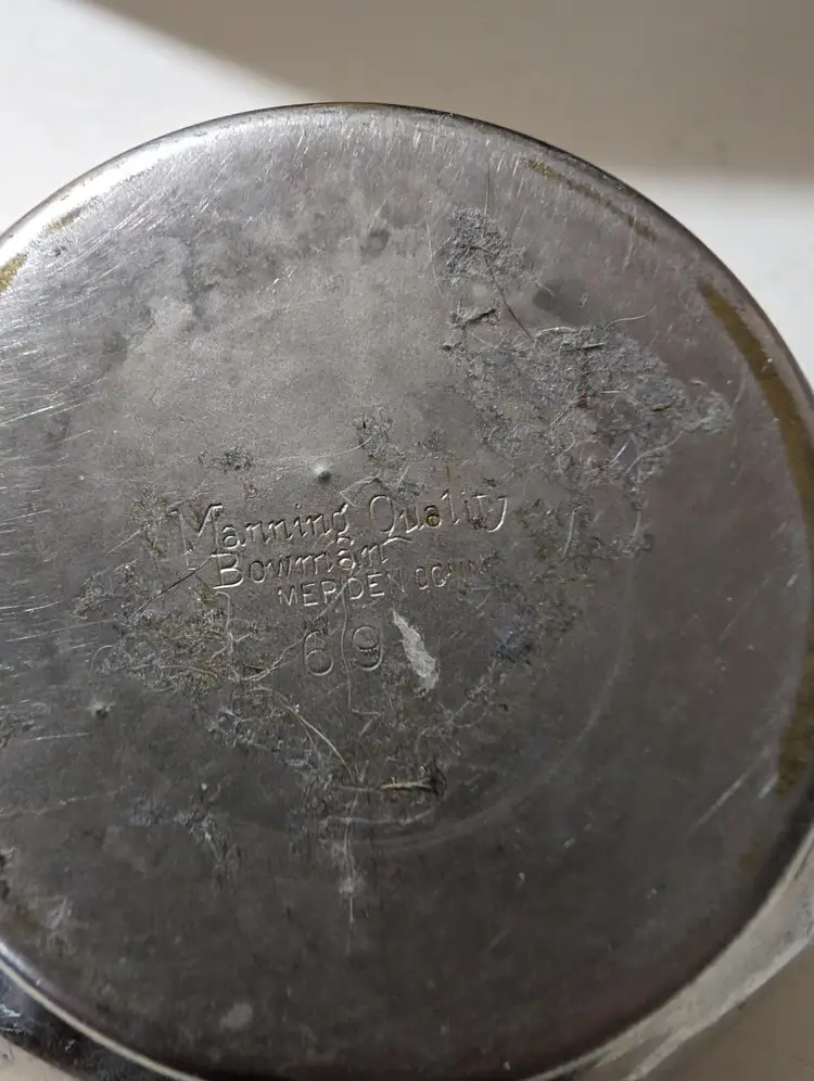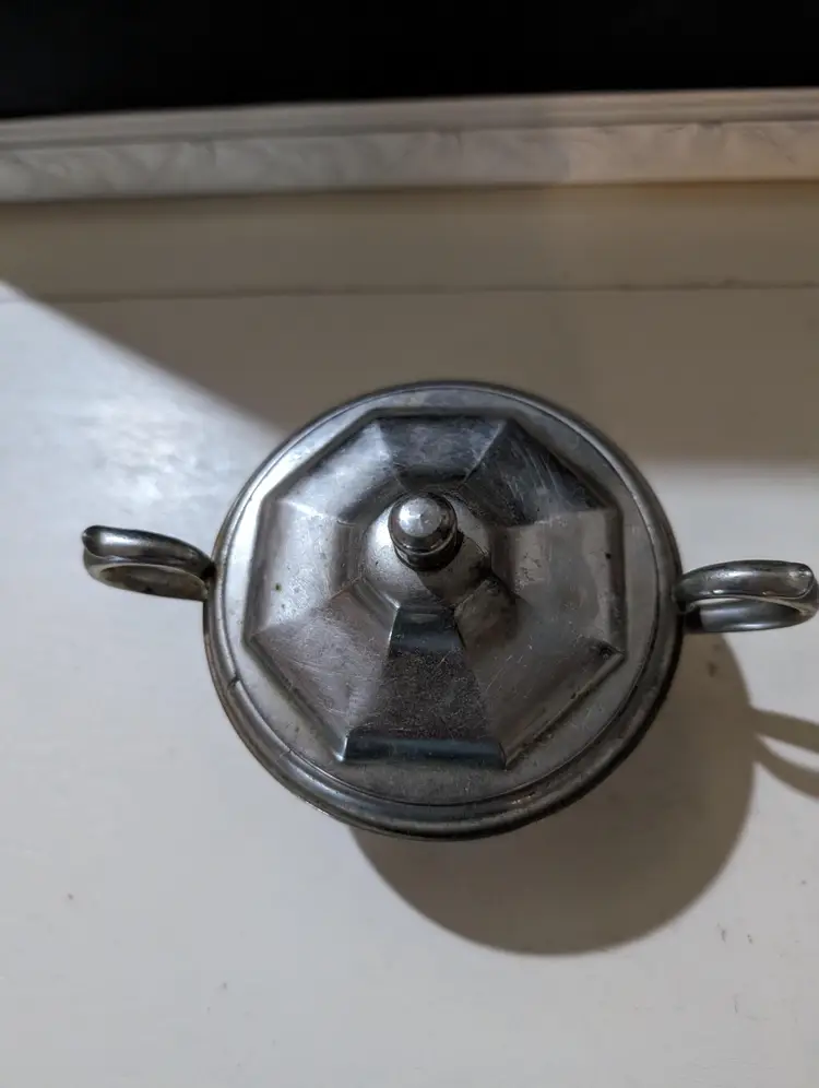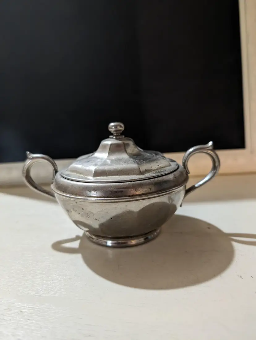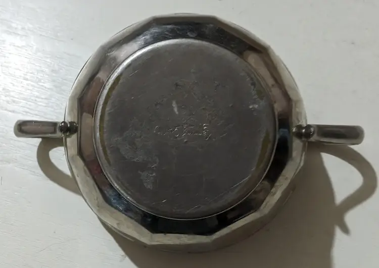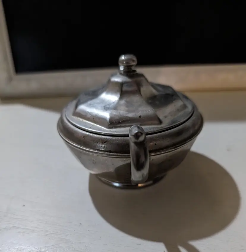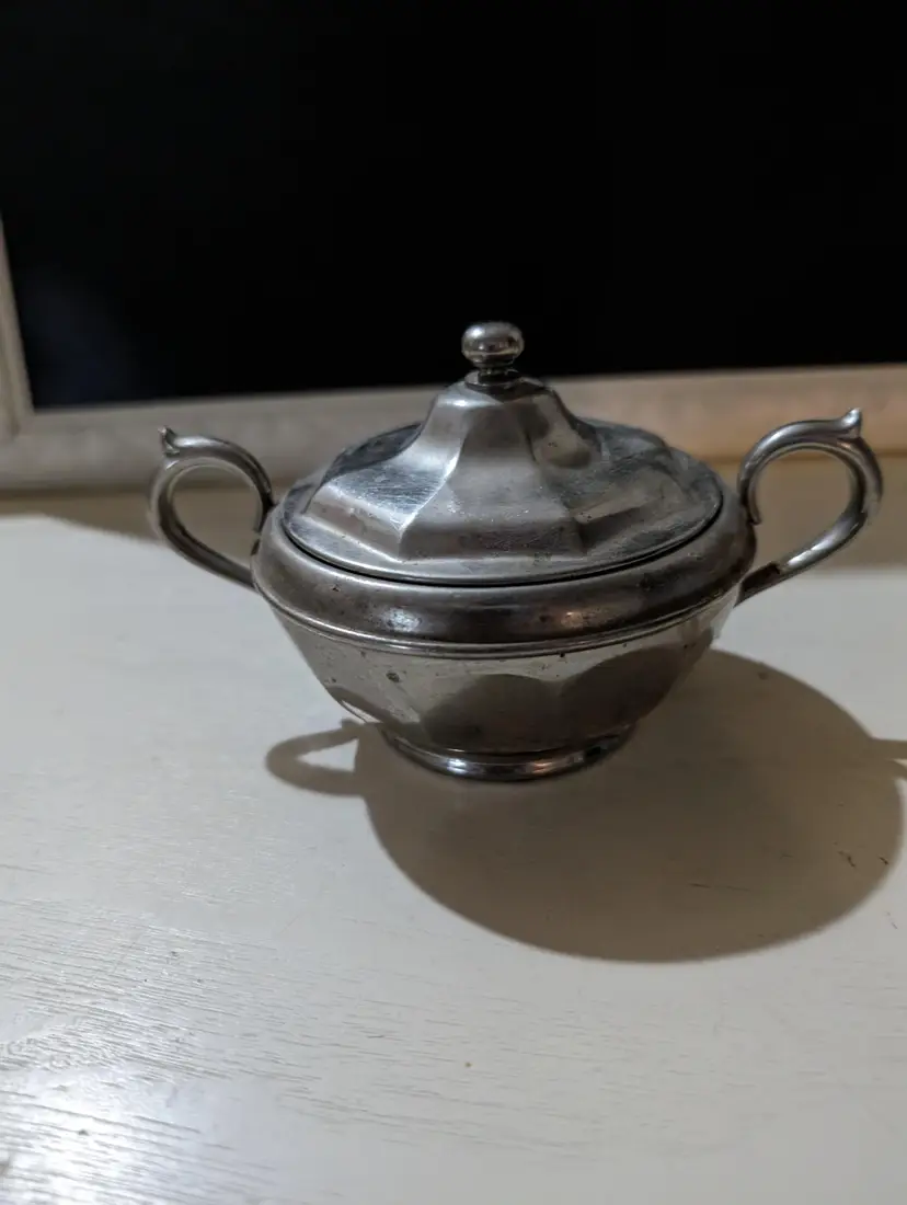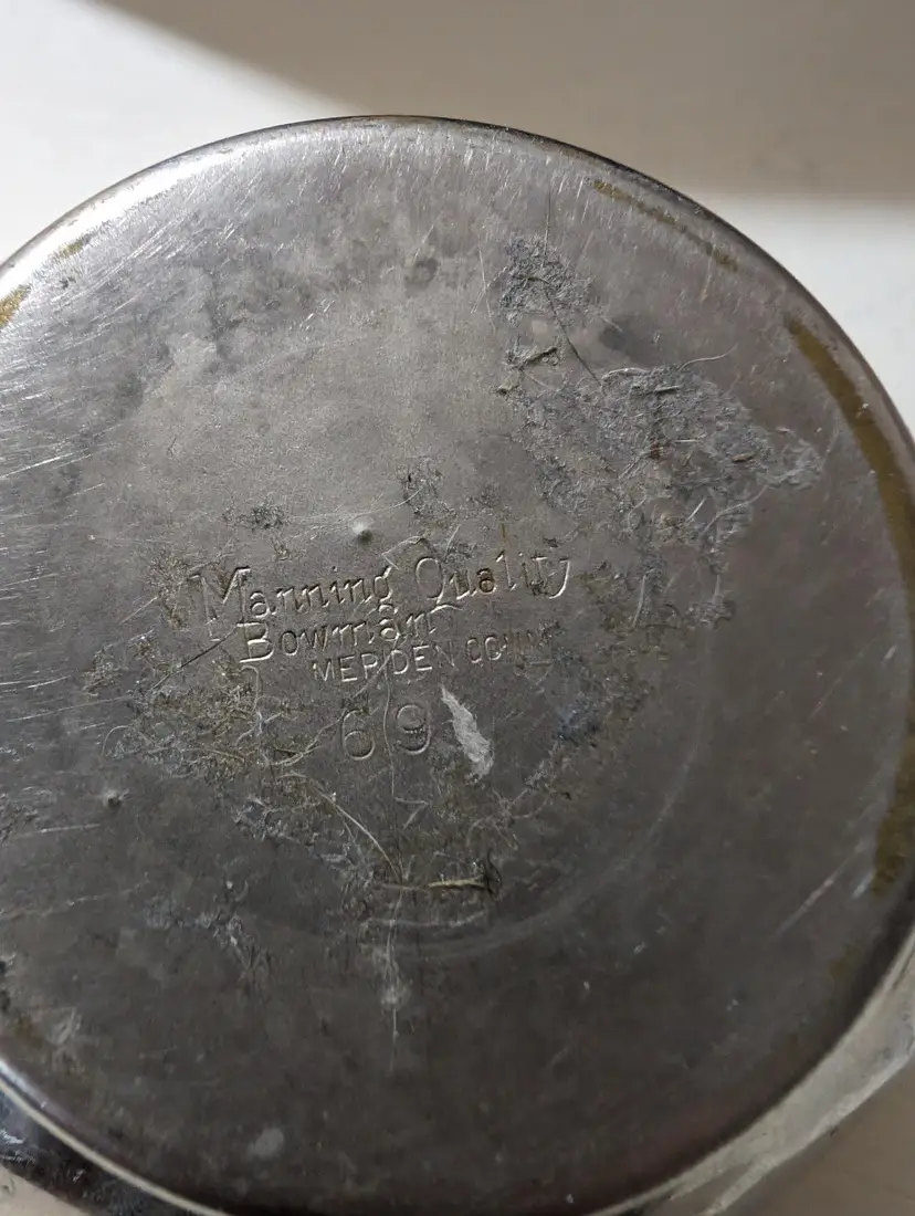 Vintage Silver plated Manning Bowman Sugar Bowl. Piece is used but is in excellent condition with no breaks or dents but does have some signs of minimal ware and tare with some scuff markings on body and natural aging which makes piece AS IS. Nice vintage piece that is approximately 3 inches height with a 6 inches length from handle to handle and a 4 inch width and weights 4 oz. Piece is Sliver plated with double handle features and has original company markings on bottom. Nice vintage piece that is still functional.