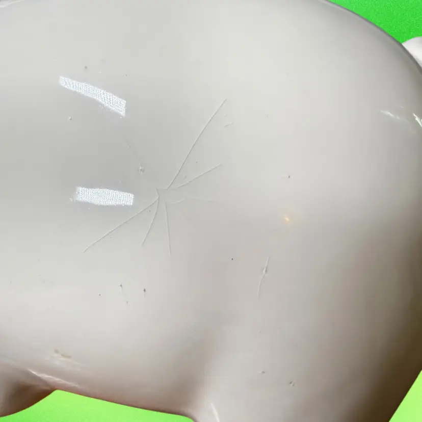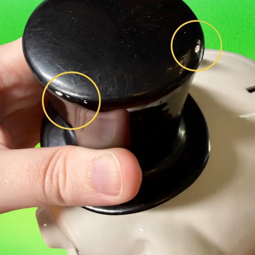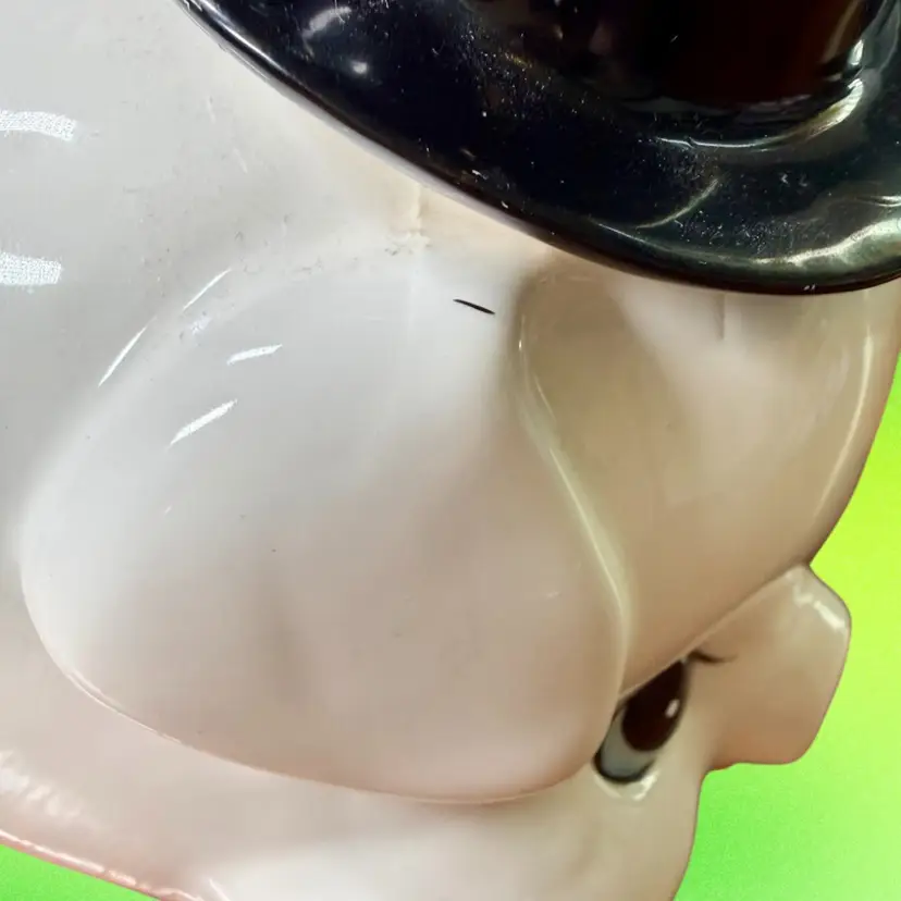 NOTE top hat has a couple of spots of paint loss, and there is a small black line on pigs head under hat (looks to be a rogue paint mark). Side of pig has a spidering crazing spot, perhaps where it was once knocked into something. Although ceramic is not cracked or broken. Please see pictures.