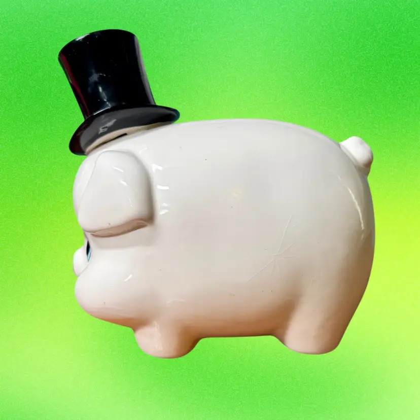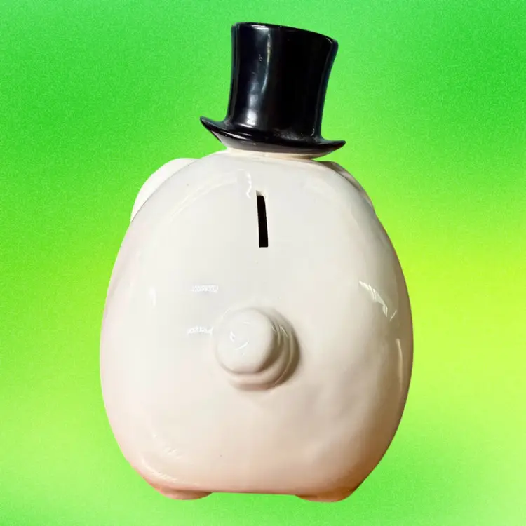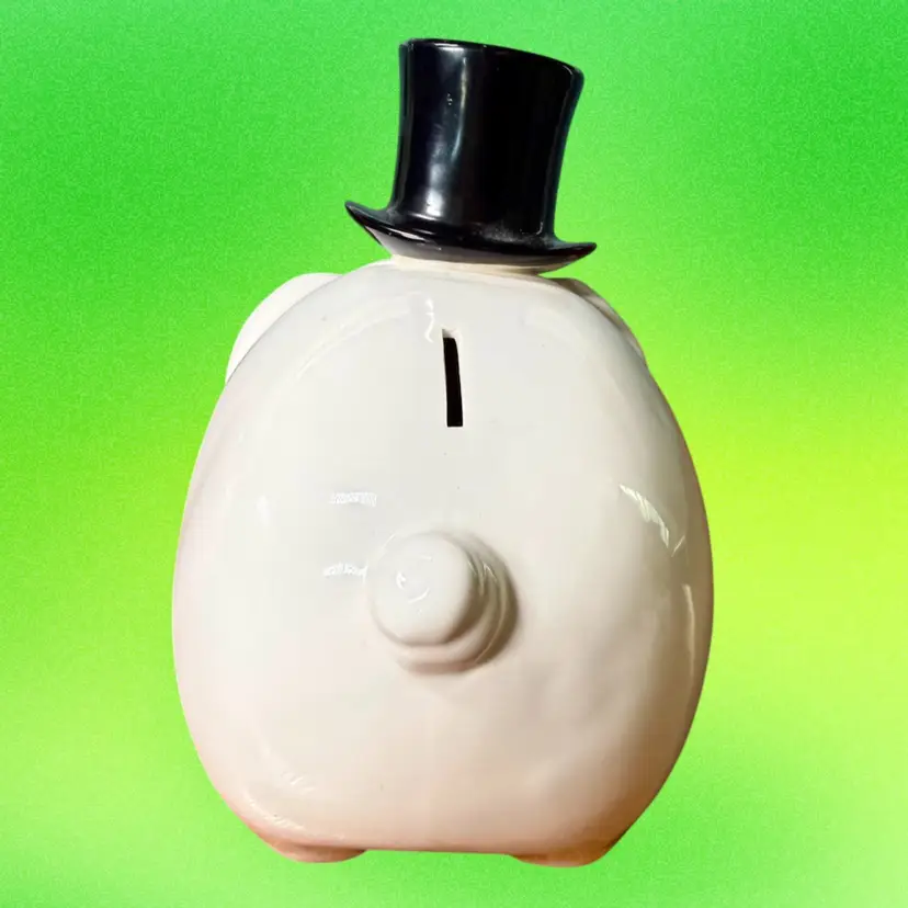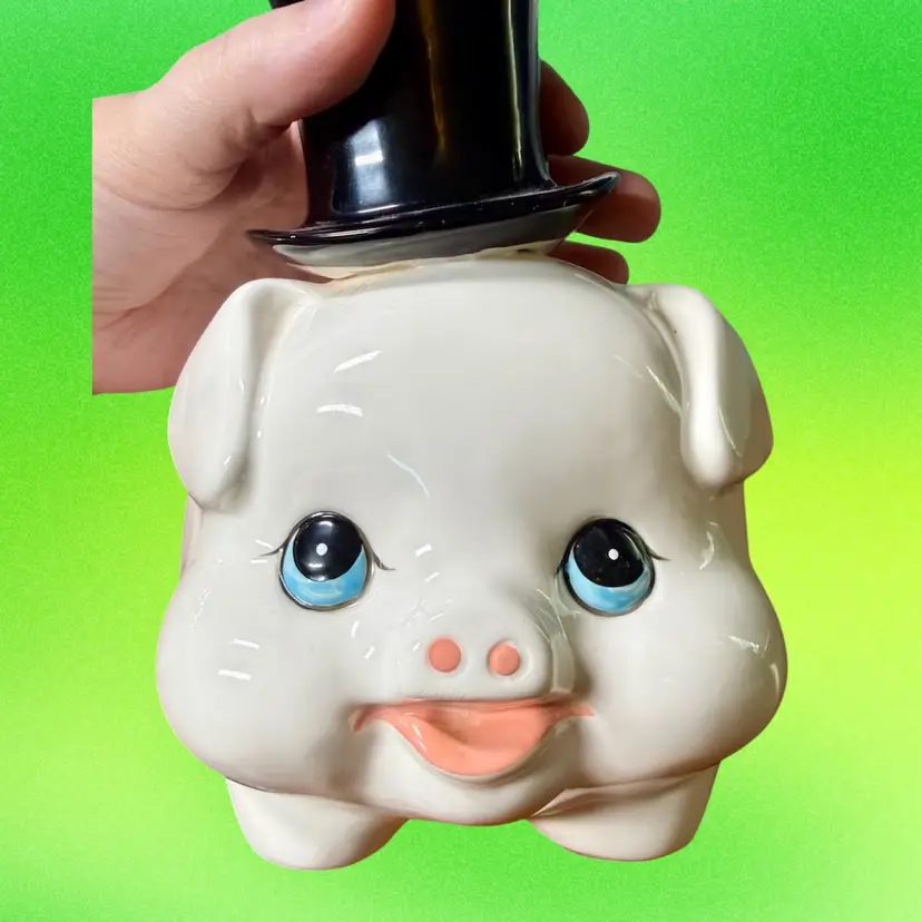 7.5"x5"x7". Darling ceramic piggy bank; a white anthropomorphic pig wearing a black top hat. Still has rubber stopper. No makers mark or stickers remain.