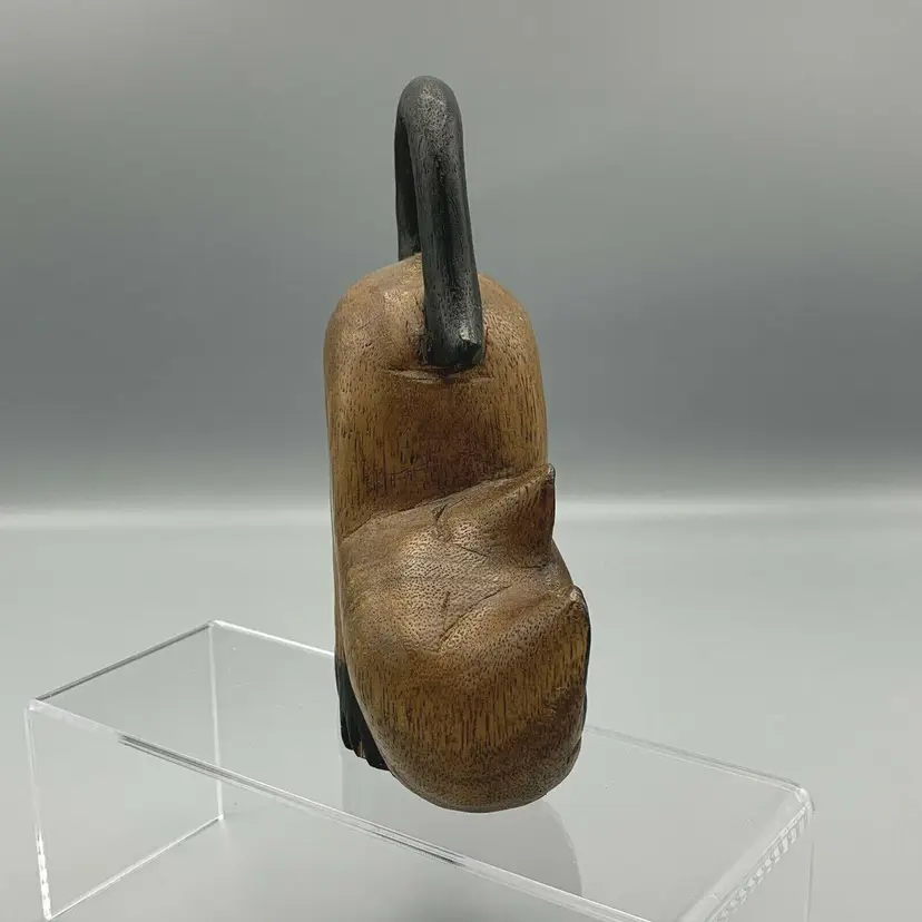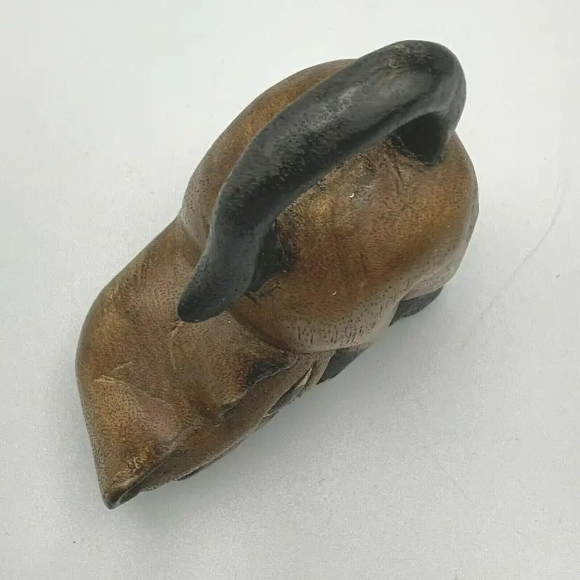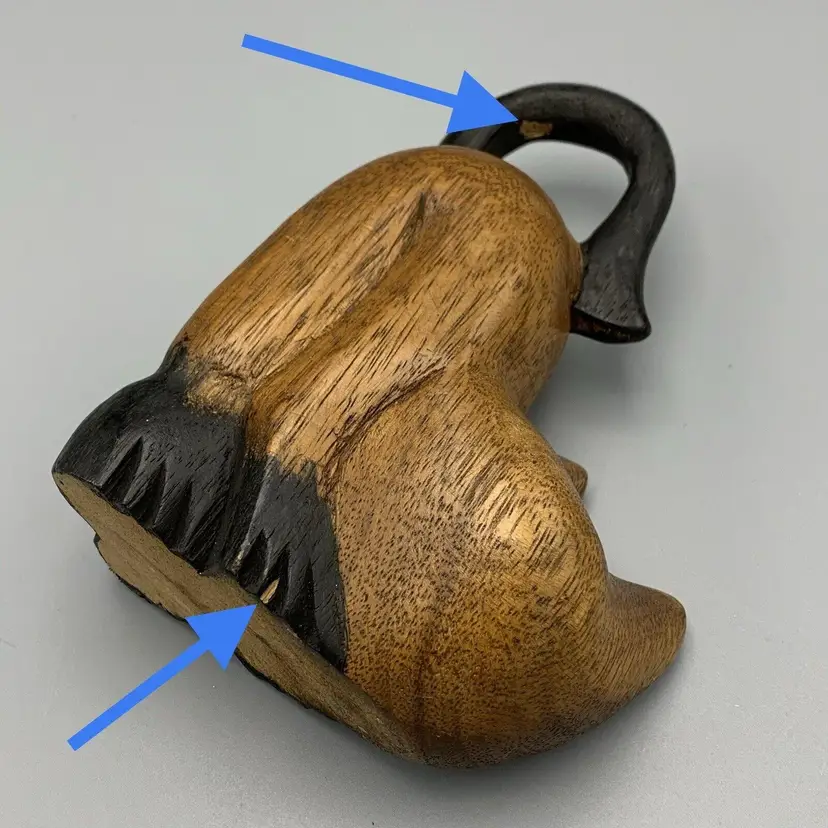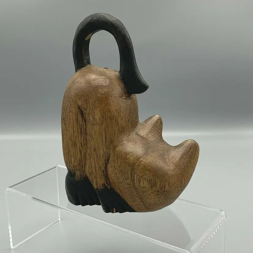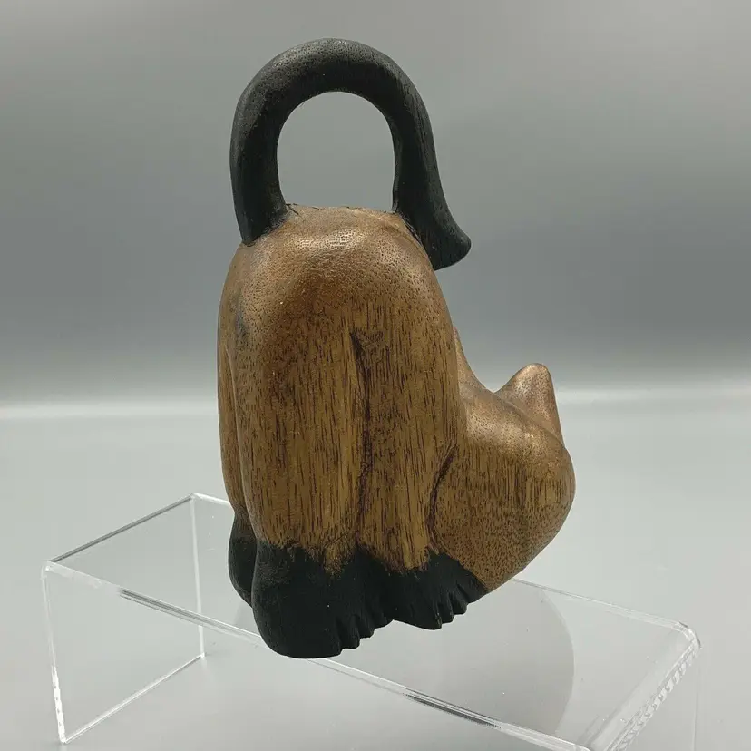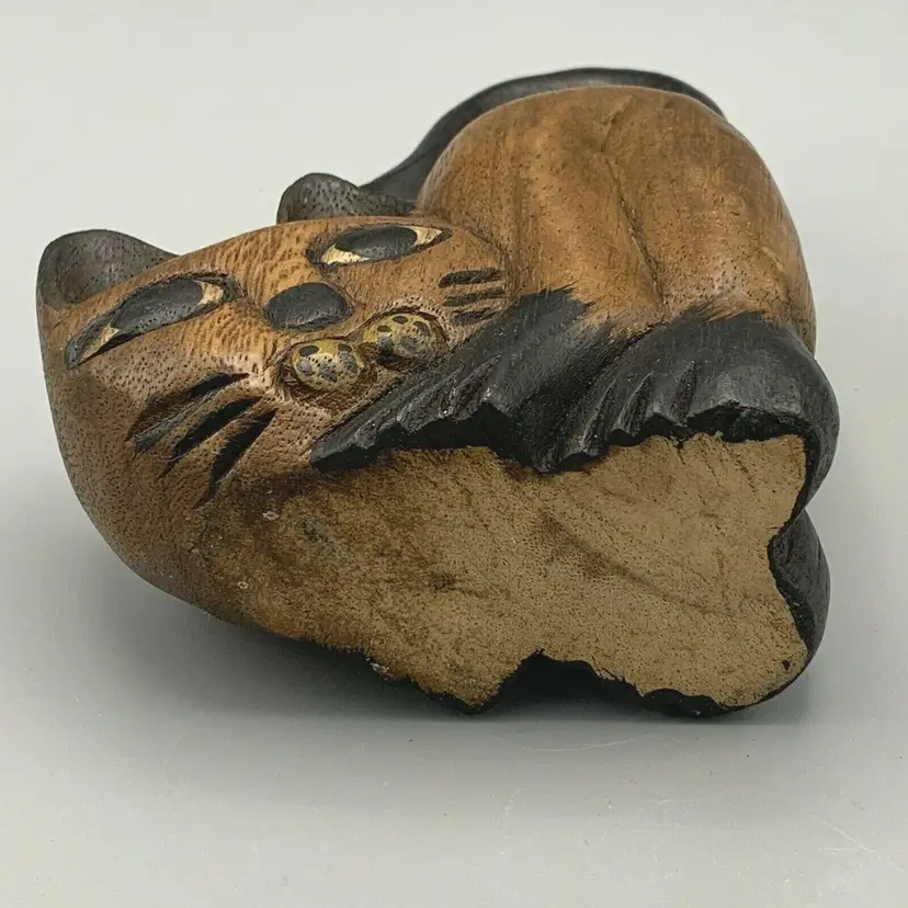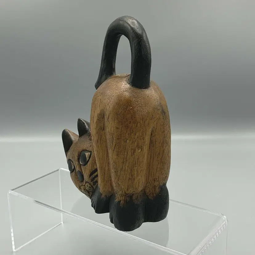 Vintage Cute Arched Back Brown Cat Hand Carved Solid Piece of Wood Painted/Stained Black Tail, Eyes, Paws, & Wiskers in good condition gently used but not abused two small chips in the wood/paint (see phots with arrows) no cracks or repairs Height: 7" (17.78 cm) Base: 4" (10.16 cm) x 2" (5.08 cm)