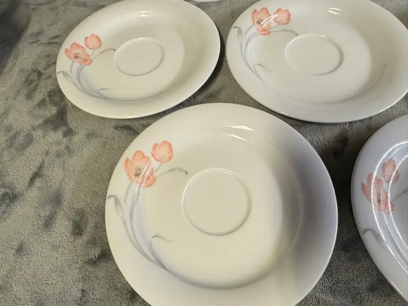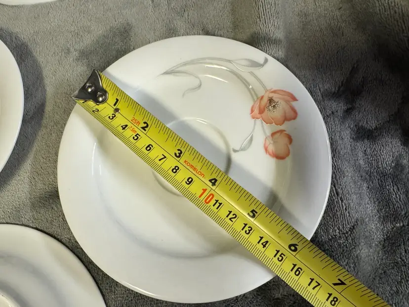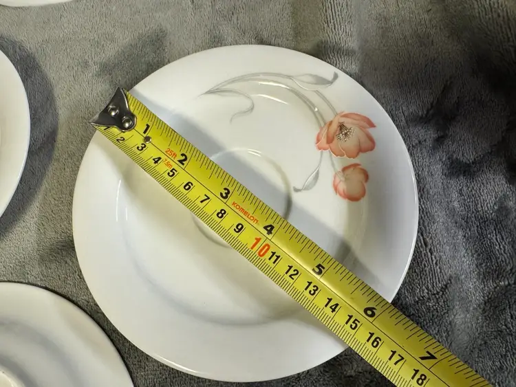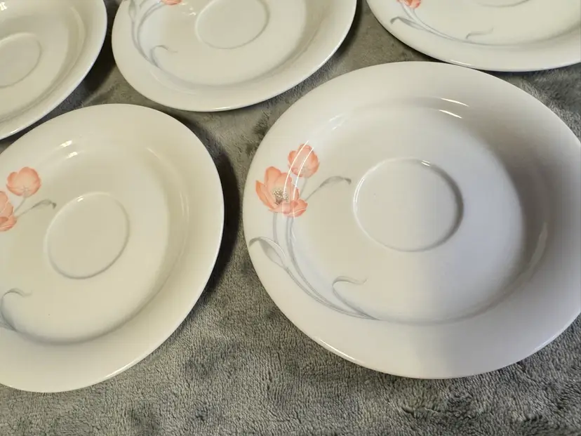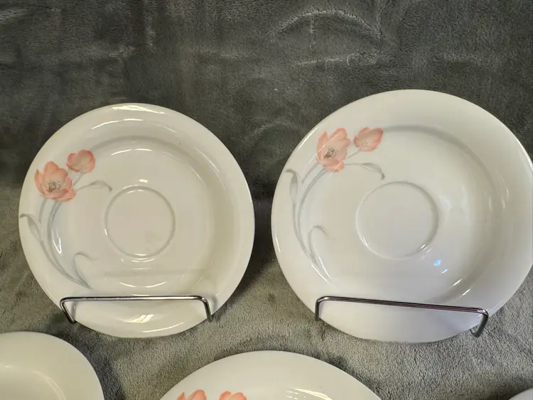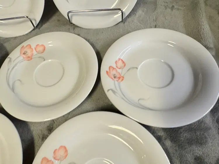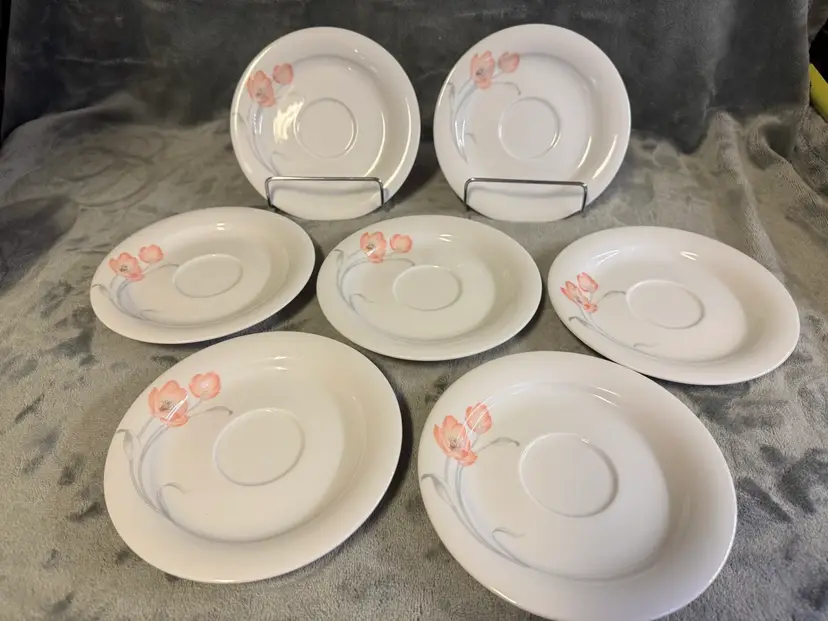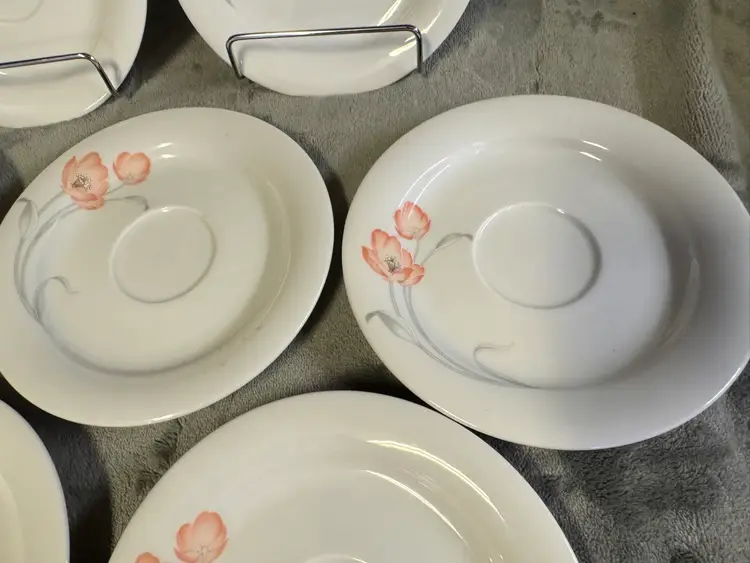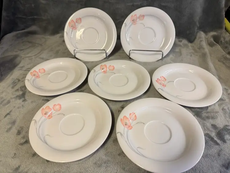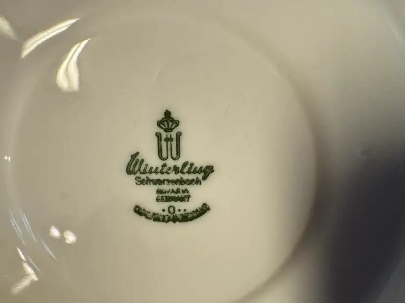 These vintage Winterling Bavaria schwarzenbach Porcelain saucers are a beautiful addition to any table setting. Made in Germany, these round saucers feature a colorful flower pattern and a glossy finish. Each saucer measures 6 inches in diameter, perfect for serving tea, starter plates or appetizers. The WIG640 pattern adds a touch of elegance to any meal, making these saucers a unique and charming collectible for those who appreciate fine porcelain craftsmanship. Set of 7. Excellent condition. No chips, cracks, or crazing.