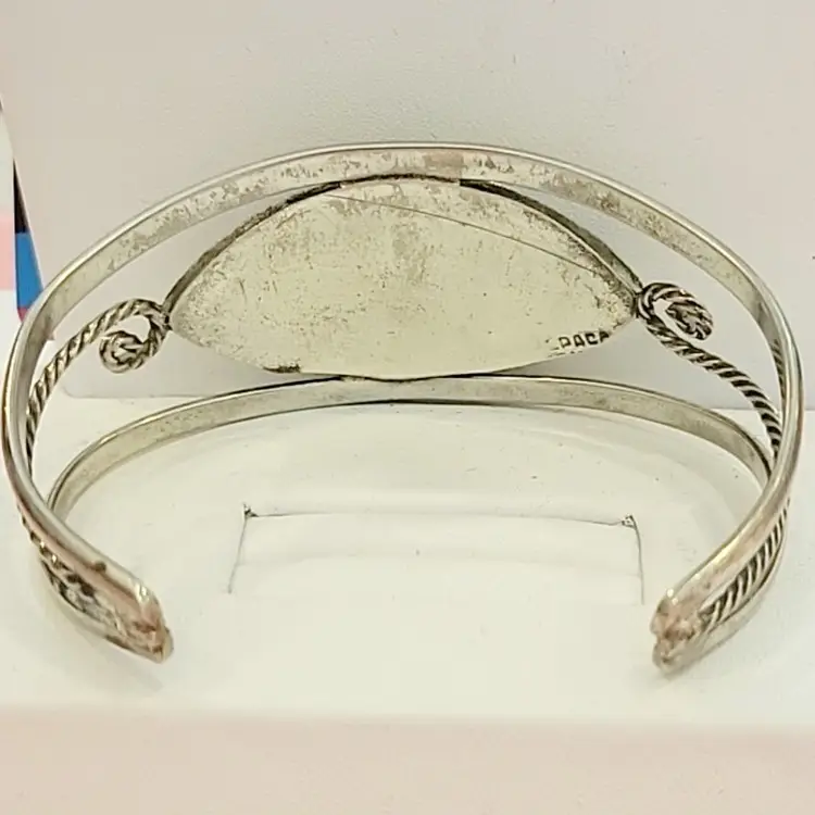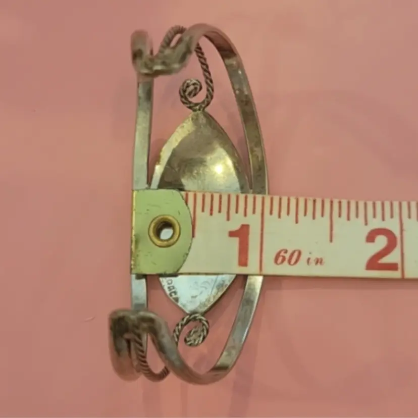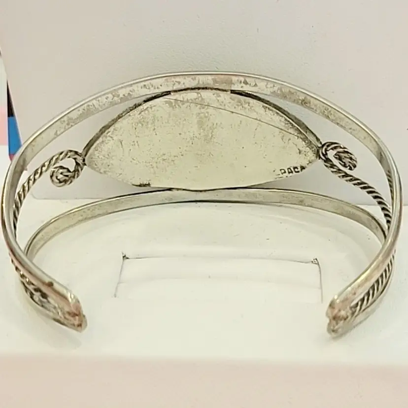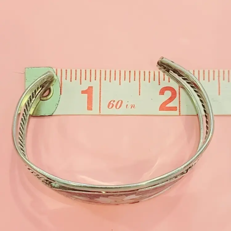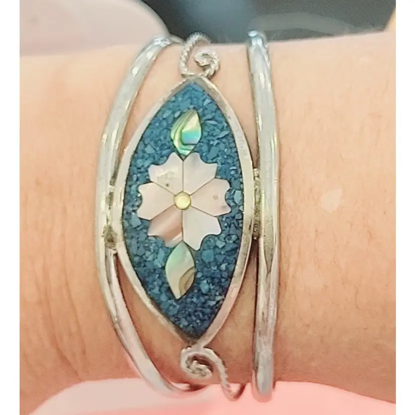 Beautiful Sterling Silver 1970's Alpaca Mexico Cuff in excellent pre-loved condition. Beautiful Mother of Pearl Flower (see pictures for measurements)