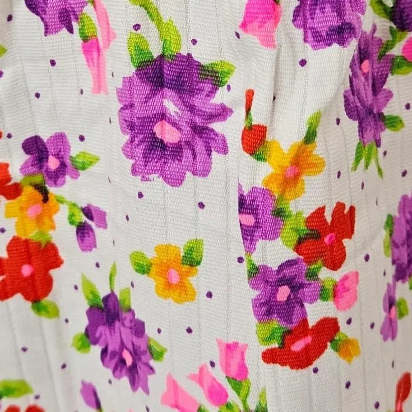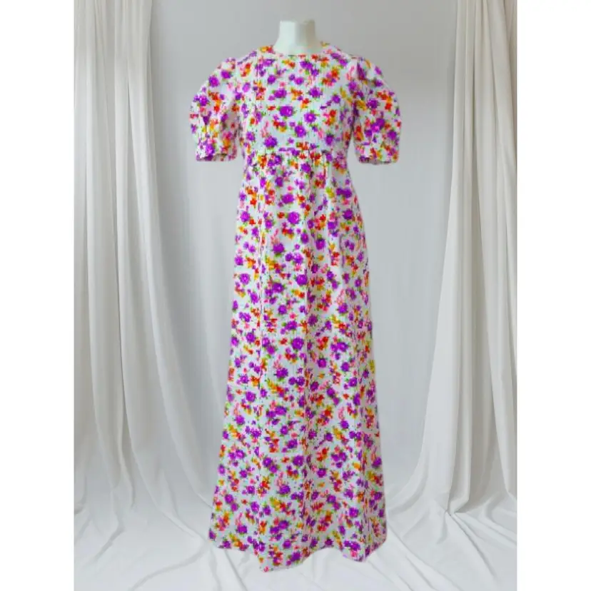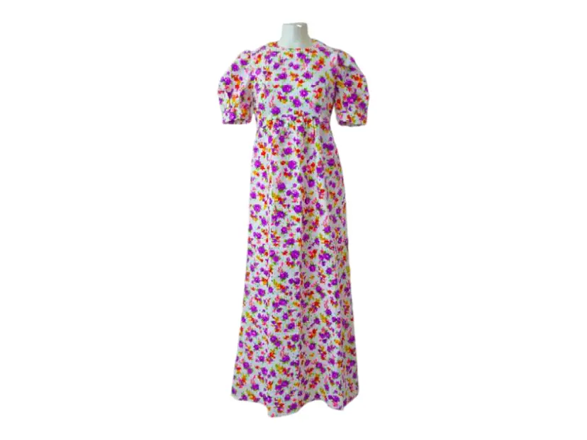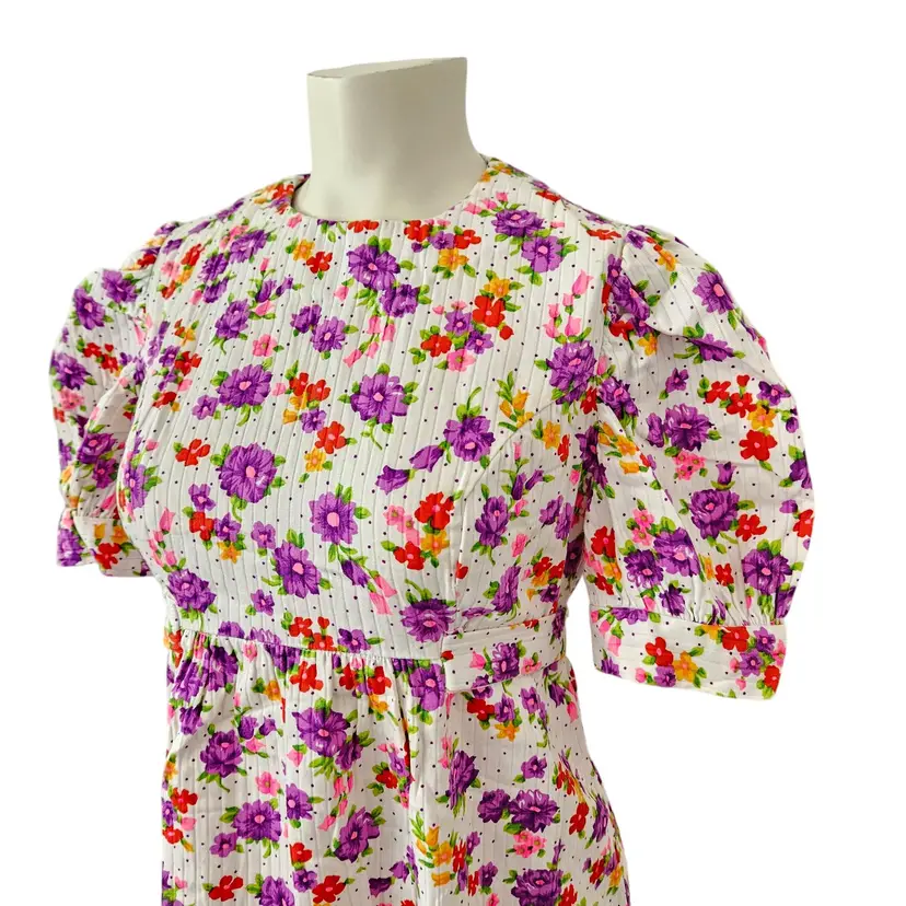 Vintage 70's Floral Maxi Dress Cute cap sleeves Beautiful flowers in purples, pink, red Empire waist with attached tie back sash Bust 32 Waist 36 Hip 40 Shoulder 12 Sleeve 11 Length 53 Zip back Cotton Material is not sttetcy Excellent condition
