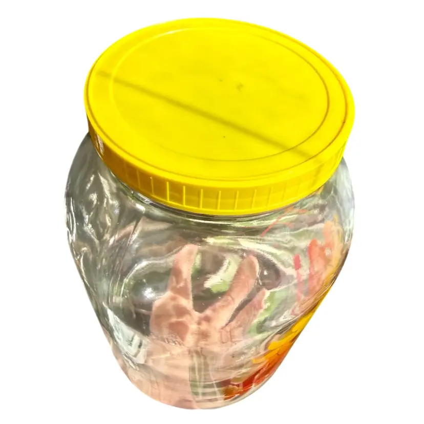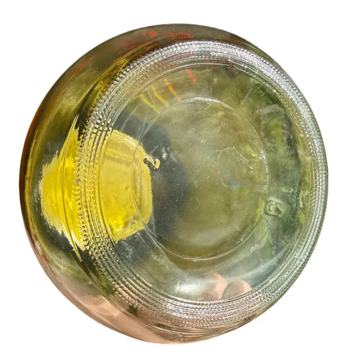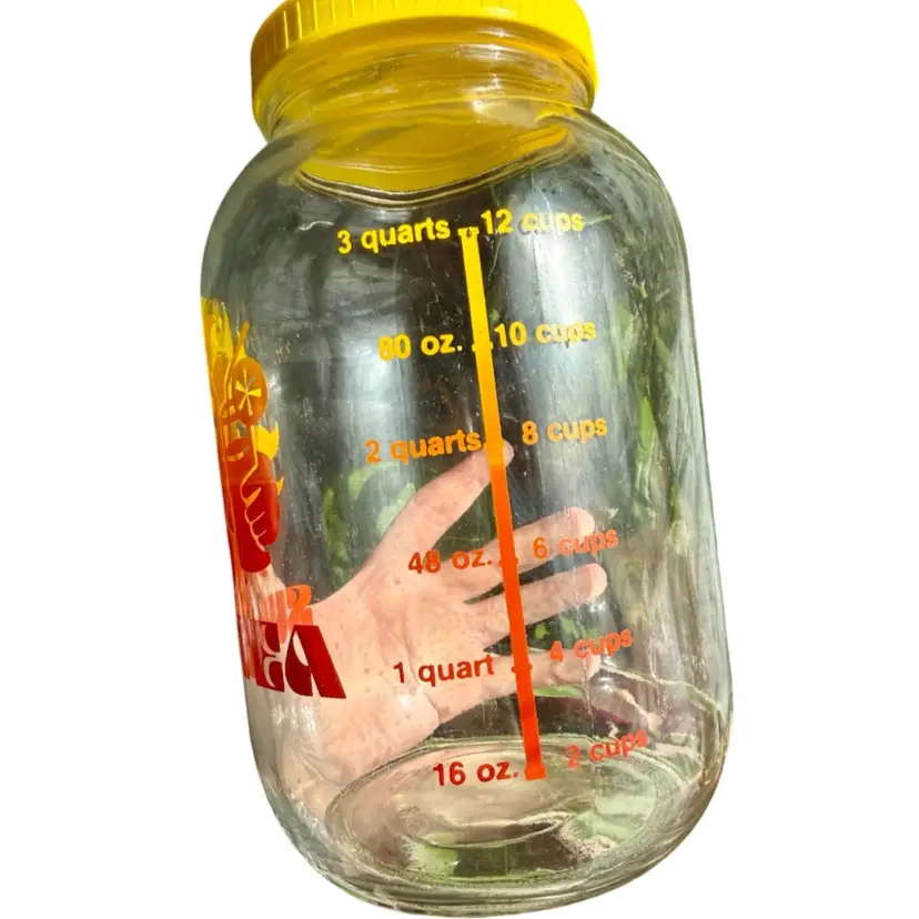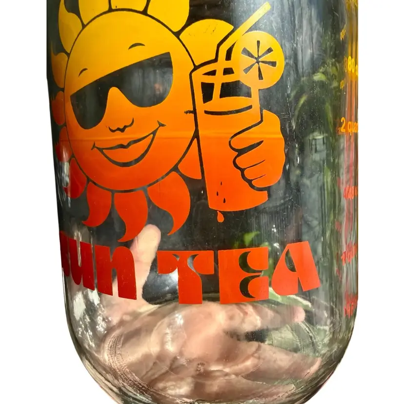 Approx 10”x6”. 70’s Sun Tea glass jug, includes original yellow lid. Features a groovy sun character with the words “SUN TEA” and includes a line for measuring how much is in jug. Paint is in great condition. No issues!