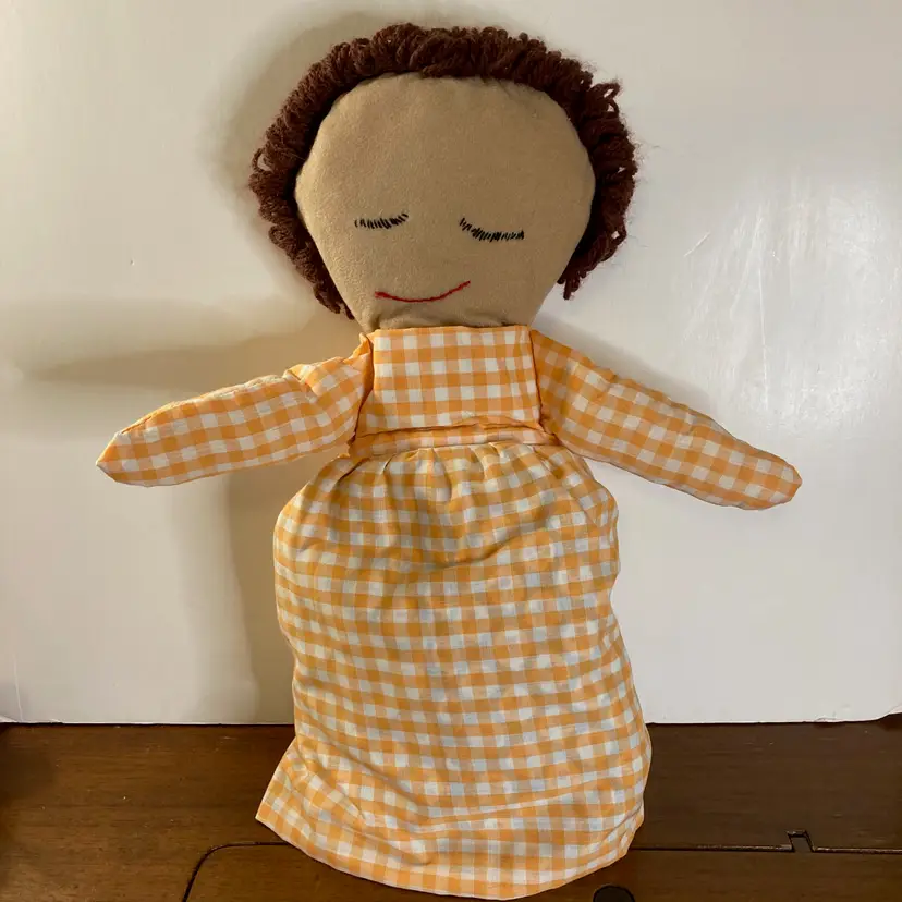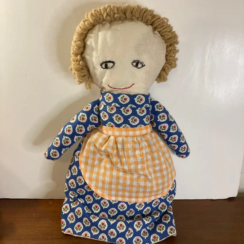 Topsy turvy style doll with Caucasian lady on one side and a sleeping African-American lady on the other. Yarn hair on both. Blue printed outfit with orange and white checked apron that matches the outfit of the other doll. Handmade by Appalachian artists in North Carolina. Measures ca. 17" in height. Excellent, preloved condition.