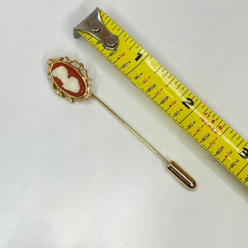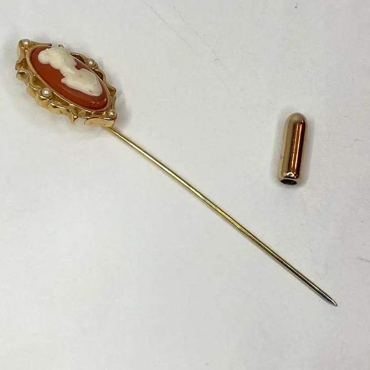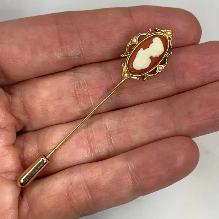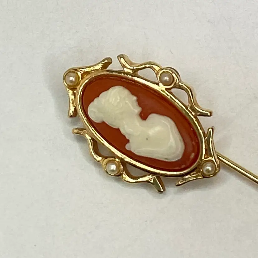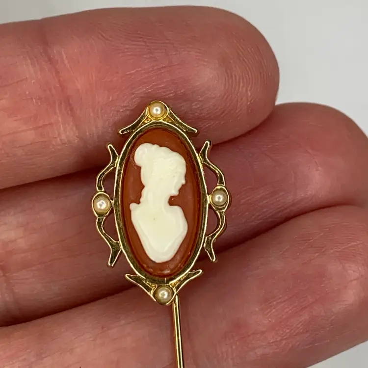 Vintage 70s Avon Victorian Revival Lady Cameo Seed Pearl Gold Tone Hat Stick Pin. Good vintage condition. Please see pictures for details. SMOKE FREE/PET FREE HOME Approximate measurements: Length- 2.75"