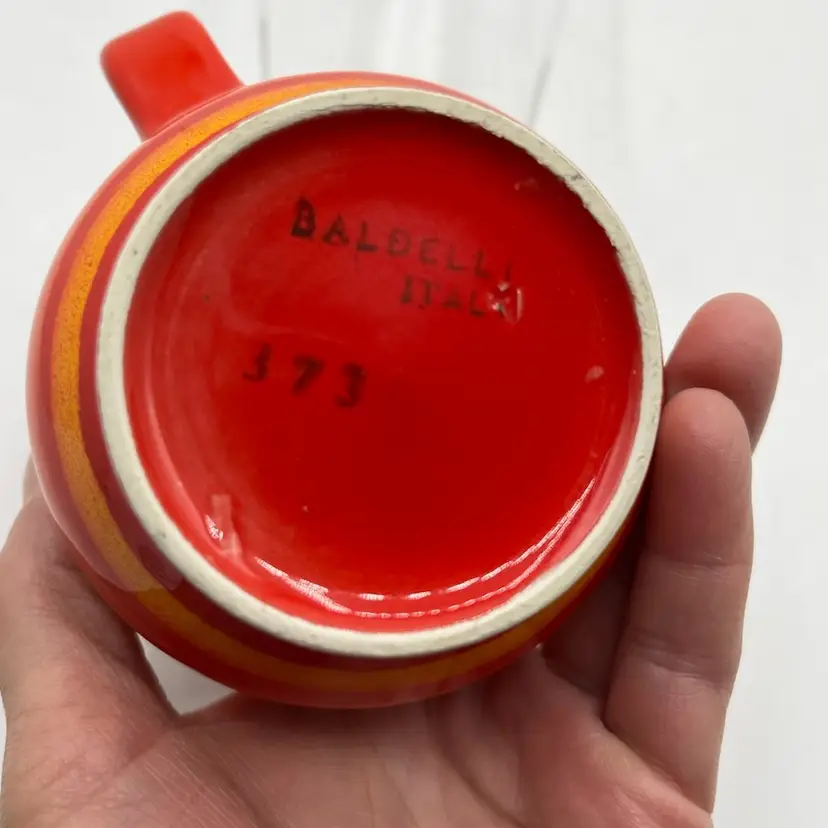 1970s Bright orange and yellow stripped Baldelli Italian pottery coffee mug Sox 3.5 tall x3 wide at top. #373 printed in the bottom There was no damage noticed.