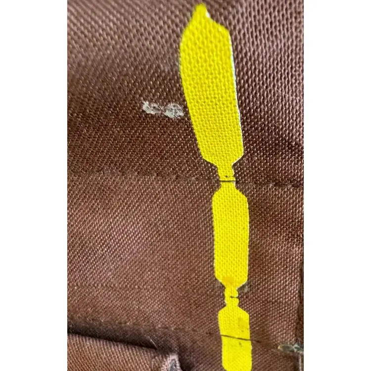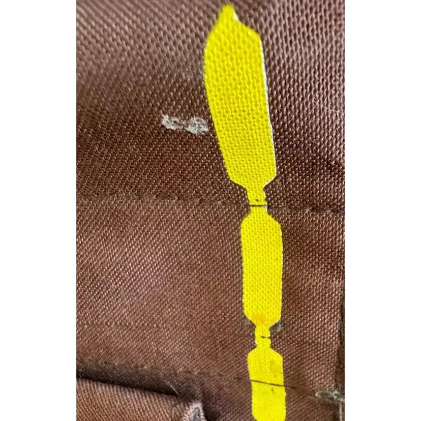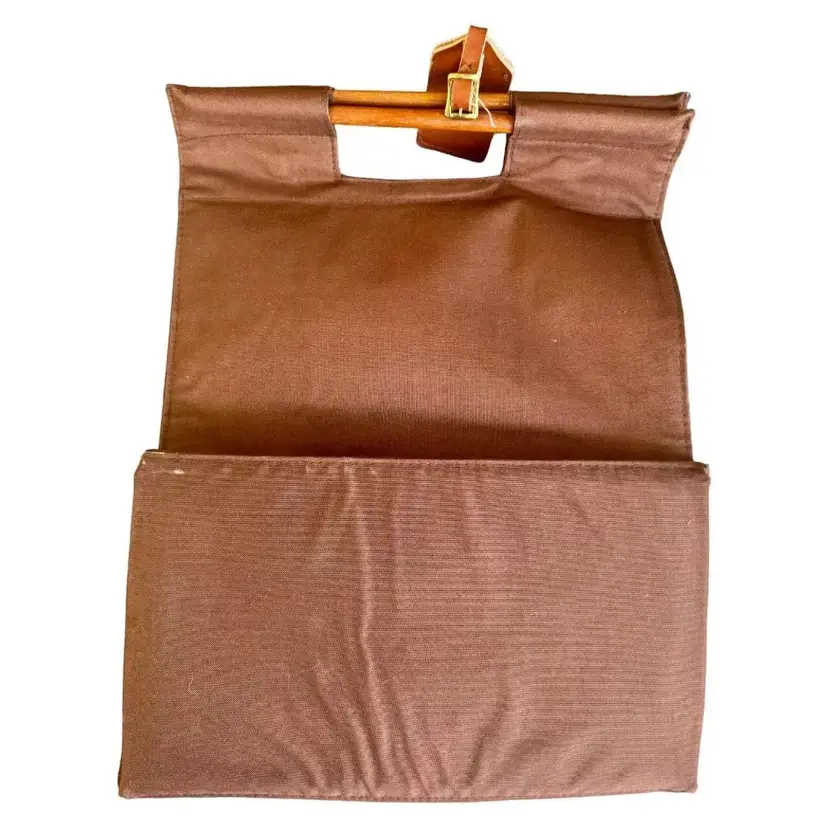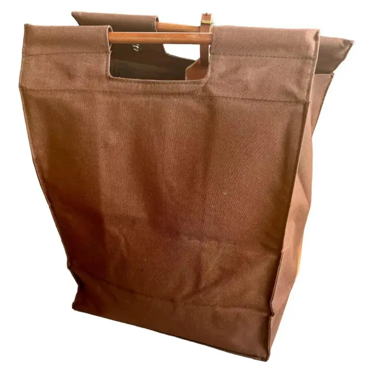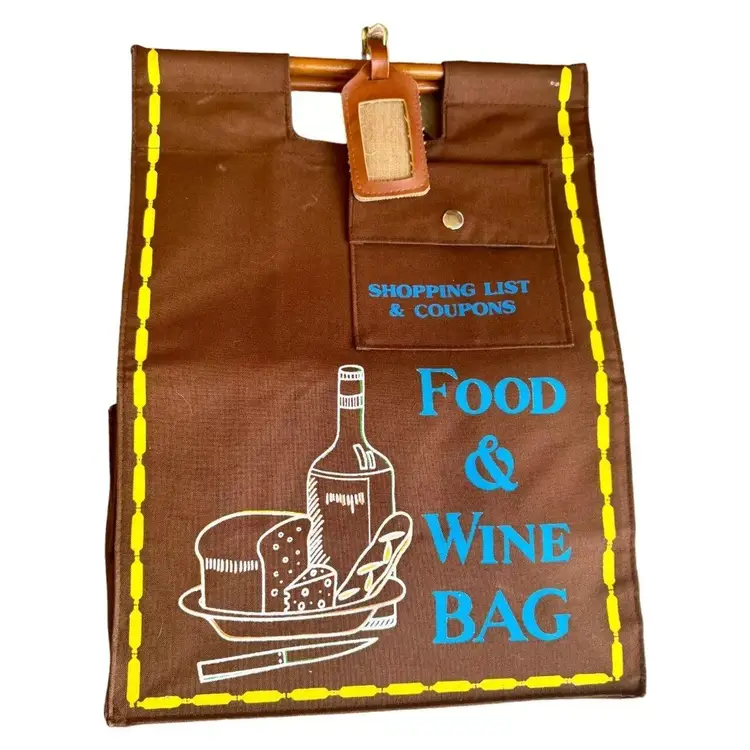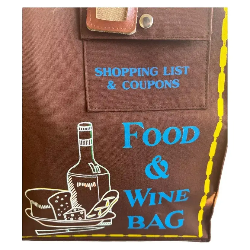 Vintage canvas food and wine tote with wooden handles and snap closure on the top. Has adorable leather luggage tag as well. Even has a compartment on the front for your shopping list and coupons! Approximately 17" tall and 13" wide. Nice size for a tote and well made.