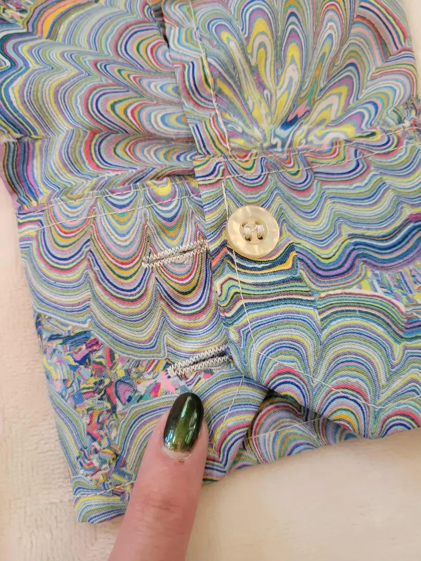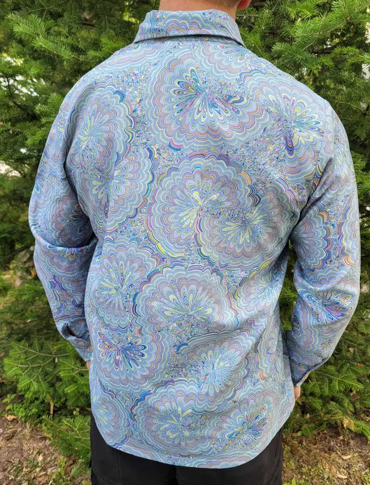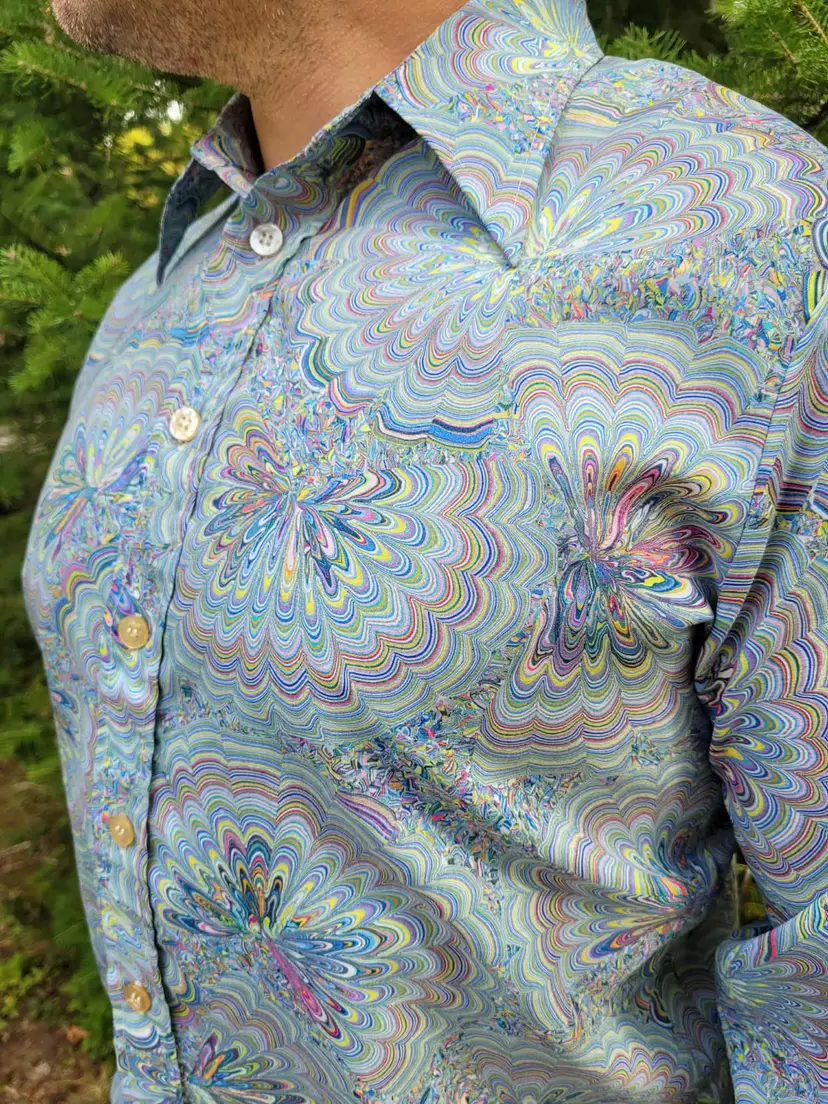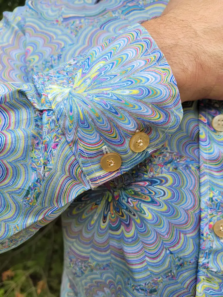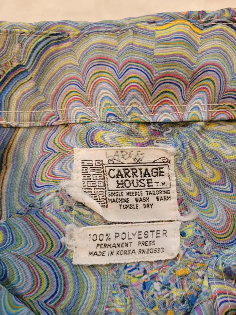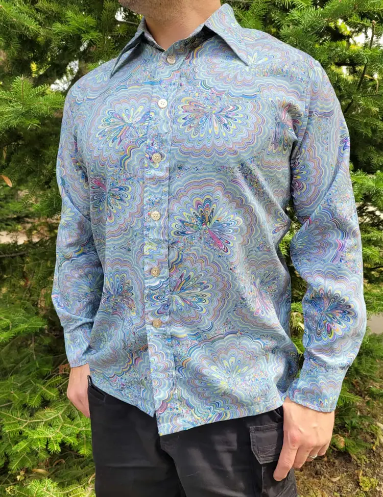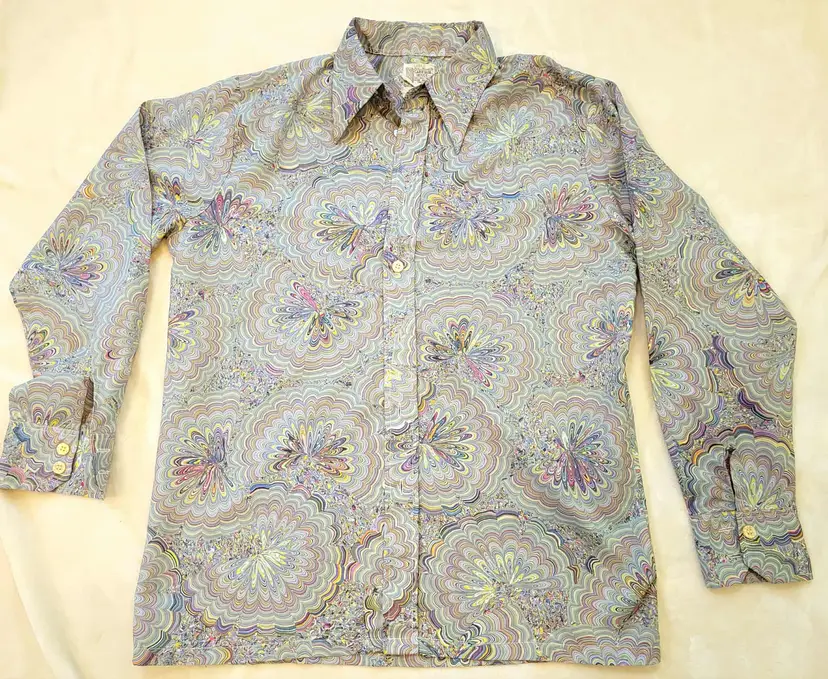 Groovy kaleidoscope-pattern colorful fitted men's button down! This is in good condition from an estate, with the only flaw being a missing button on the sleeve that I've pointed out in pictures. Please see pictures for details and see measurements below to ensure it'll fit you before purchasing.