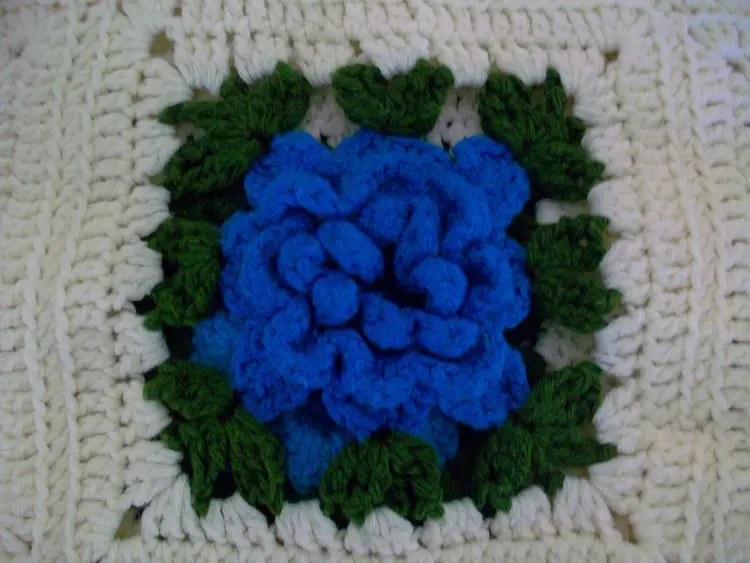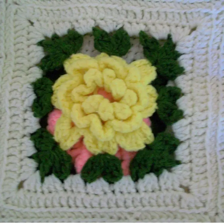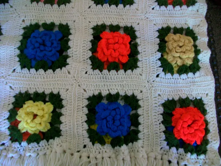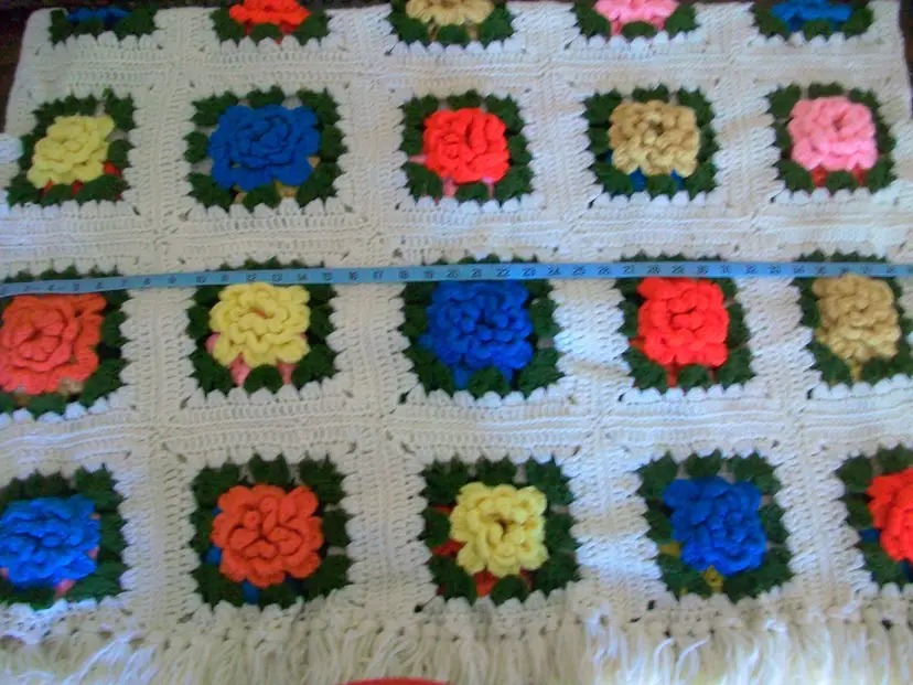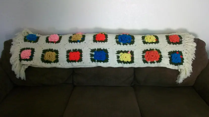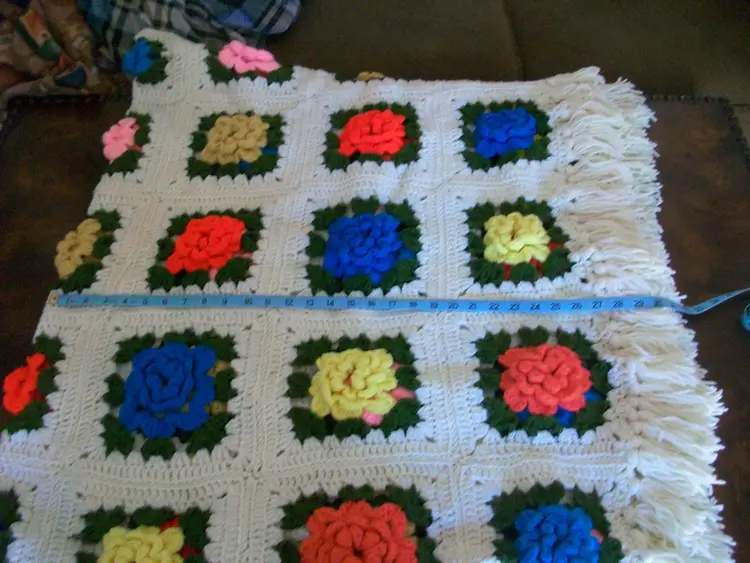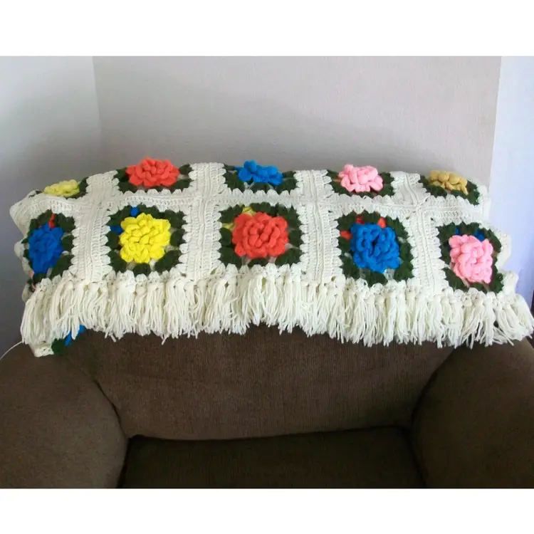 hand crochet 3D rose Flowers granny squares Pink, turquoise, gold, Yellow, Cream white very little noticeable pilling approx. 42" x 72" machine washable, tumble dry low