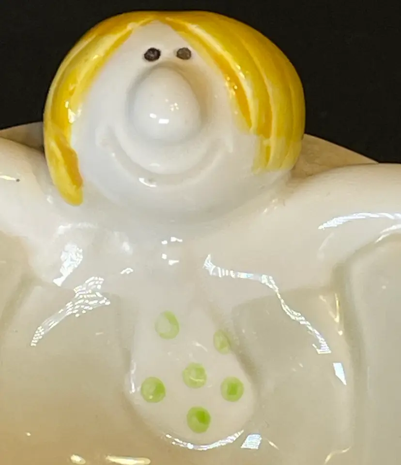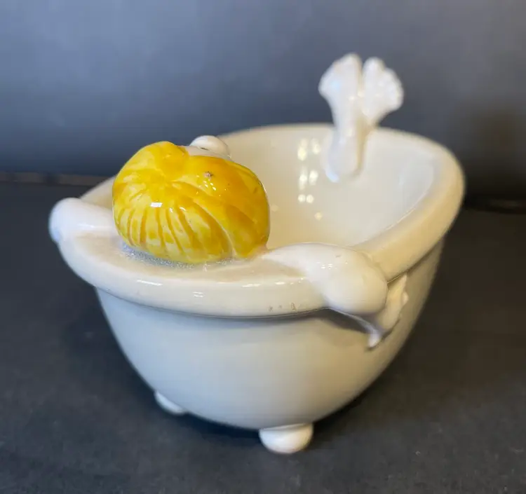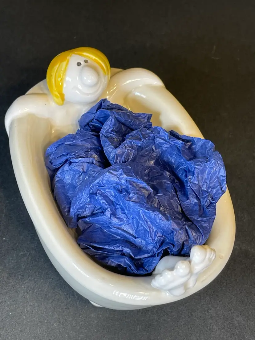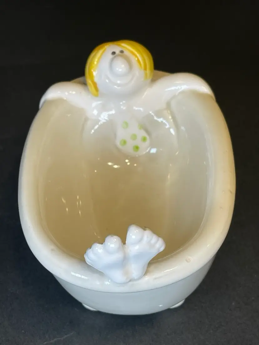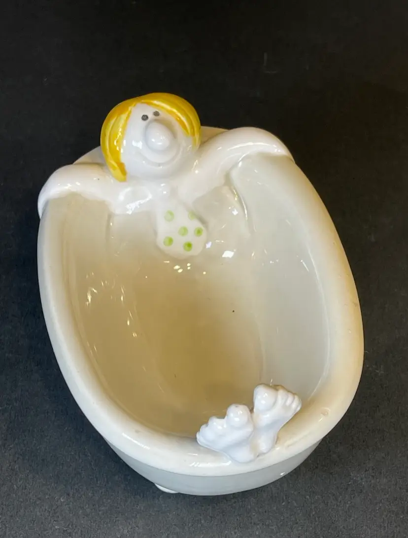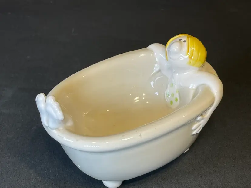 How does any man in the 70s unwind after a day at the office? He takes a bath, of course! In fact, he can’t even take off his tie before he sinks down into his relaxing nightly ritual! Made by Fitz and Floyd, this piece is simply adorable. It’s made of ceramic and is waiting to delight all you bathroom visitors. It’s in great condition with no cracks or scratches. Please see photos for more conditional details.