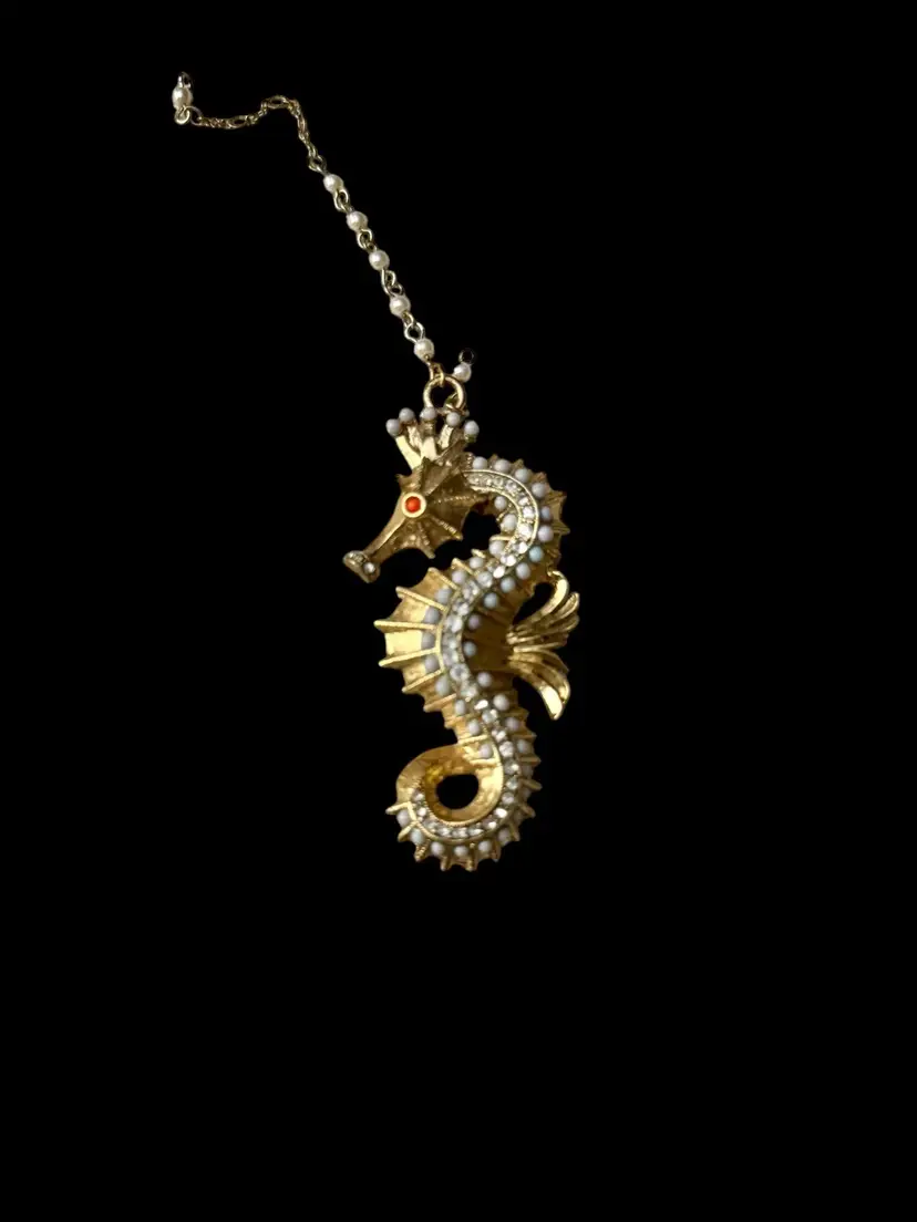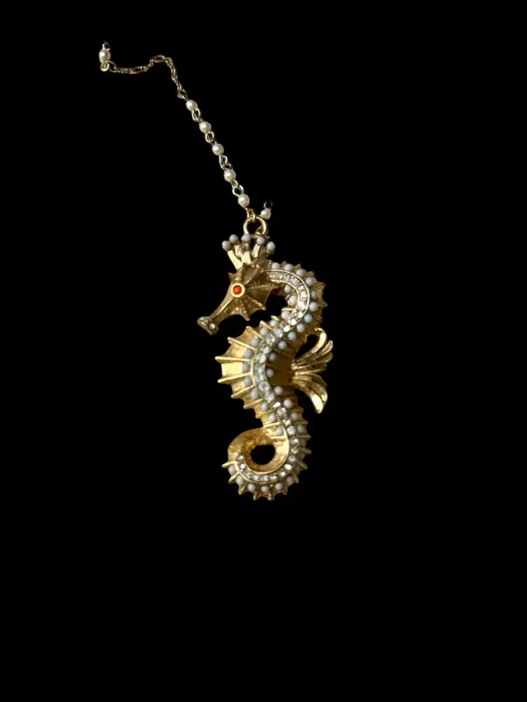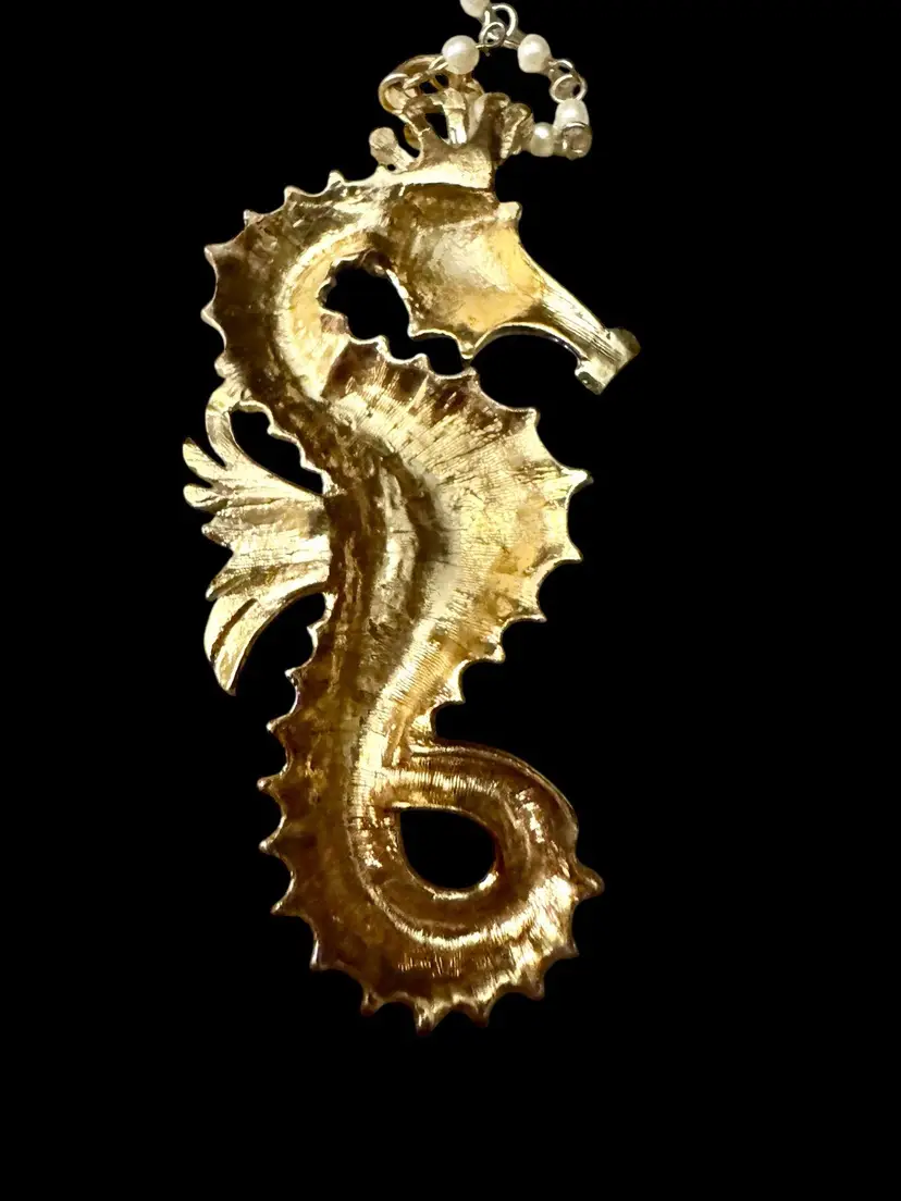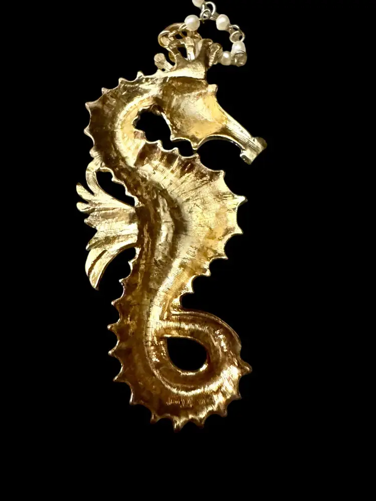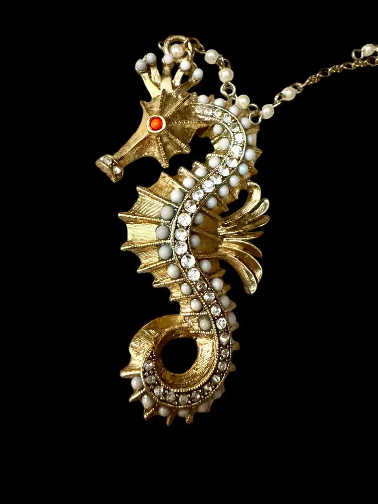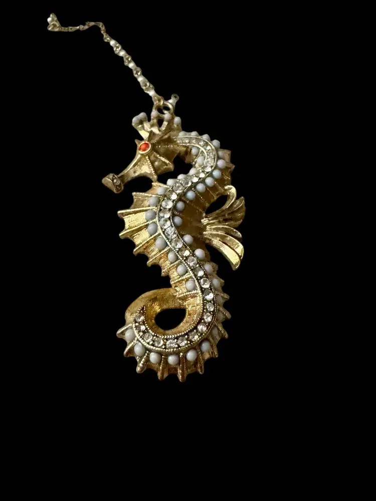 Vintage Hattie Carnegie Seahorse Pendant Necklace. Set in antiqued stamped gold metal. Unsigned Hattie Carnegie book piece. There are two rows of ballotini turquoise beads down the body with a sparkling row of clear crystal rhinestones down the center. The crown is also set with turquoise beads and it has a coral eye. All the stones are in place … Measures 3" by 1 1/2" … the chain is no longer with the necklace just the stunning pendant .. Excellent vintage condition. circa 1960's. No
