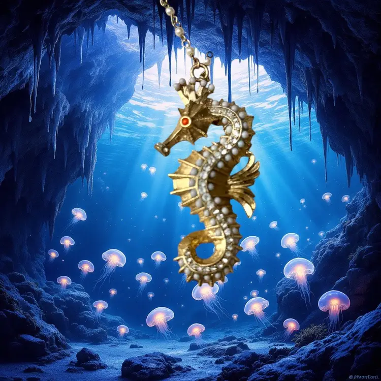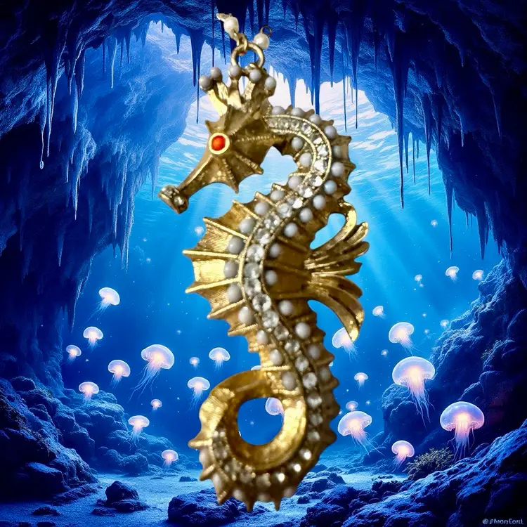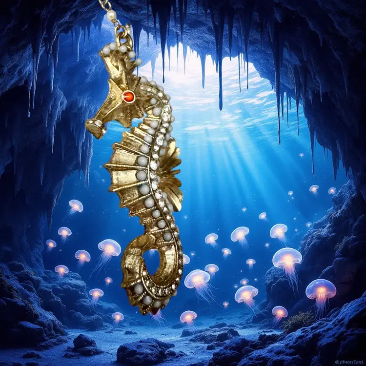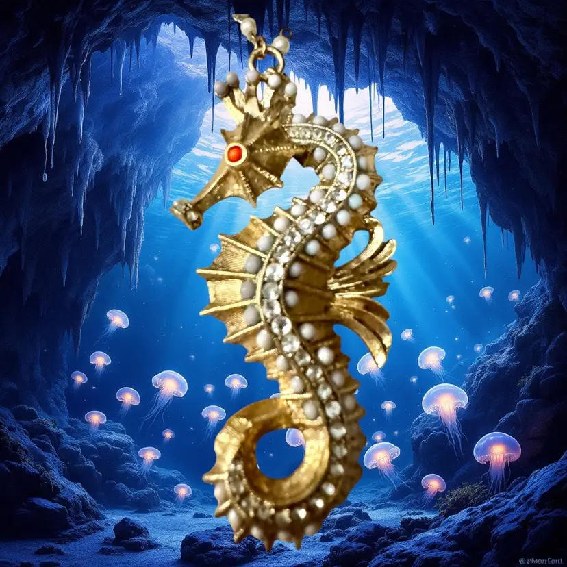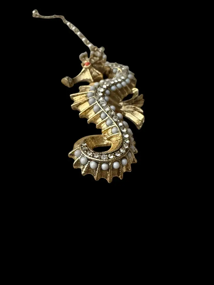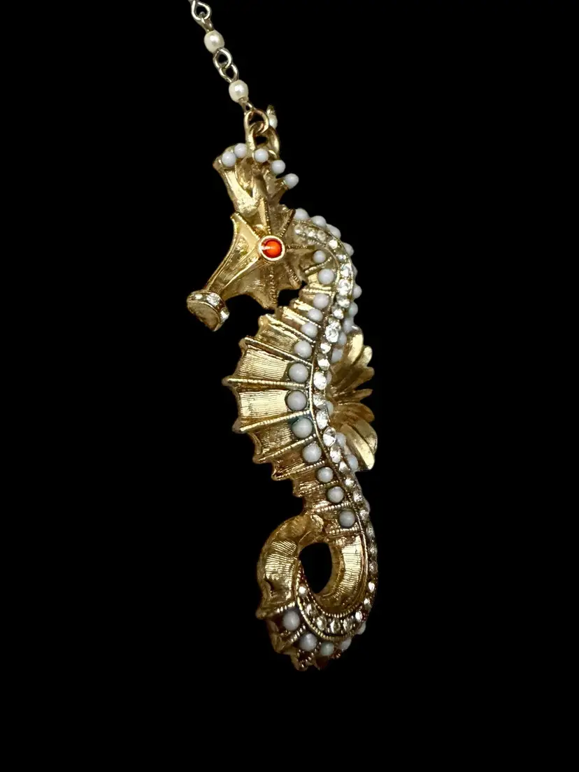 Vintage Hattie Carnegie Seahorse Pendant Necklace. Set in antiqued stamped gold metal. Unsigned Hattie Carnegie book piece. There are two rows of ballotini turquoise beads down the body with a sparkling row of clear crystal rhinestones down the center. The crown is also set with turquoise beads and it has a coral eye. All the stones are in place … Measures 3" by 1 1/2" … the chain is no longer with the necklace just the stunning pendant .. Excellent vintage condition. circa 1960's. No