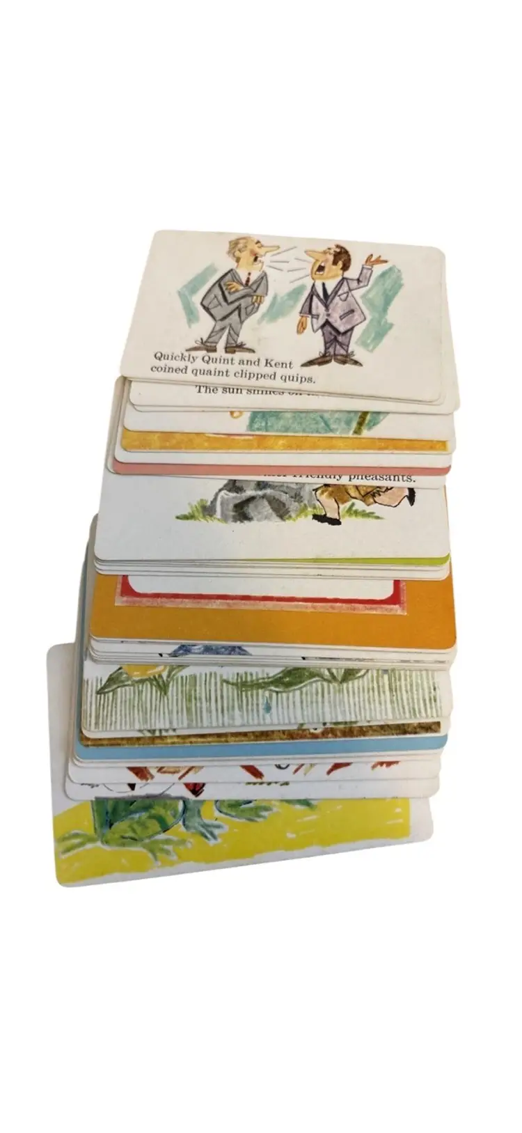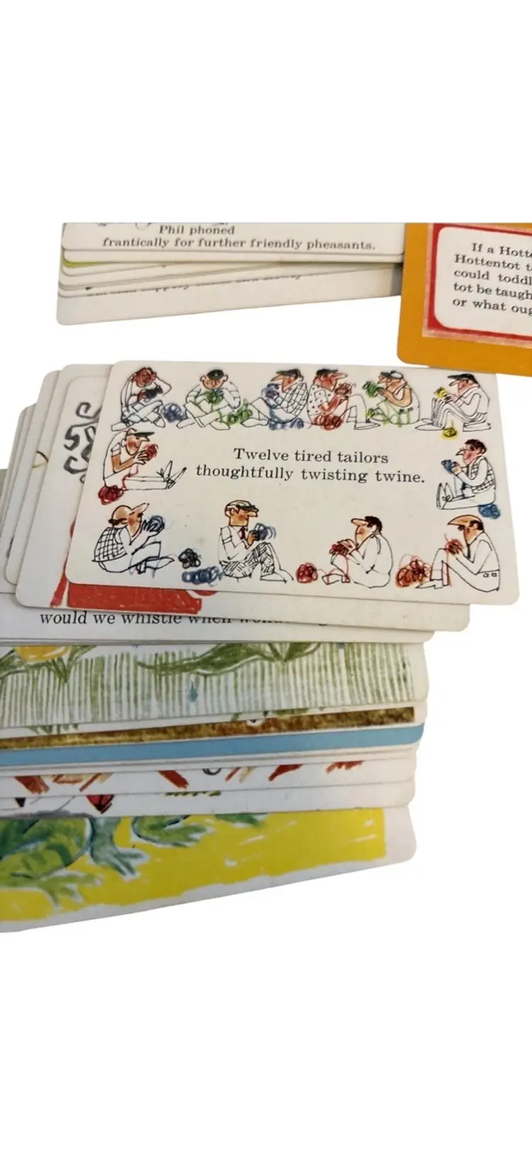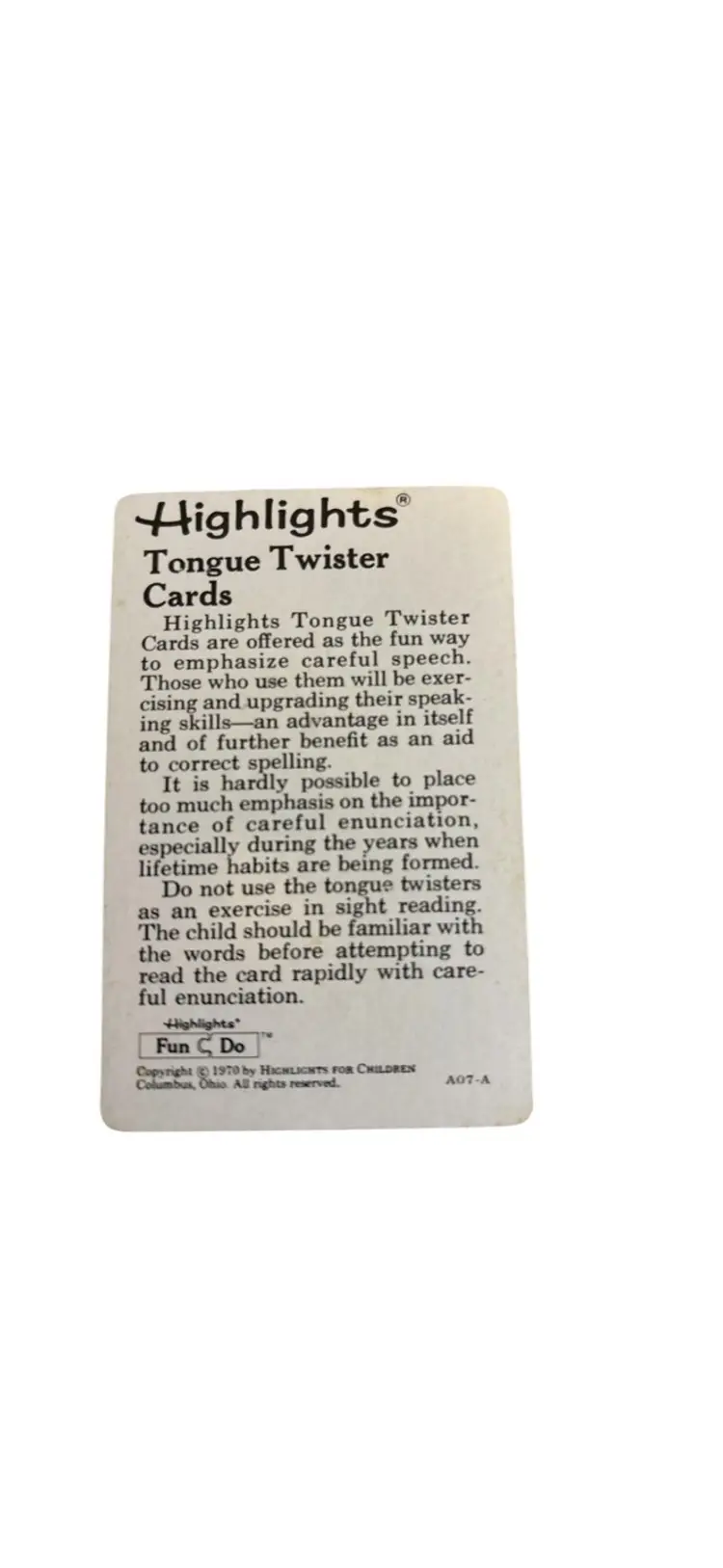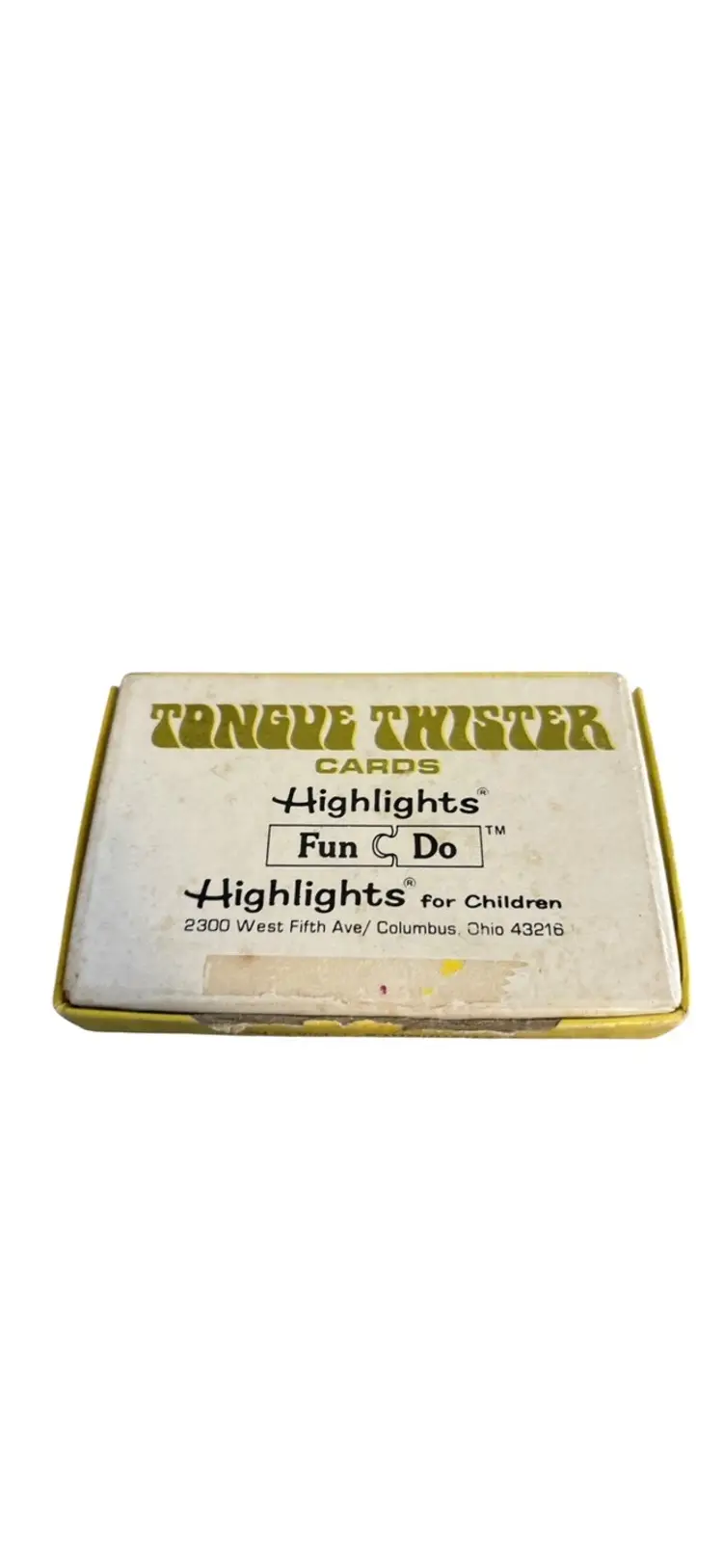 Box of Tongue Twister Cards 1970’s Highlights Fun & Do 1 instruction Card 35 Tongue Twister Cards Box has worn edges but opens and closes easily Cards are in great vintage condition