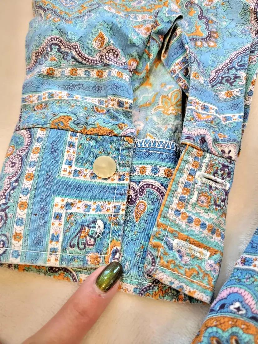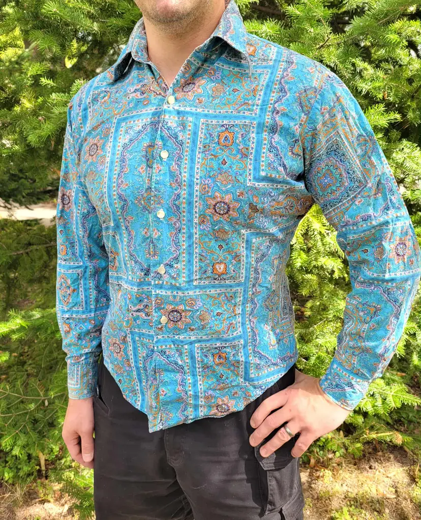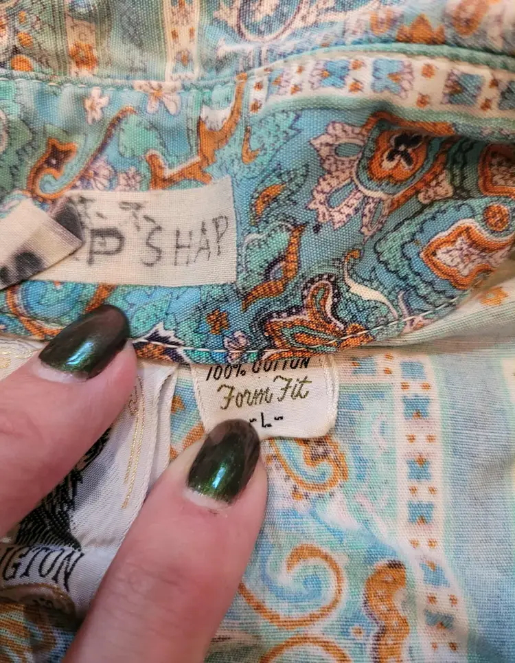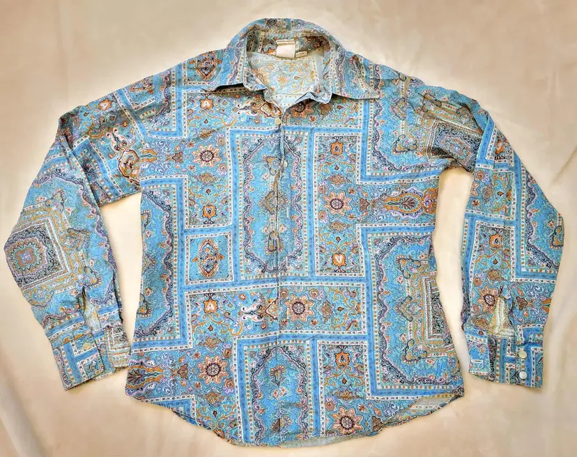 Fantastic colorful fitted men's button down in a classic groovy 1970s paisley print! This is in good condition from an estate, with the only flaw being a missing button on the sleeve that I've pointed out in pictures. It is tagged a vintage men's size large but it fits more closely to a modern size medium; please see pictures for details and see measurements below to ensure it'll fit you before purchasing.