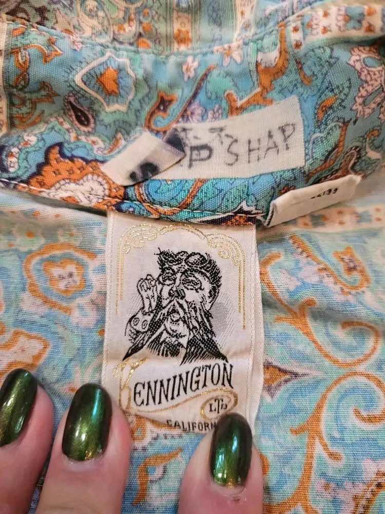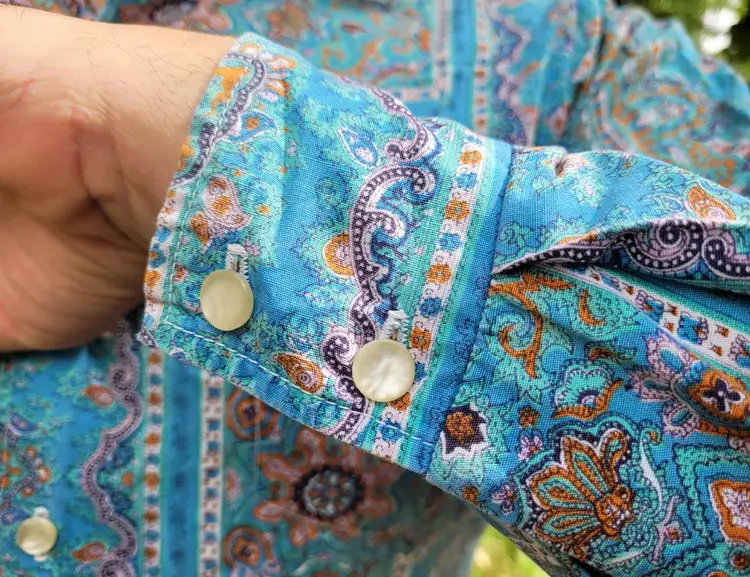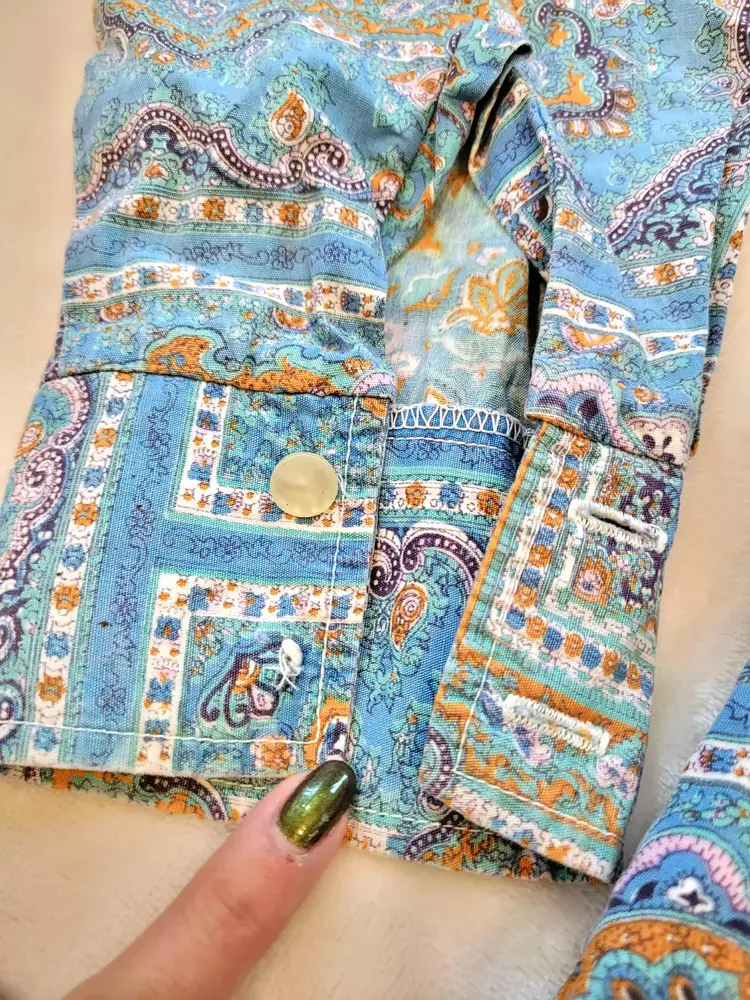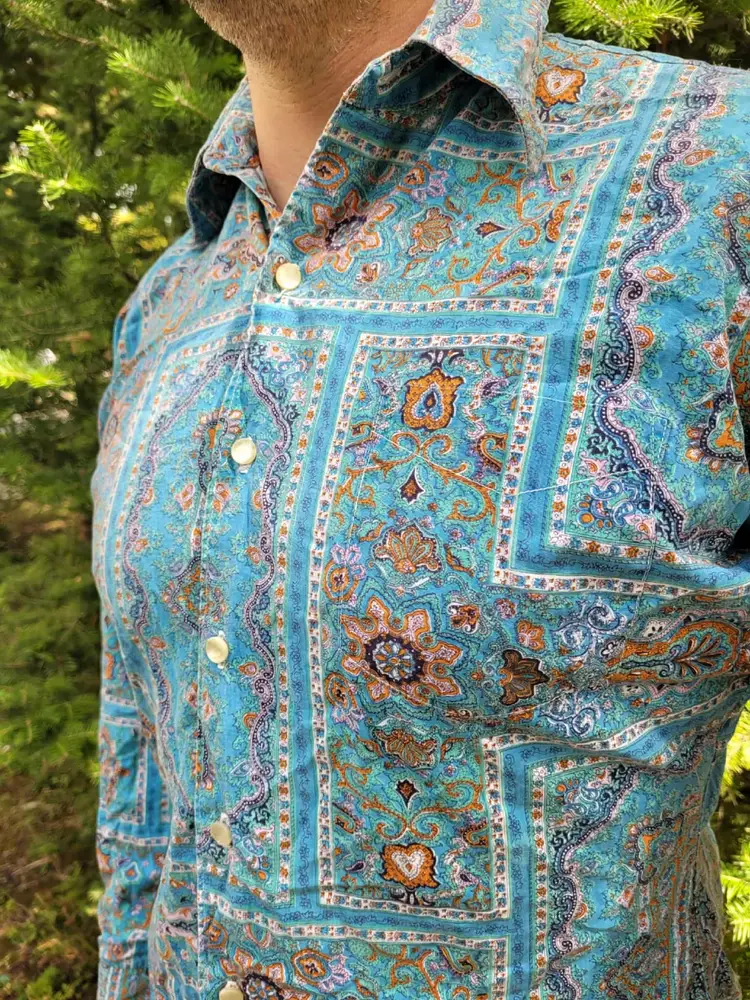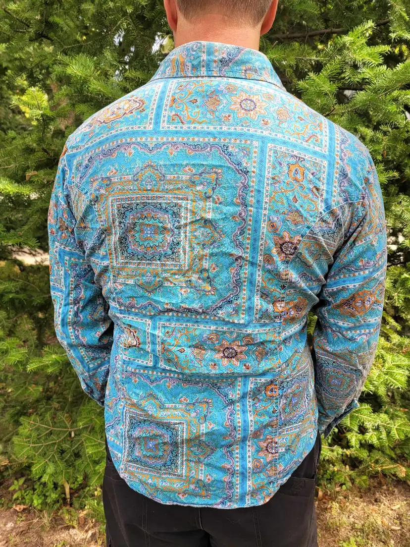 Fantastic colorful fitted men's button down in a classic groovy 1970s paisley print! This is in good condition from an estate, with the only flaw being a missing button on the sleeve that I've pointed out in pictures. It is tagged a vintage men's size large but it fits more closely to a modern size medium; please see pictures for details and see measurements below to ensure it'll fit you before purchasing.