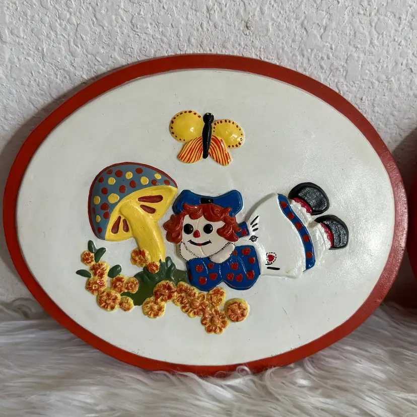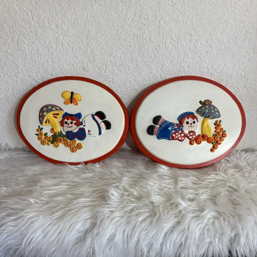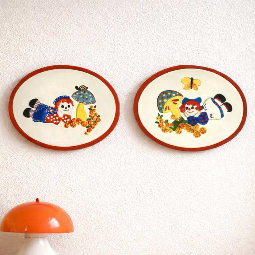 In excellent pre loved condition with no cracks. There is some light black discolor lines on each oval as seen in pics. I tried to use some cleaning wipes but it may just need to be re painted over. Do not know what the lines are from. They feel ceramic but may be chalkware. The backing is a red felt. There is no hooks on the backs. They come together as a pair. They measure approx. 10.5” length and 8.5” Width.