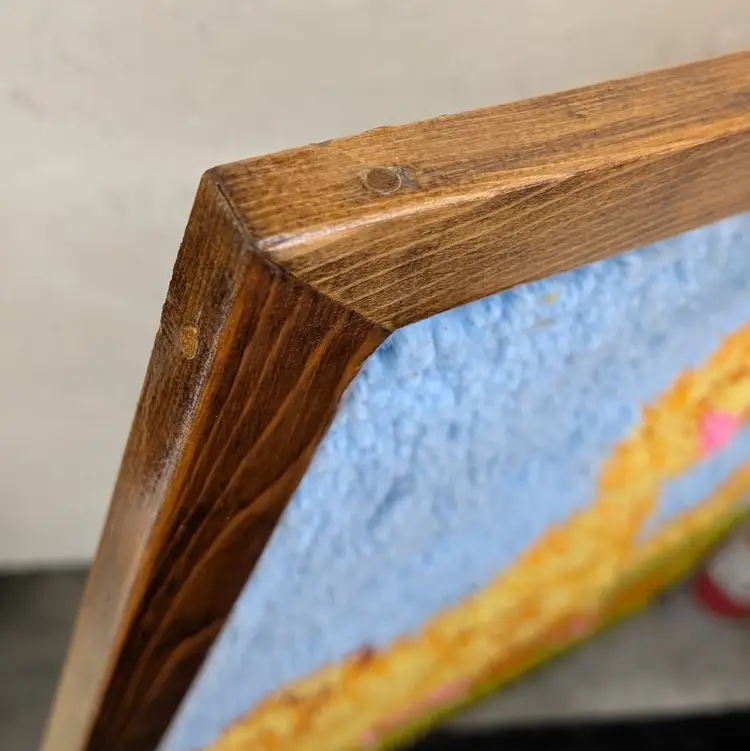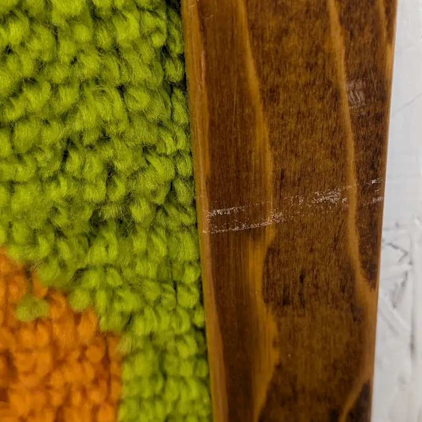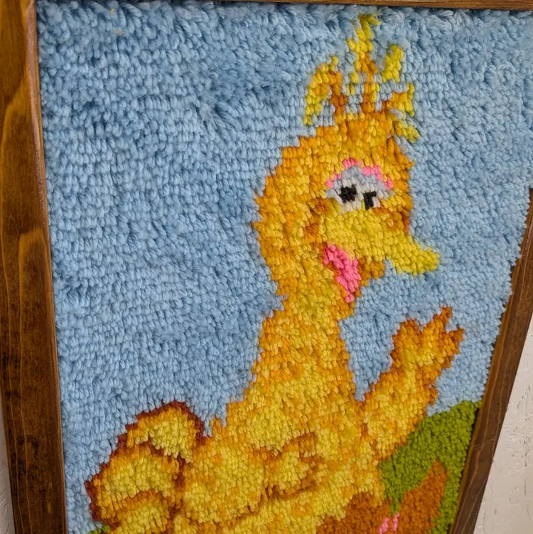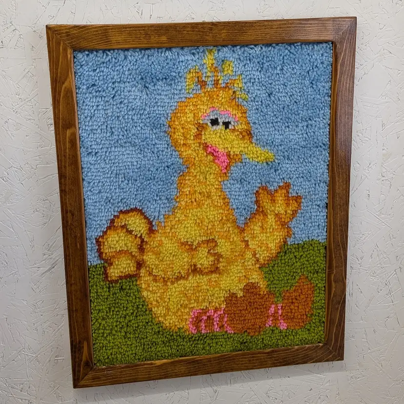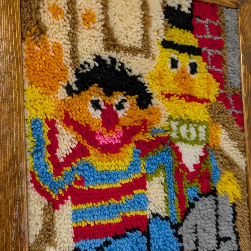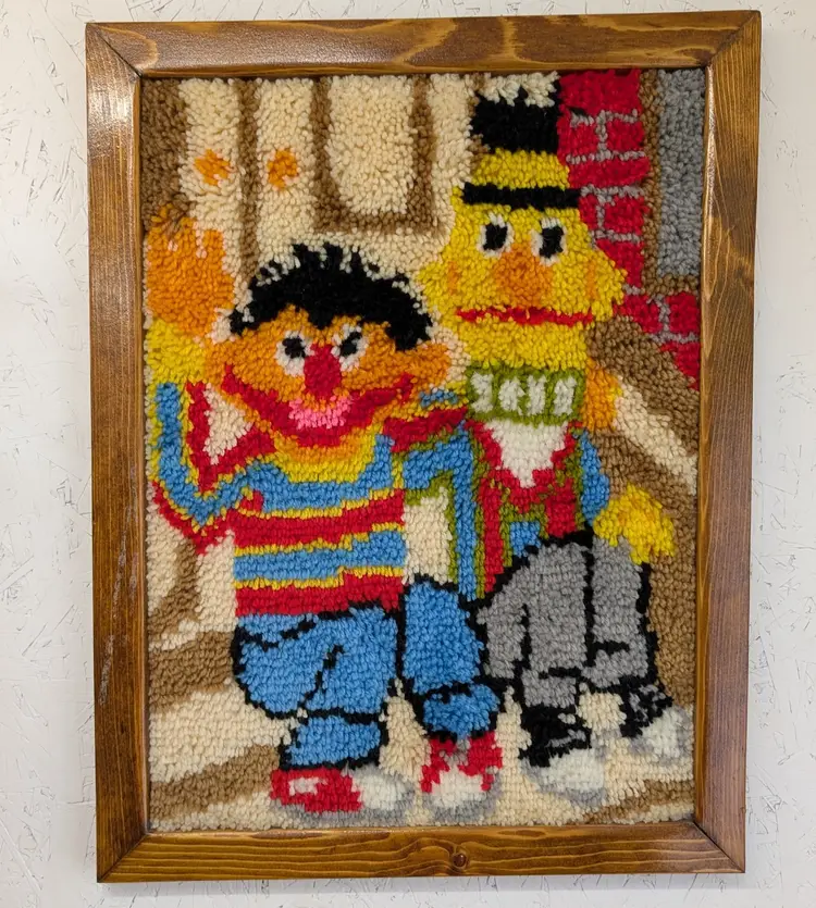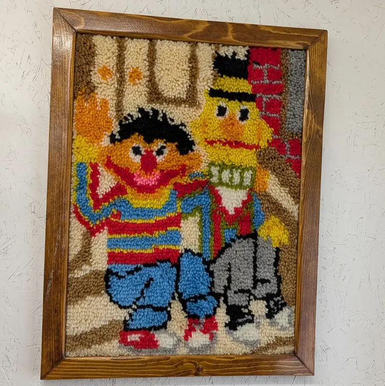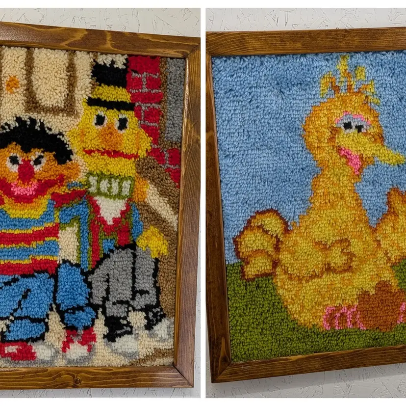 A set of 2 completed Vogart Crafts latch hook kits from the 1970's. They are complete, nicely framed in homemade wood frames and backed with cardboard ready to hang on your wall or nursery. In nice, used condition with some old tape residue on the frames that could be cleaned off and minor marks on the yarn (see pictures). Measurements ~ Bert & Ernie: 20.5 x 26.5, Big Bird: 21 x 27"