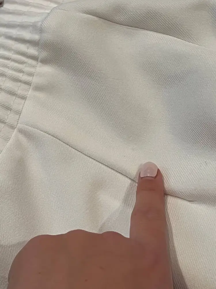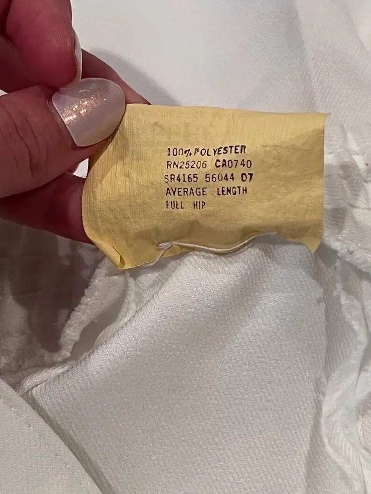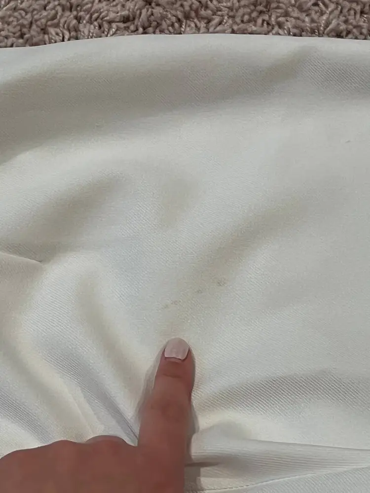 Great preowned condition. A couple of pulled threads on seat. Small untreated stain. Elastic still has some stretch The top half of the pants are NOT discolored. This is just lighting.