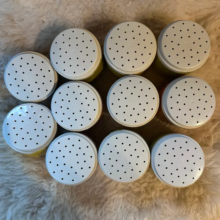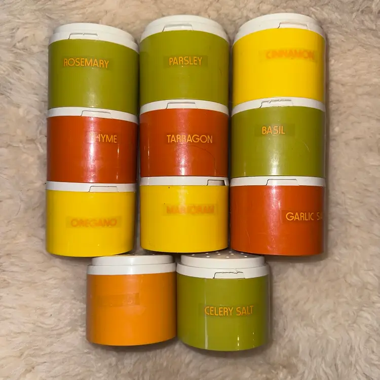 Vintage 70s Tupperware #1308 Harvest Stacking Spice Shakers Set Of 11. 3 Each Yellow, 4 Each Avacado Green, 3 each Dark Orange and 1 Each light Orange. Made in Great Britain. Shakers Do Have Stickers on All But 1 and Are removable. Smoke Free Home. #stackingspiceshakers #vintagetupperware #tupperware #spicecontainers #retro #mcm #1970s