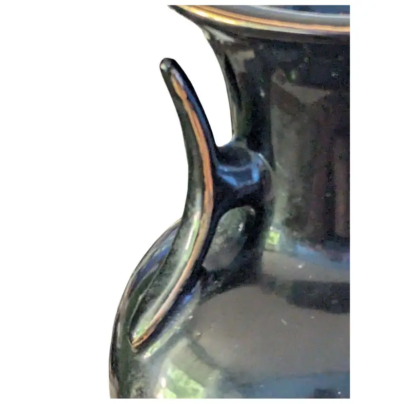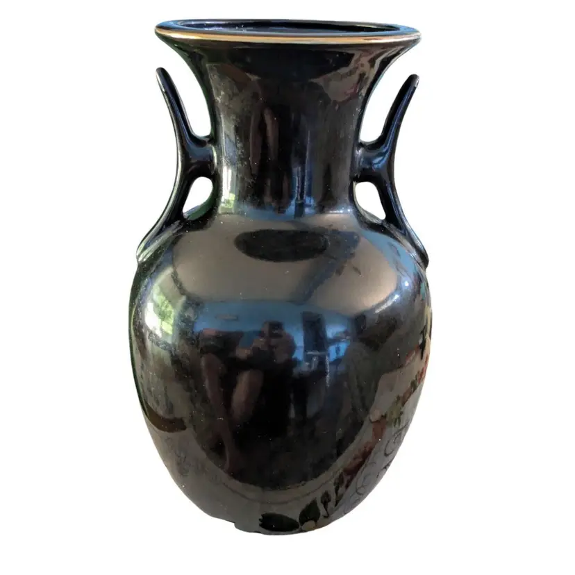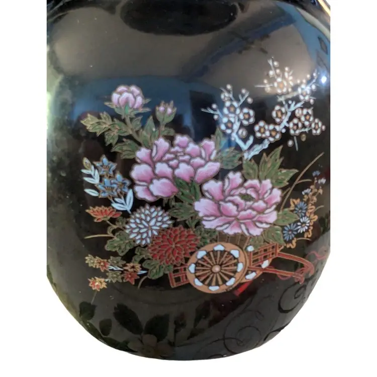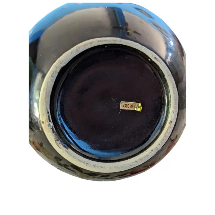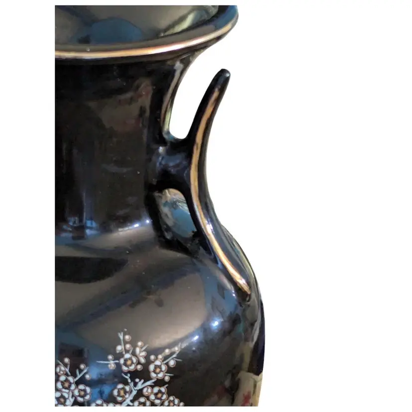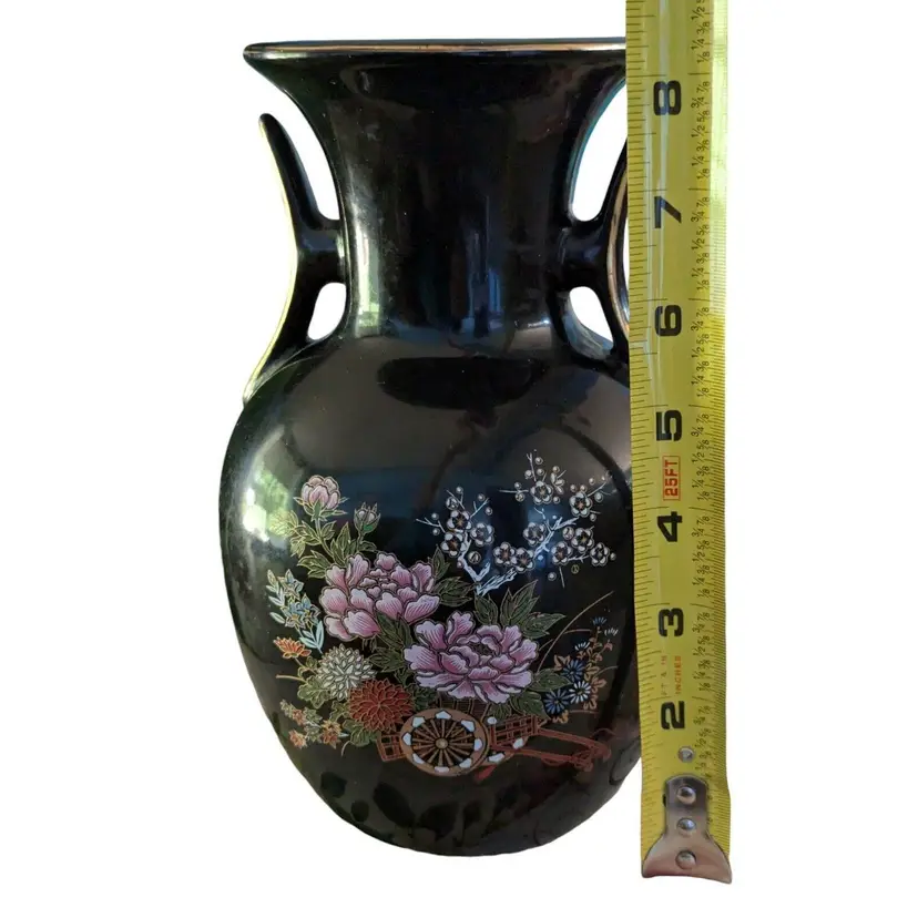 This vintage ceramic vase with a glossy black finish is a beautiful addition to any home decor. The intricate hand-painted floral design from Taiwan's Asian culture makes it a unique piece that stands out in any setting. Measuring 8.25 inches in height, this large vase is perfect for all occasions and adds a touch of elegance to any room.