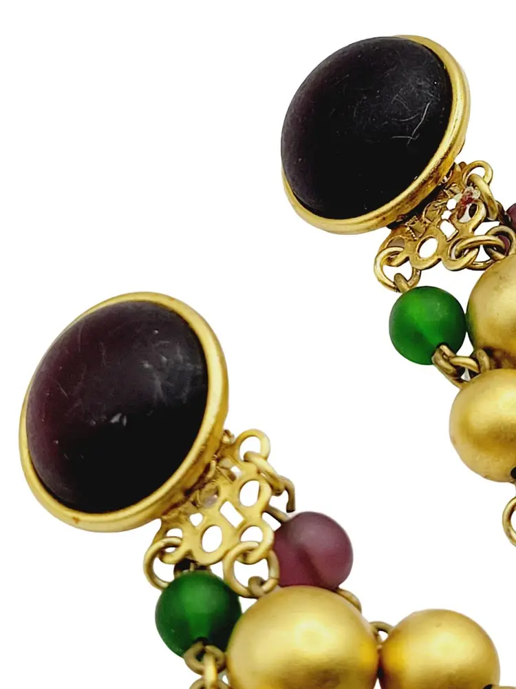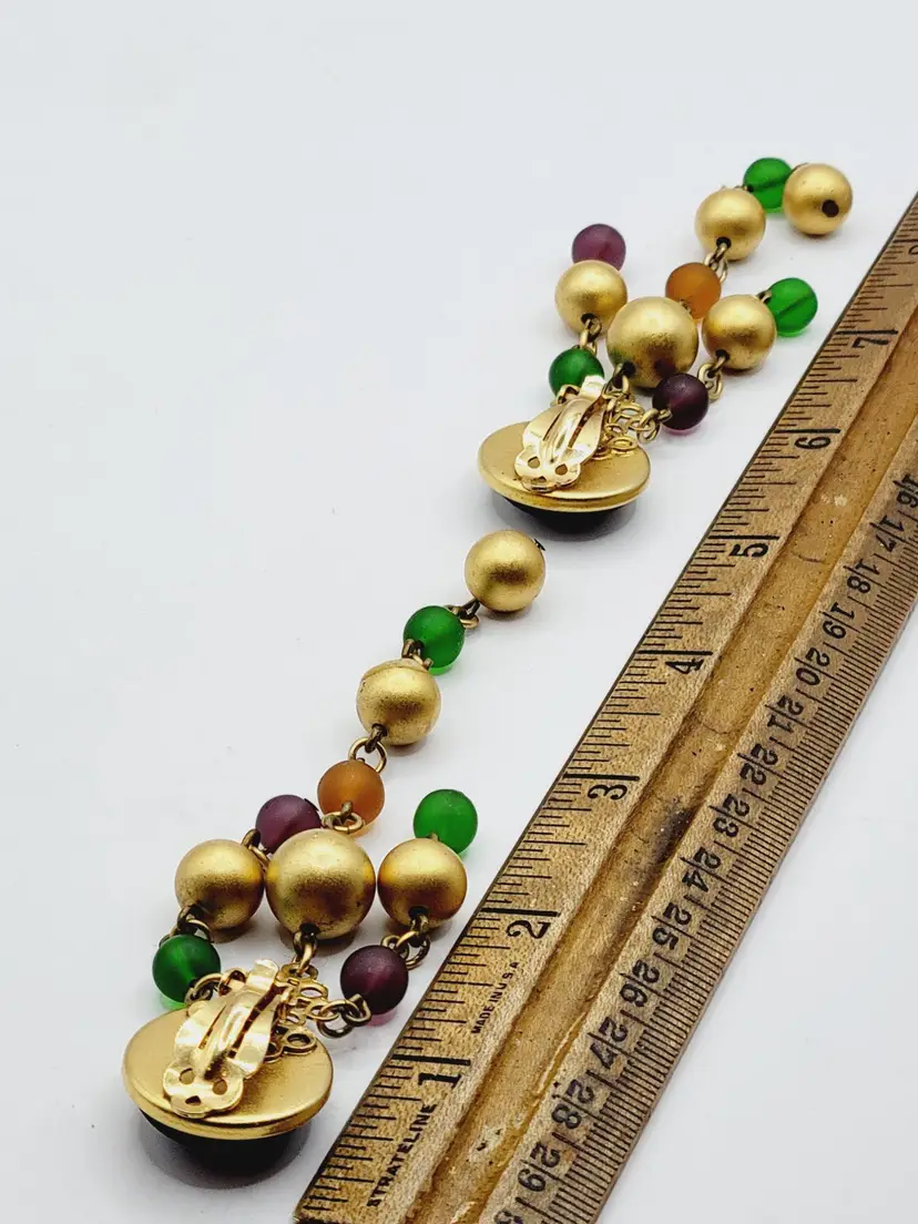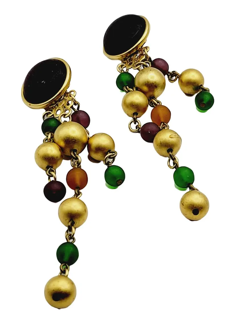 These earrings feature a black glass cab set in gold-plated metal with dangling round glass beads in gold, green, orange and purple color. This piece is well made and has a nice quality. There are few scratches on glass cab.