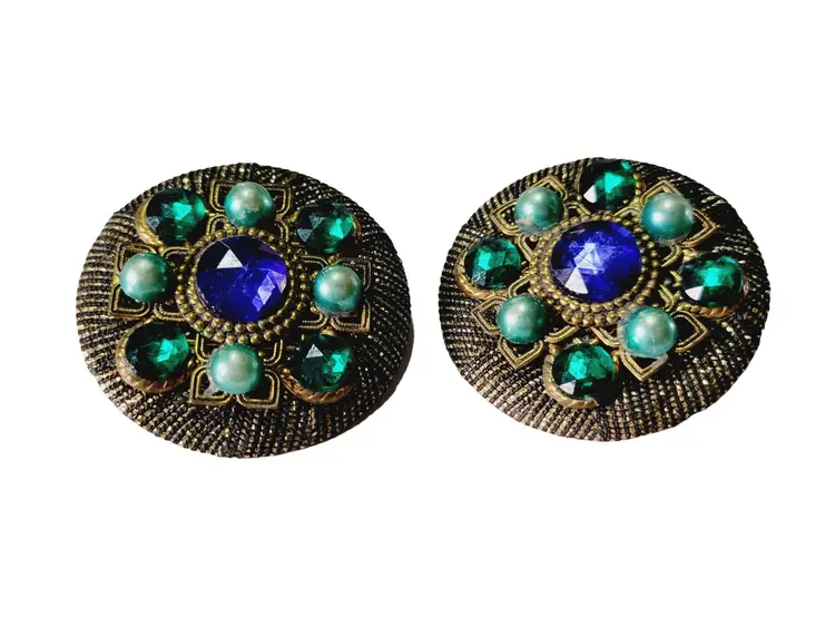 These earrings are wrapped in fabric highlighted with acrylic stones. Blue stones in the center, surrounded by green stones and faux pearls.