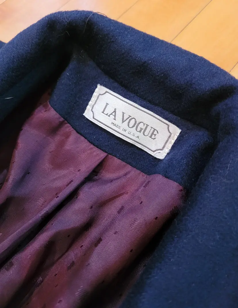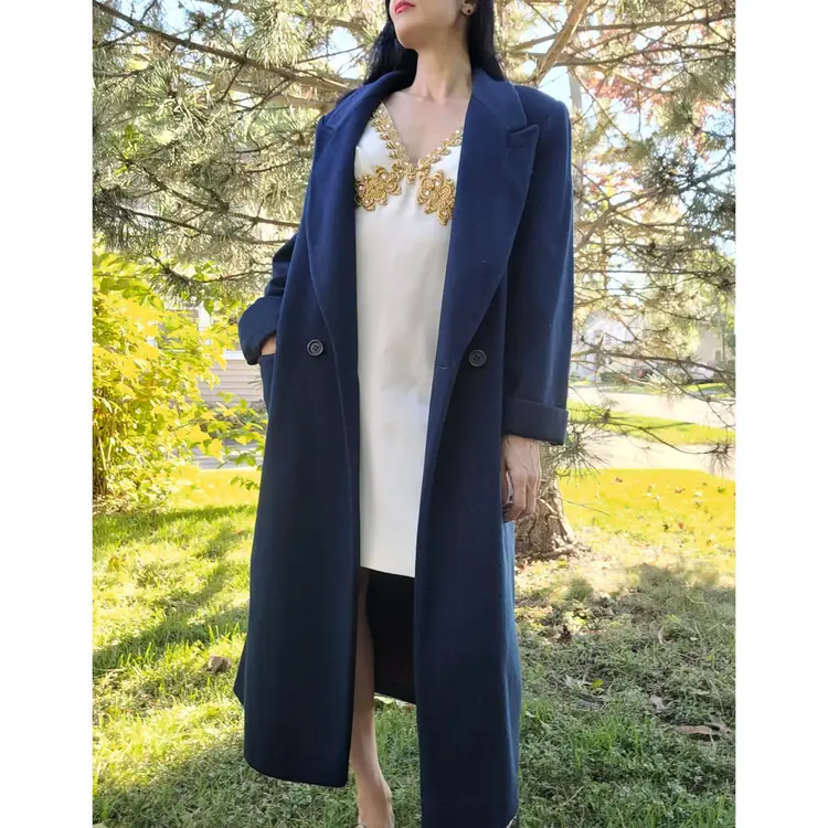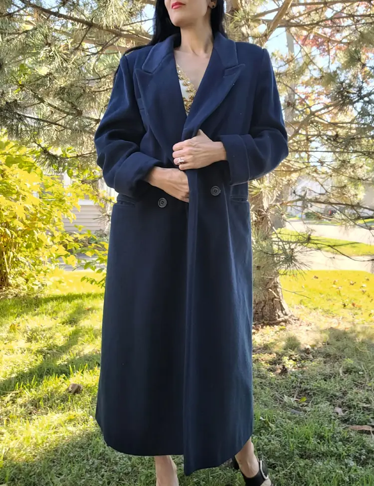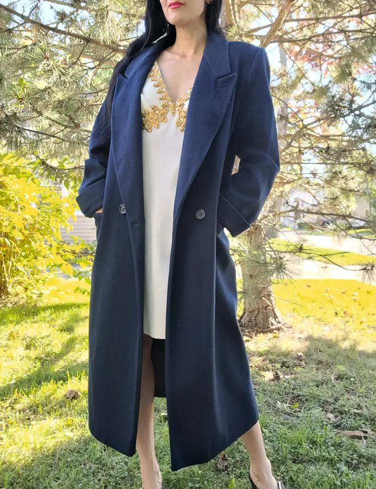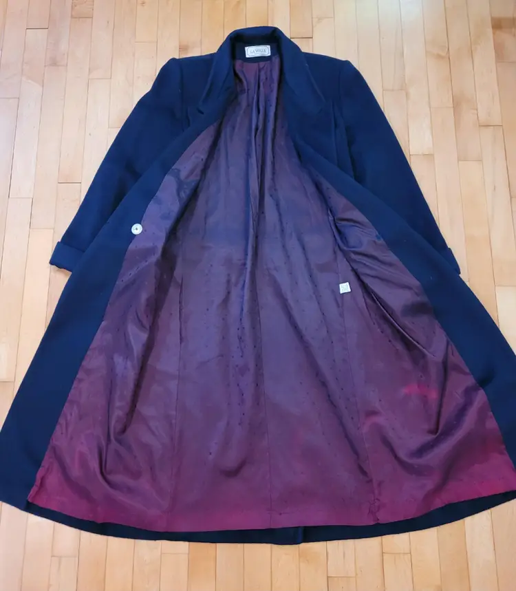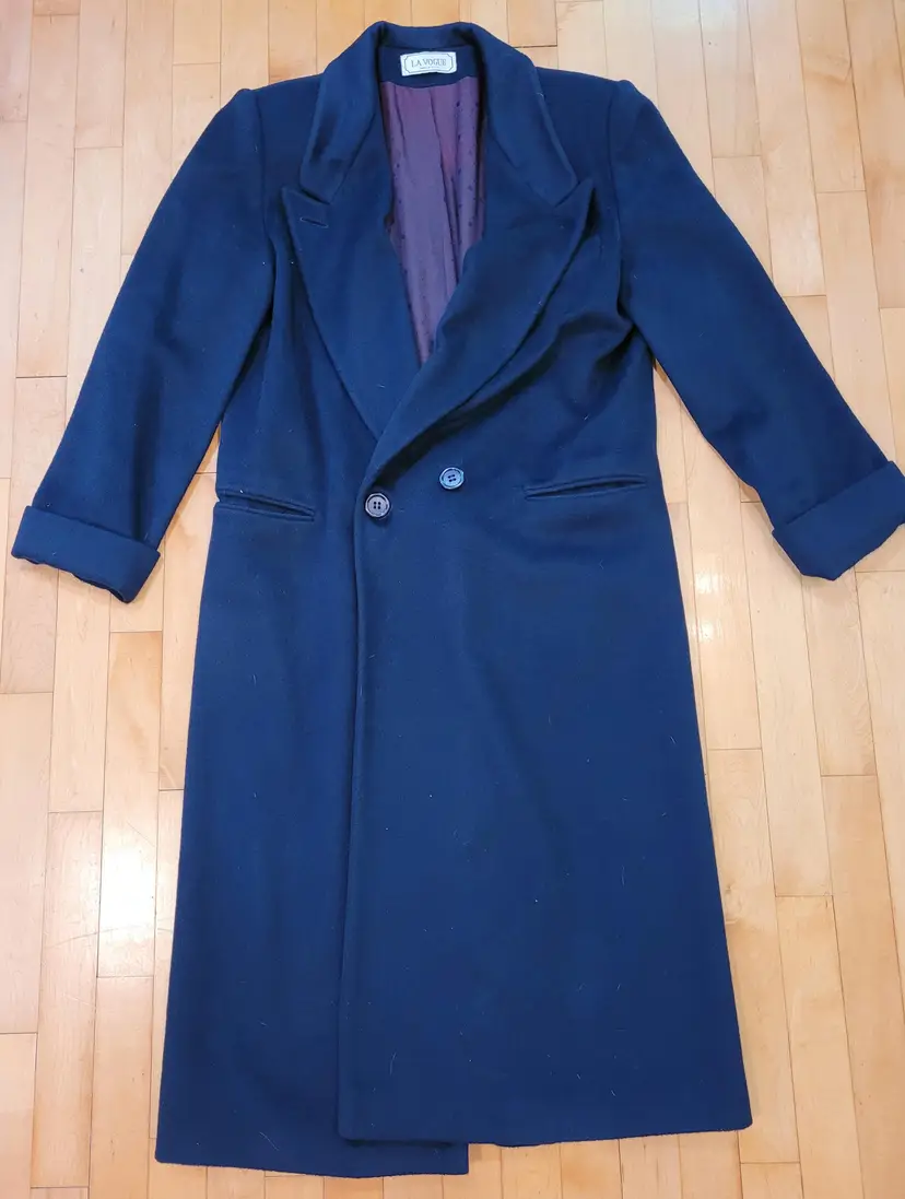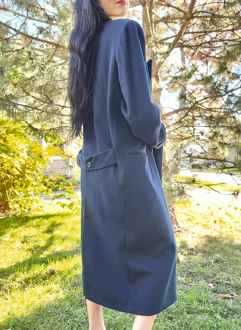Classic 1980s wool winter coat in a pretty deep navy blue color. It's in good condition with the only flaw i could see being some discoloration of the inner lining towards the bottom. (Kind of a cool ombre effect!) Model is a modern size small and it seems to fit more like a medium or large. Please see pictures for details and measurements below to ensure it'll fit you before purchasing.